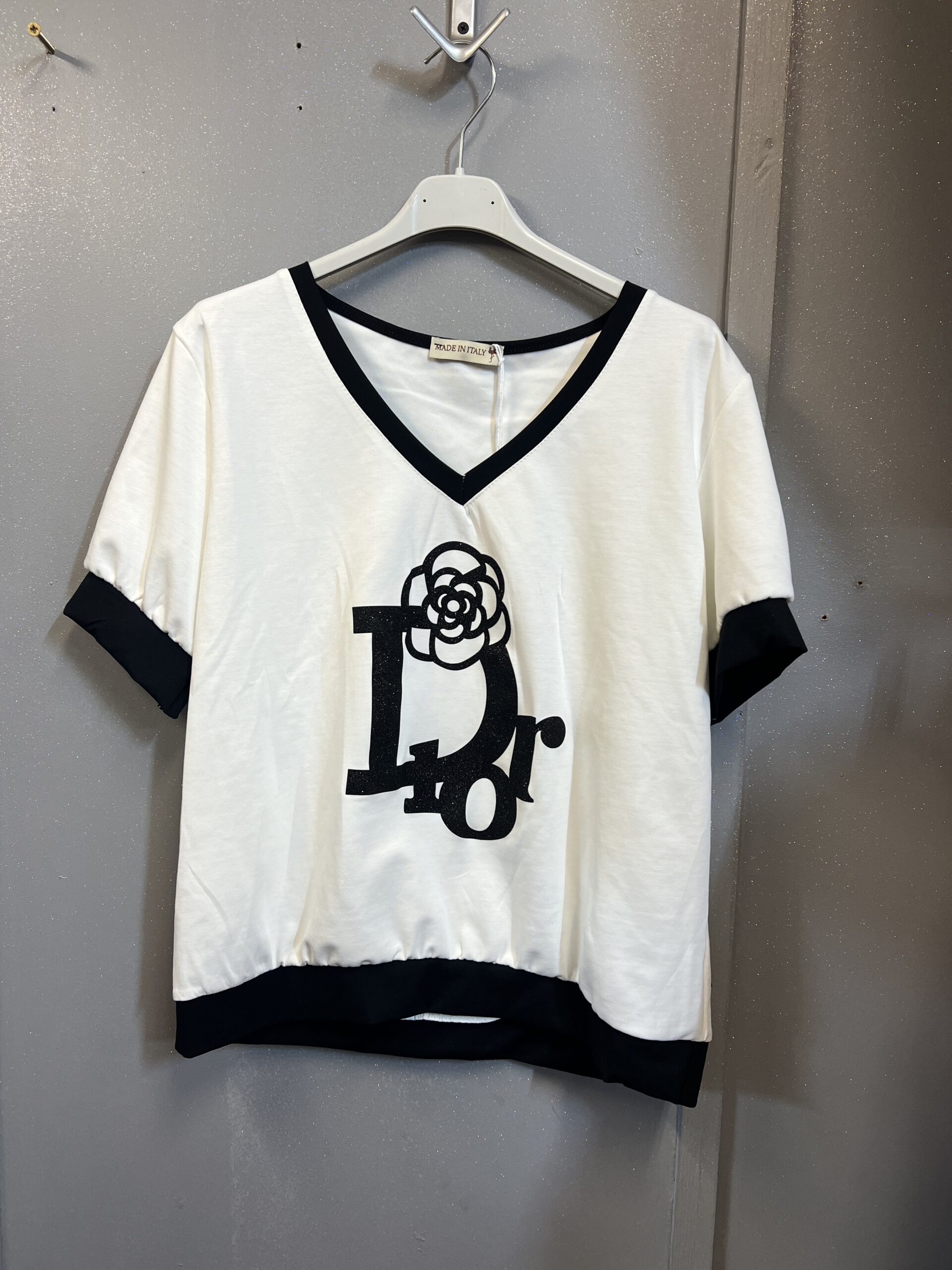 Bluzka biała z dodatkiem materiału w kolorze czarnym na przodzie wzór Dior wraz z kwiatkiem, pod szyja krój w serek z lamówką czarną oraz zakończone rękawki w tym samym materiale czerni. Bluzka zwiewna wygodna i idealnie pasuje do żakietu oraz spodni tej samej serii zamieszonych na naszej stronie. Sprawdzi się świetnie na co dzień do pracy. Styl sportowy i elegancki.