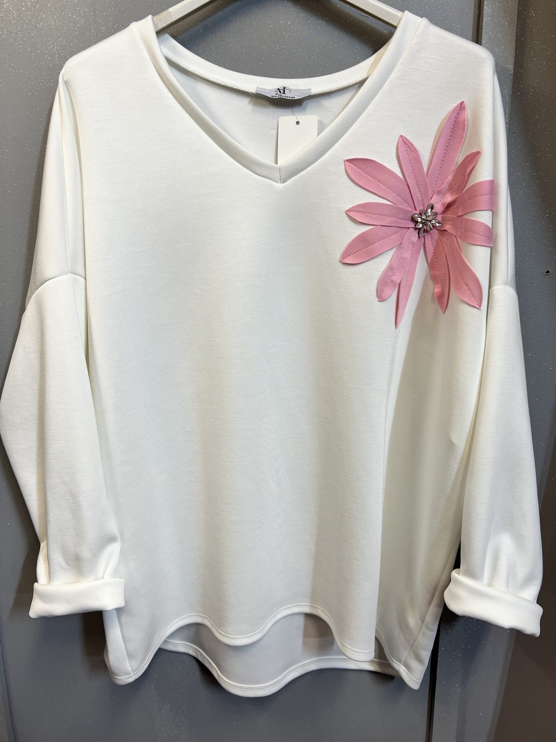 Bluzka z długim rękawem w ponadczasowym kolorze bieli , z materiału masełko. Przód zdobiony dużym ,naszywanym , różowym kwiatem po lewej stronie i świecących w nim cyrkonii ,oraz wycięcie w serek , tył całkowicie gładki. Świetnie sprawdzi się do spodni dresowych , eleganckich oraz spódnic.