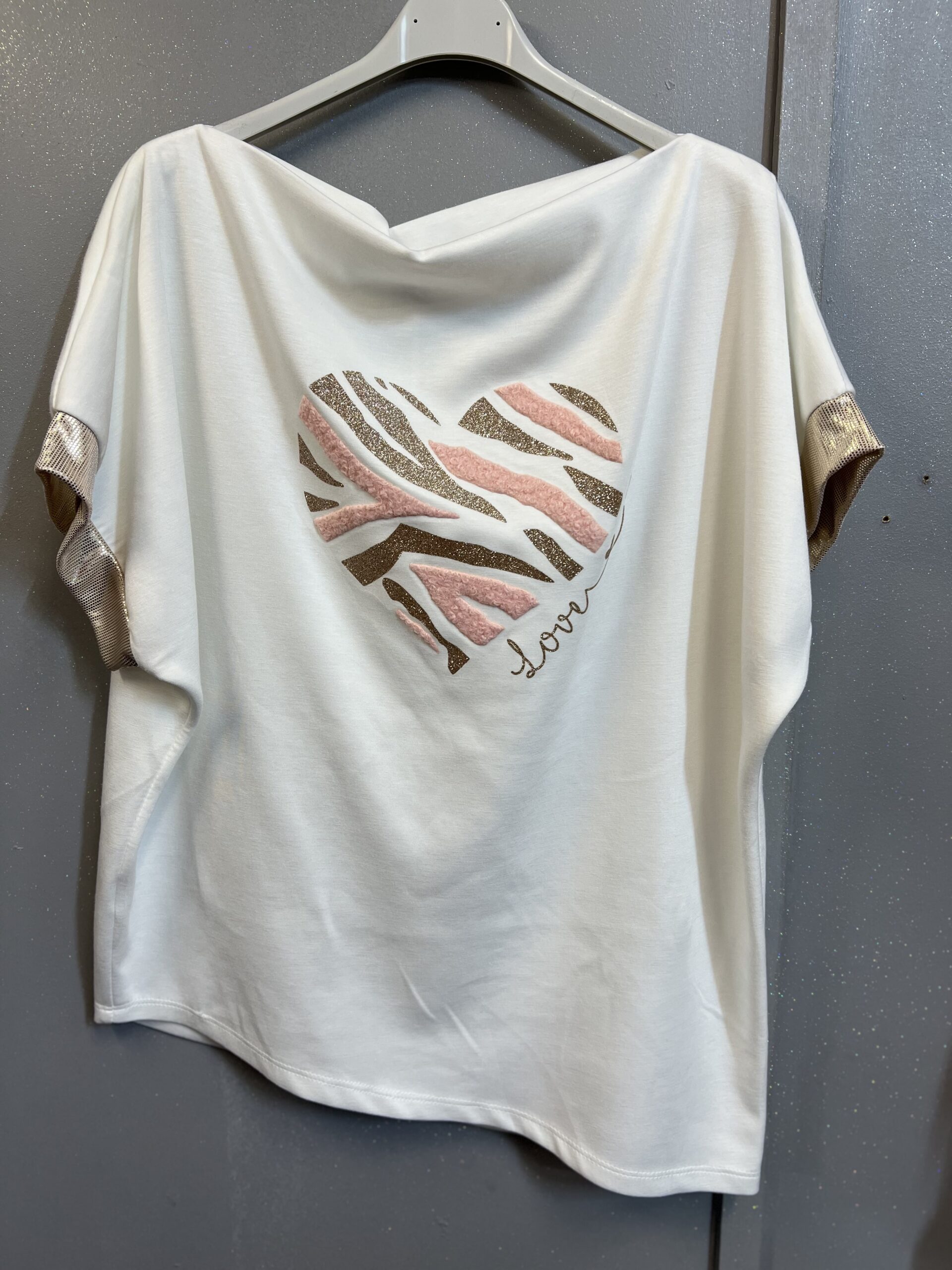 Bluzka masełko w klasycznym białym kolorze. Pod szyją krój delikatnej w łódki. Rękawki zakończone doszywanym , prążkowanym materiałem w złotym kolorze. Na przodzie wtapiane duże kolorowe serce z różowych tkanin i złoto-beżowych wtapianych naklejek .Dół bluzki szyty na delikatny skos. Idealna na co dzień do spodni i spódnicy . Tył bluzki jest gładki.
