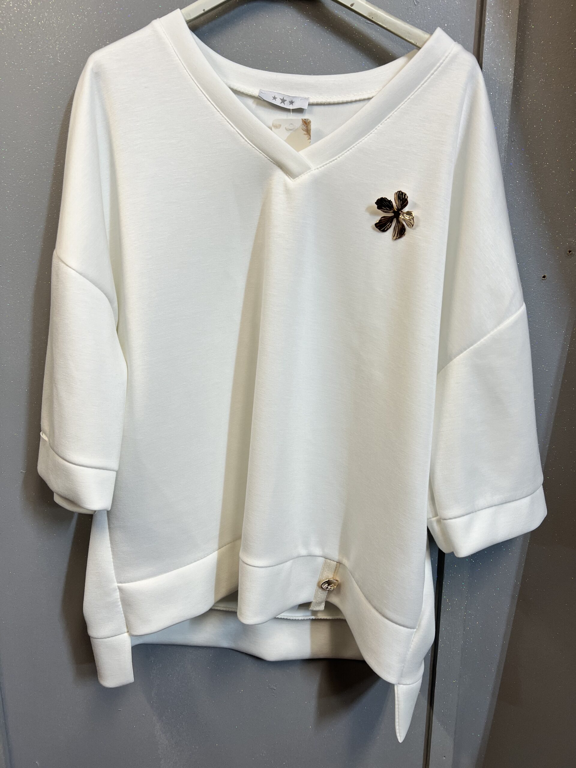 Bluzka w kolorze śmietanki, materiał masełko. Rękaw 7/8 zakończony mankietem, dzięki czemu bluzka może być noszona na sportowo i na elegancko. Idealnie sprawdzi się do spodni oraz spódnicy. Przód zdobiony jest broszką w kolorze złotym i wycięciem w serek ,a tył gładki.