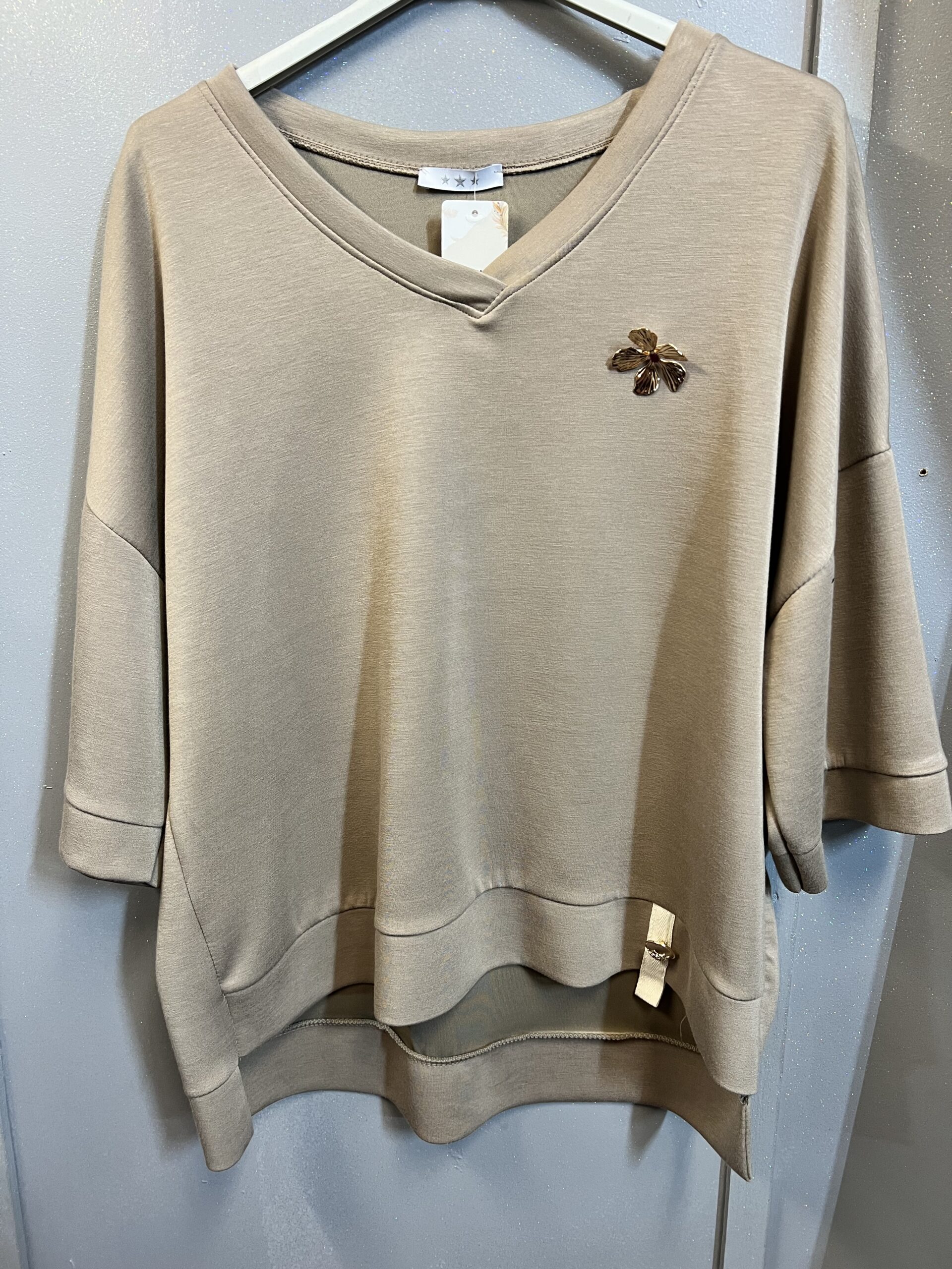 Bluzka w kolorze fango materiał masełko. Rękaw 7/8 zakończony mankietem, dzięki czemu bluzka może być noszona na sportowo i na elegancko. Idealnie sprawdzi się do spodni oraz spódnicy. Przód zdobiony jest broszką w kolorze złotym i wycięciem w serek ,a tył gładki.