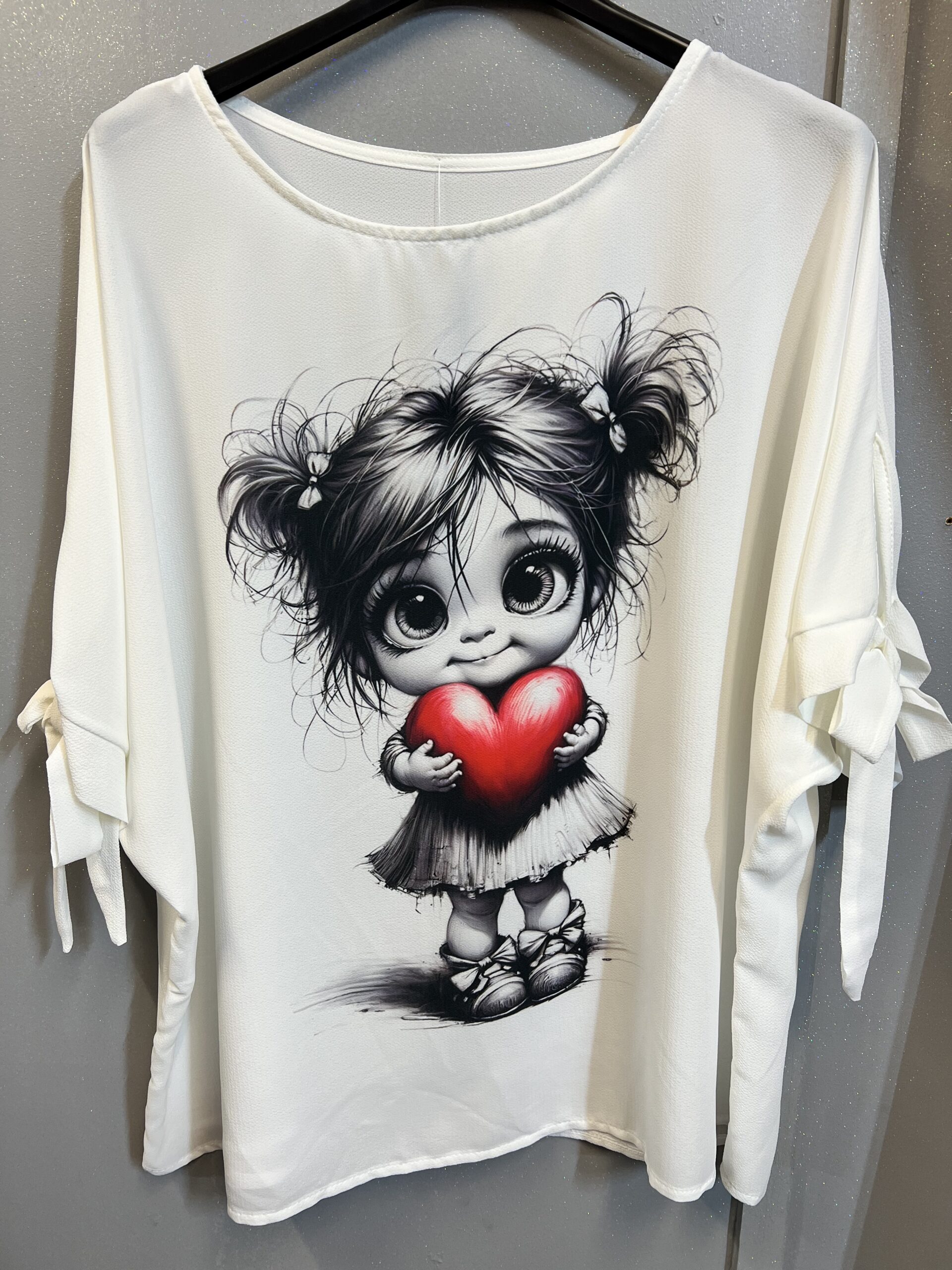 Bluzka na krótki rękaw, wiązany na końcu mankietów w kolorze eleganckiej bieli. Przód bardzo ładnie zdobiony motywem wesołej dziewczynki trzymającej w dłoniach duże, czerwone serduszko , oraz gładki tył. Bluzka świetnie pasująca do spodni oraz spódnicy.