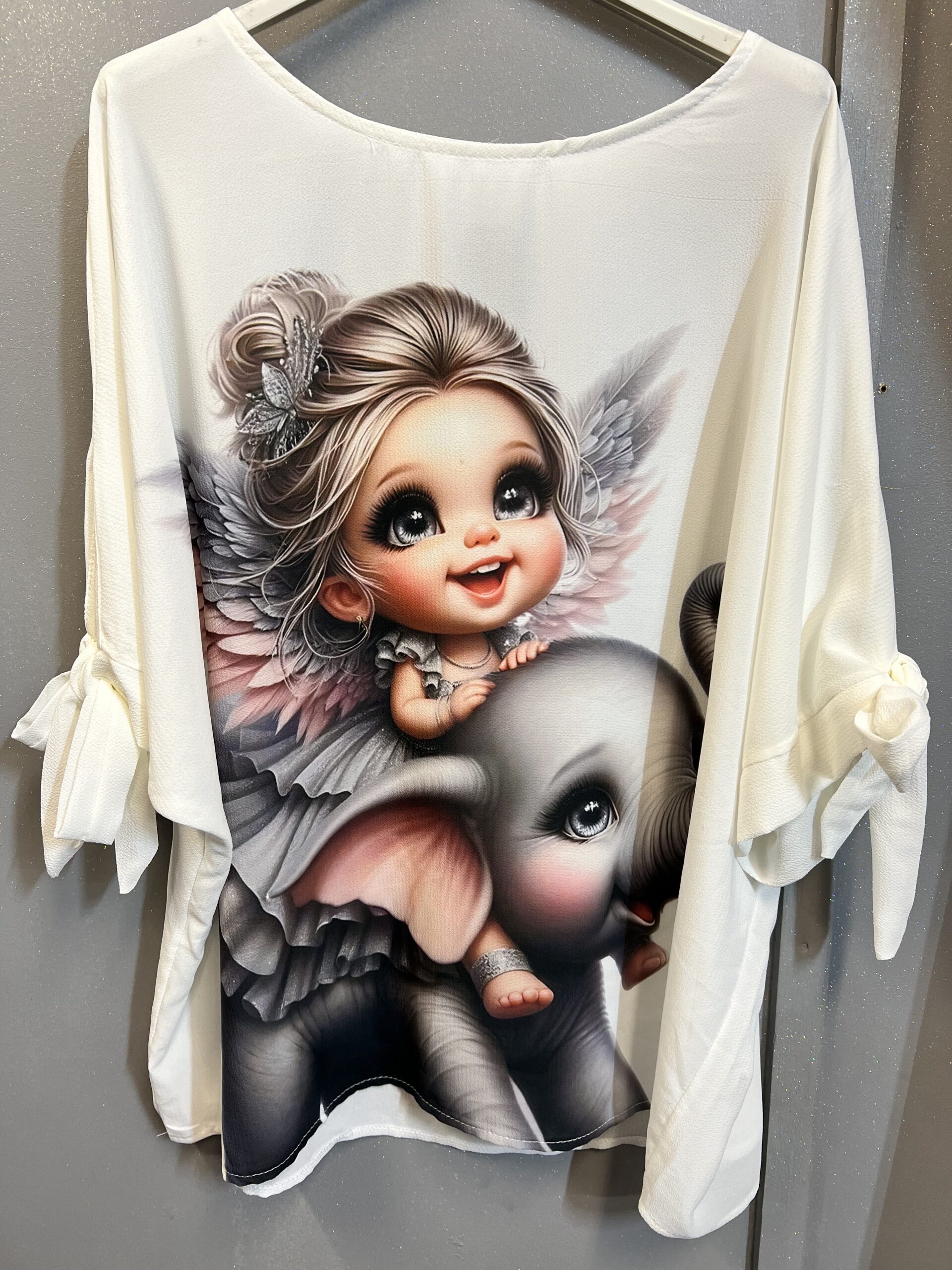 Bluzka na krótki rękaw, wiązany na końcu mankietów w kolorze eleganckiej bieli. Przód bardzo ładnie zdobiony kolorowym motywem wesołej dziewczynki ze skrzydłami, siedzącej na słoniu , oraz gładki tył. Bluzka świetnie pasująca do spodni oraz spódnicy.