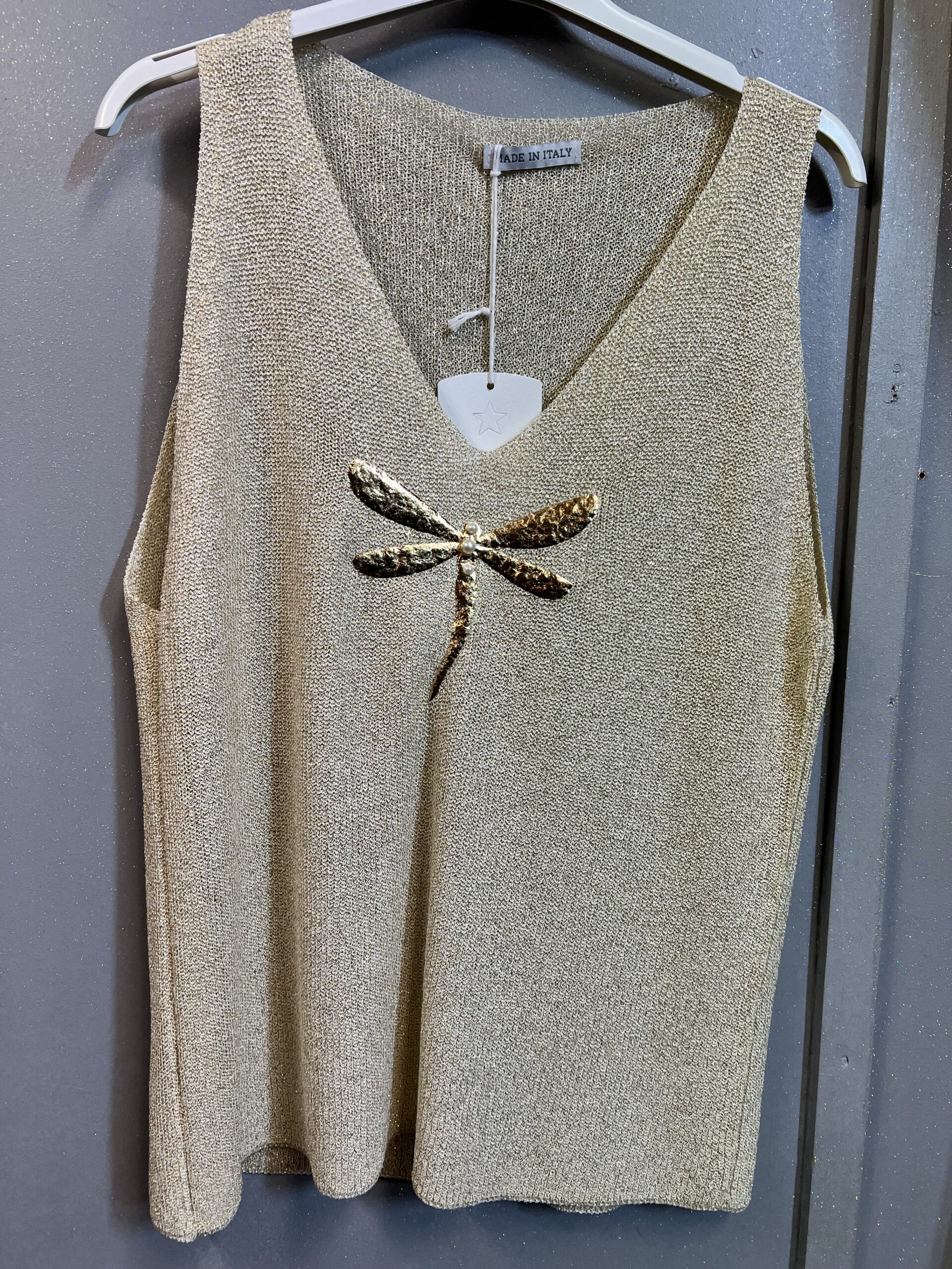 Bluzka ,na grube ramiączka w złotym kolorze i srebrna wtapianą nitką w delikatnej zwiewnej dzianinie ,ze zdobieniem na przodzie w kształcie ważki , Góra zakończona jest wycięciem w serek. Materiał łatwo się dopasowuje do sylwetki ,dzięki temu ,że jest elastyczny i wygodny. Idealnie się sprawdzi na co dzień ,do pracy i wieczorowe wyjścia pod żakiet i nie tylko.