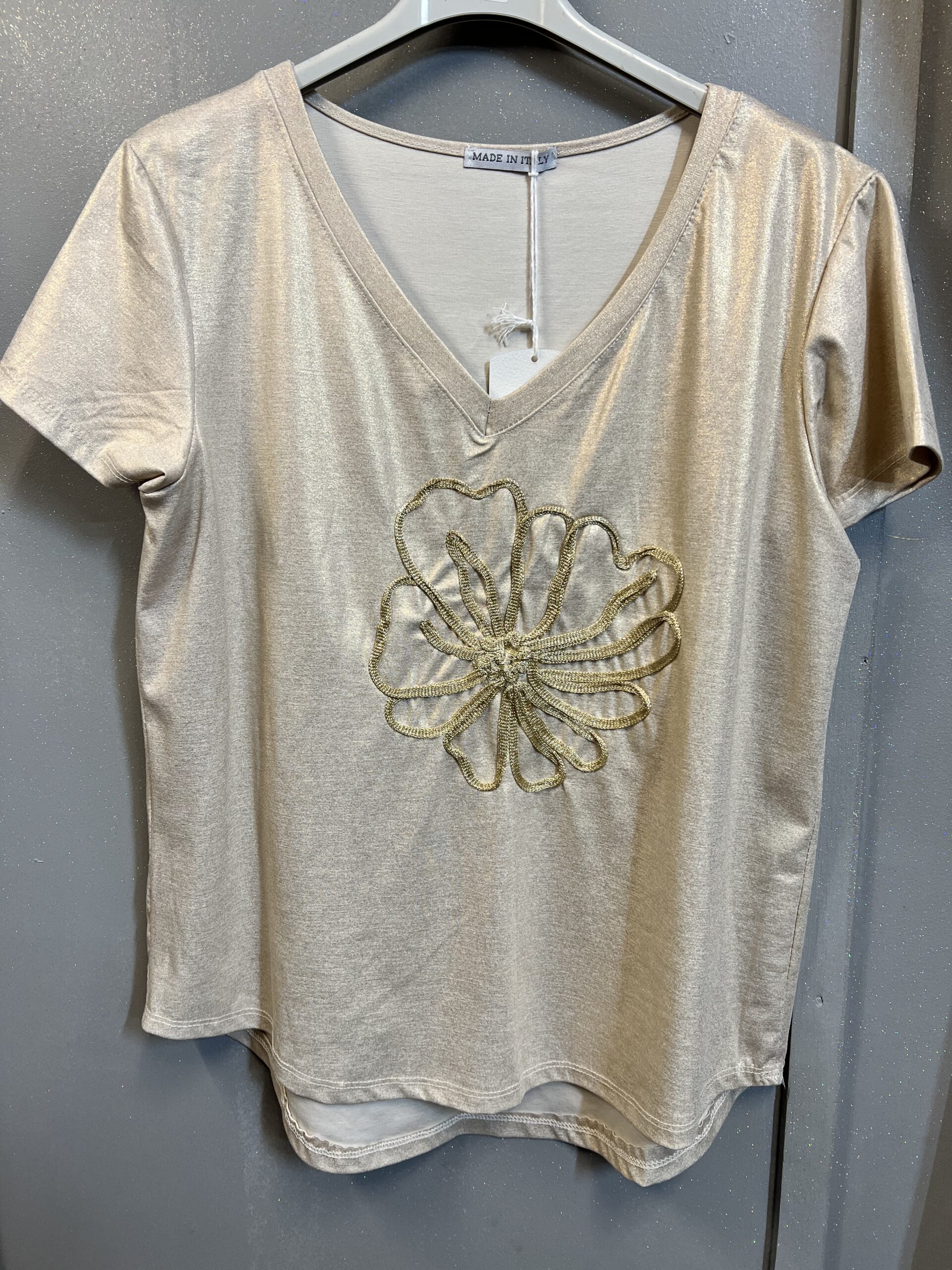 Bluzka w złotym kolorze ,ze zdobieniem na przodzie wyszytego, dużego kwiatka , na środku. Góra zakończona wycięciem w serek. Materiał łatwo się dopasowuje do sylwetki ,dzięki temu ,że jest elastyczny i wygodny. Idealnie się sprawdzi na co dzień ,do pracy i wieczorowe wyjścia. Bluzka z tyłu jest gładka.