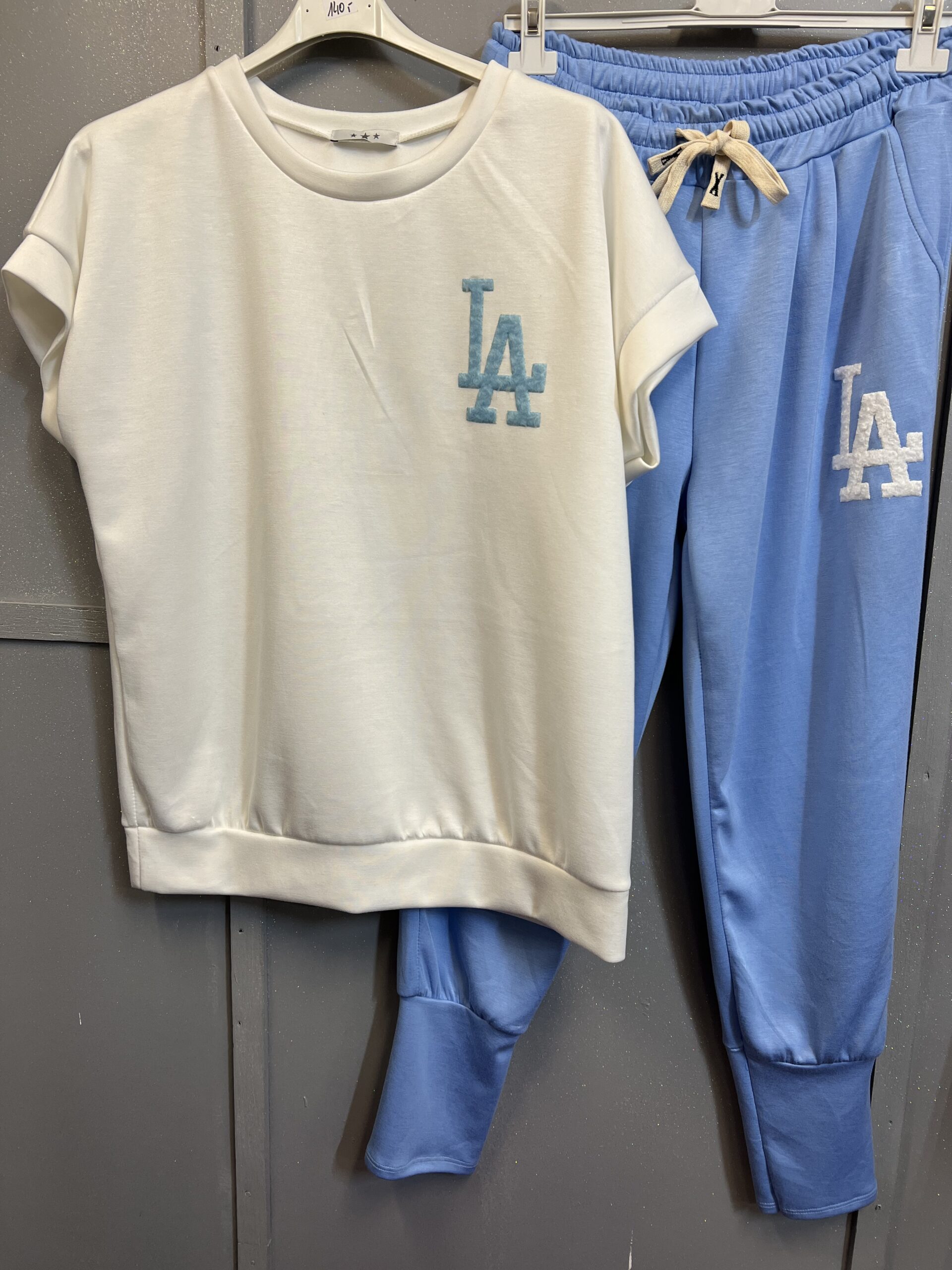 Dres składający się z bluzki na krótki rękaw w kolorze bieli i spodni w pięknym głębokim błękicie .Materiał masełko zdobiony w odcieniu na przemiennym literami ,,LA” naszytymi na przodzie bluzki ,oraz na jednej z nagawek .Tył bluzy i spodni jest całkowicie gładki ,góra spodni zakończona gumką ze ściągaczem oraz sznurkiem dół spodni lekko zwężany w krój alladynek . Dres bardzo wygodny ,idealnie sprawdzi się na co dzień.