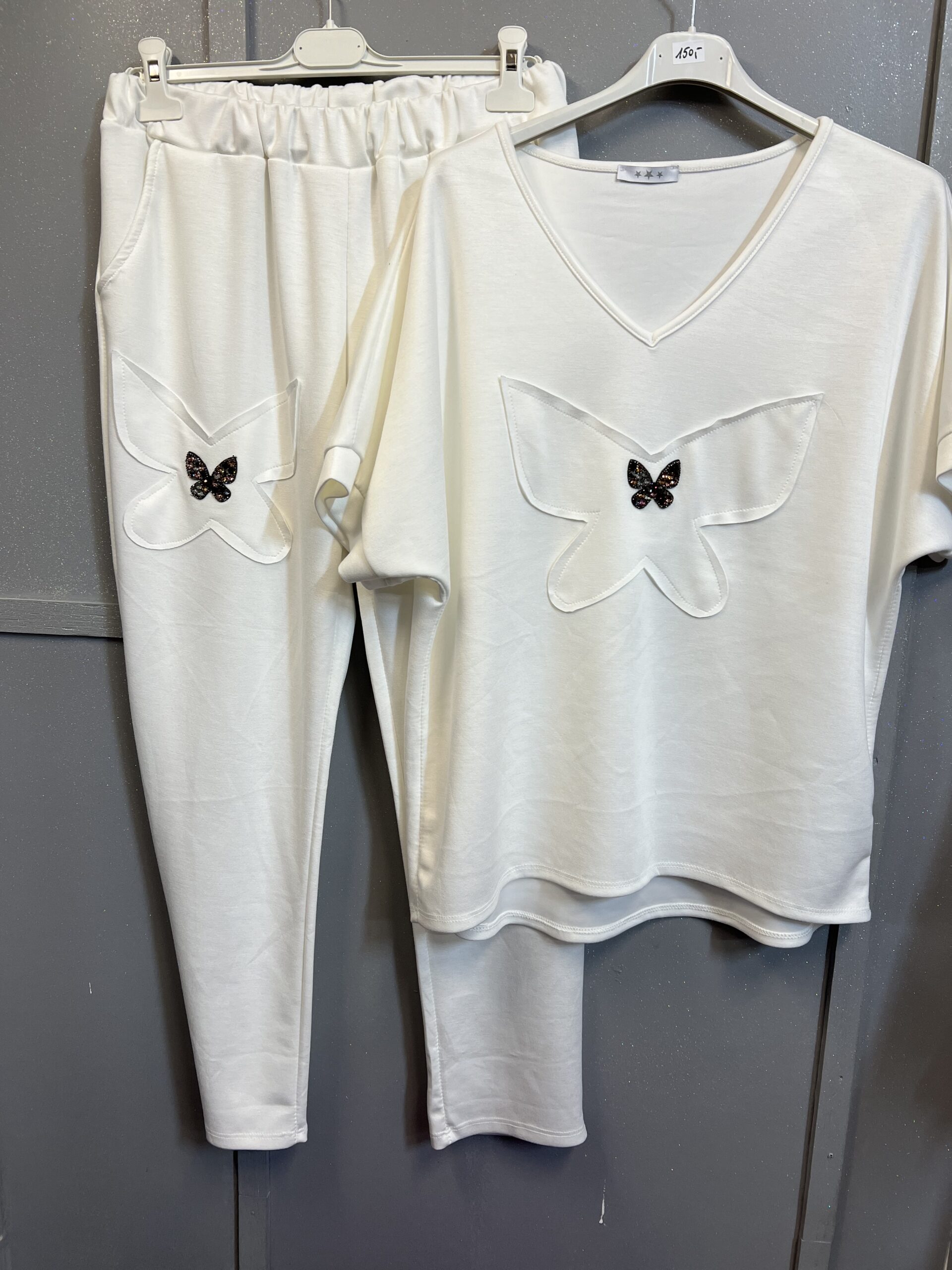 Dres składający się z bluzki na krótki rękaw i spodni w kolorze bieli .Materiał masełko zdobiony dużym motylem na przodzie bluzki naszywanym z tej samej tkaniny oraz mniejszym ze świecących cyrkonii Ten sam motyw widnieje na jednej z nagawek .Tył bluzki i spodni jest całkowicie gładki ,góra spodni zakończona gumką ze ściągaczem , dół spodni lekko zwężany . Dres bardzo wygodny ,idealnie sprawdzi się na co dzień.