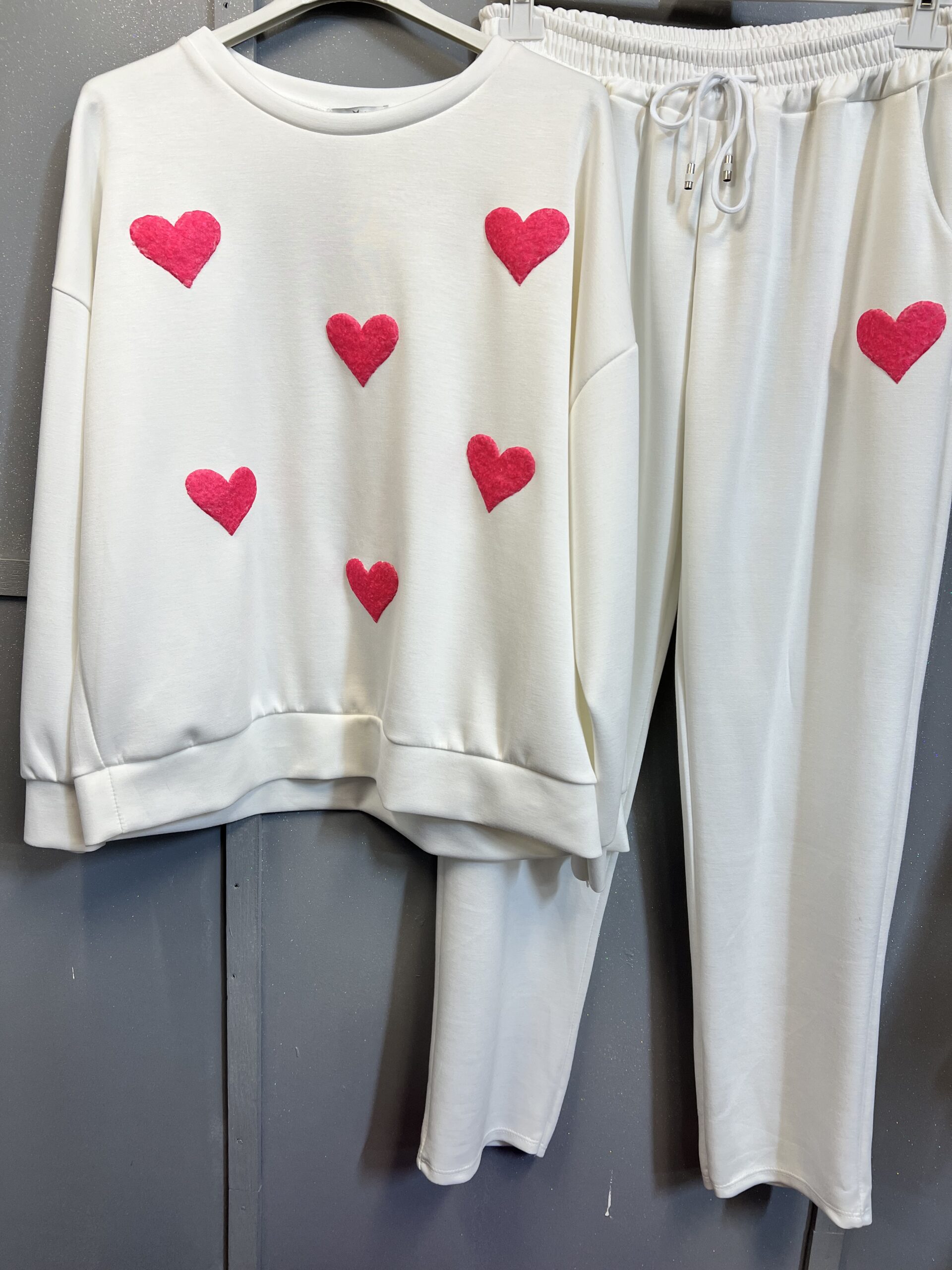Dres składający się z bluzy i spodni .Materiał masełko w kolorze białym zdobiony różowymi , materiałowymi serduszkami naszytymi na przodzie bluzy ,oraz jednego na jednej z nagawki .Tył bluzy i spodni jest całkowicie gładki ,góra spodni zakończona gumką ze ściągaczem oraz sznurkiem . Dres bardzo wygodny ,idealnie sprawdzi się na co dzień.