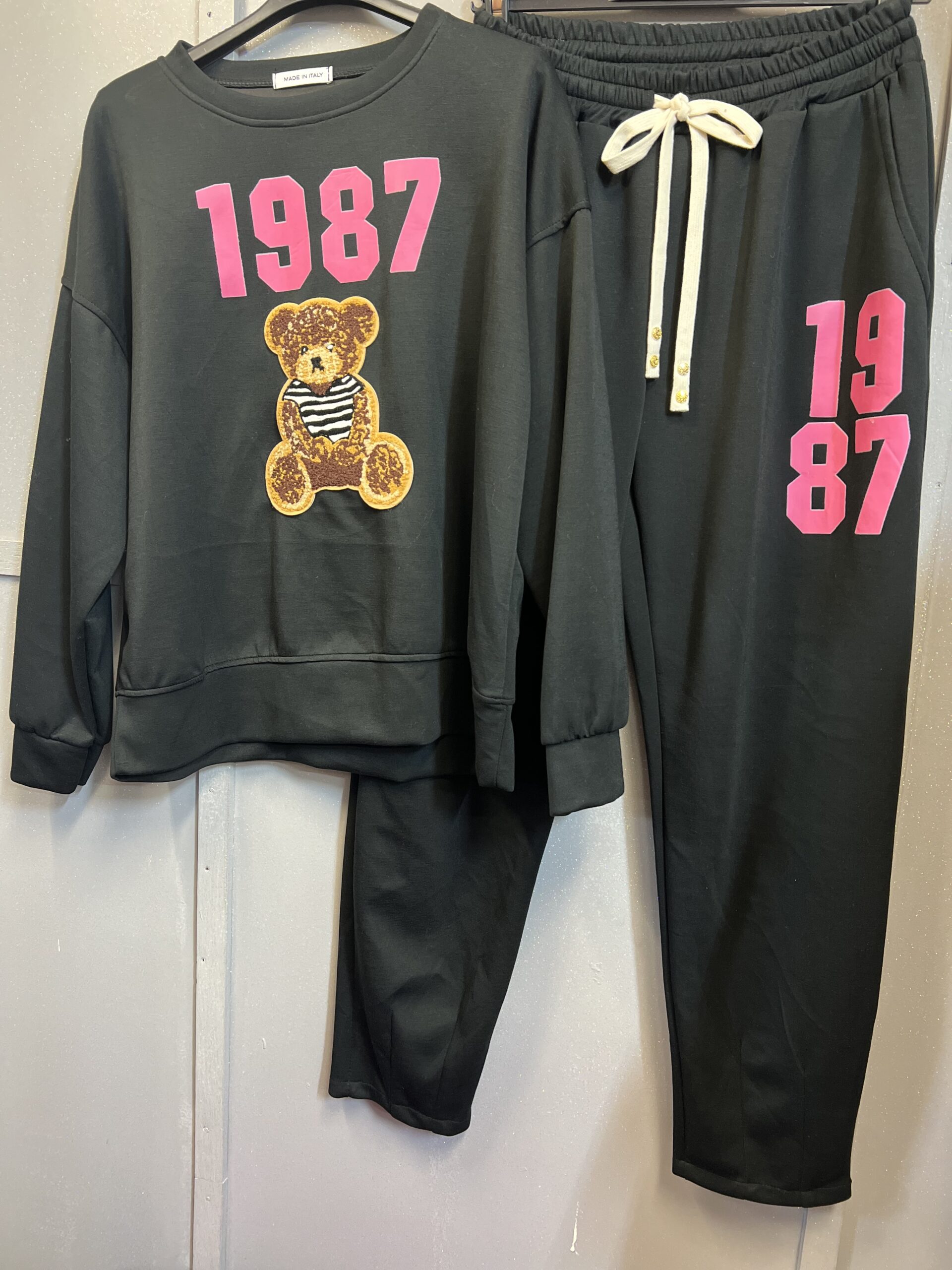 Dresy w czarnym kolorze z różowym naszywanym napisem 1987 i brunatnym misiem na przodzie bluzy oraz na lewej nogawce spodni samego napisu . Bluza zakończona na rękawach ściągaczami. Spodnie dół prosty ,góra ściągacz na gumkę ze sznurkiem oraz kieszenie . Dresy lekkie i delikatne .Idealne na co dzień i do pracy. Bardzo fajni62e wygląda w zestawie z bomberką.