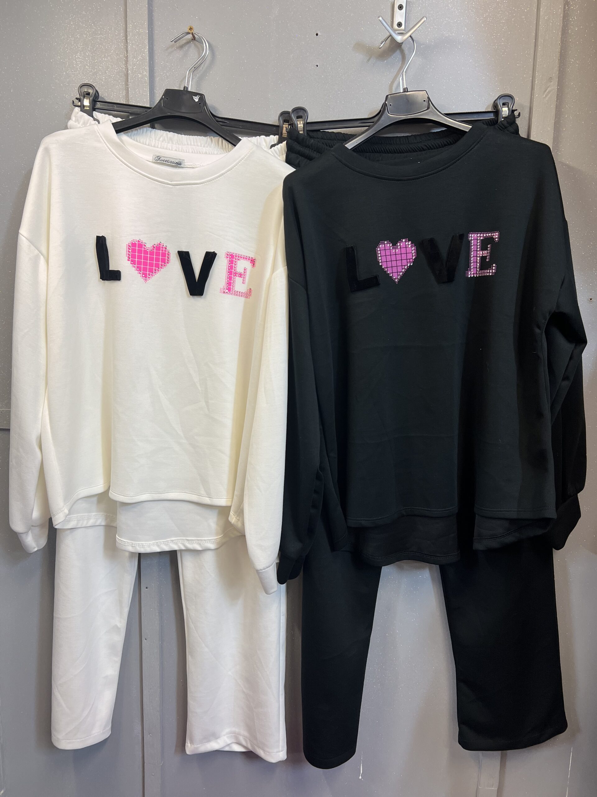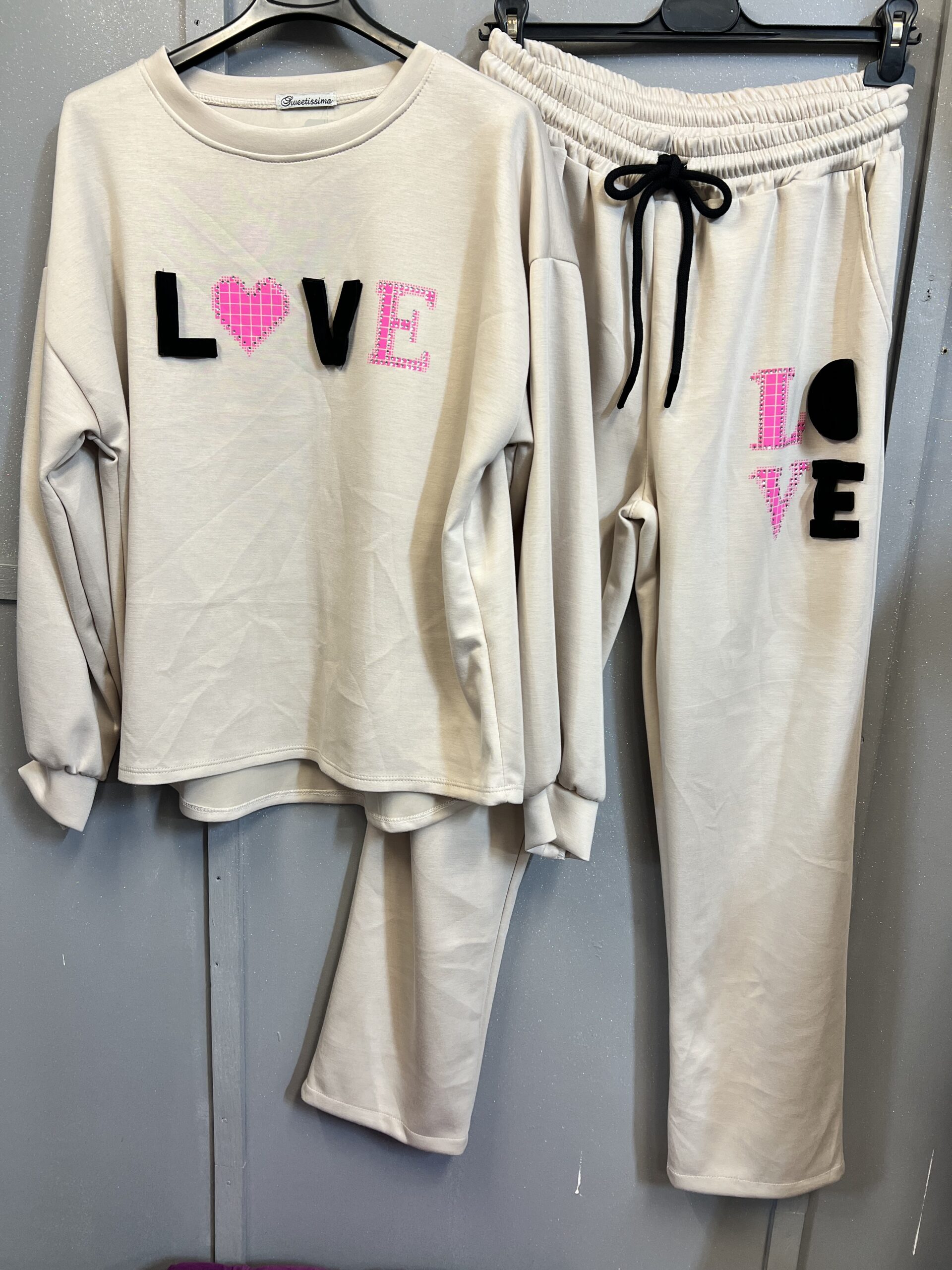 Dresy w beżowym kolorze z czarno-różowym naszywanym napisem LOVE na przodzie bluzy oraz na lewej nogawce spodni. Bluza zakończona na rękawach ściągaczami. Spodnie dół prosty ,góra ściągacz na gumkę ze sznurkiem. Dresy lekkie i delikatne .Idealne na co dzień i do pracy. Bardzo fajni62e wygląda w zestawie z bomberką.