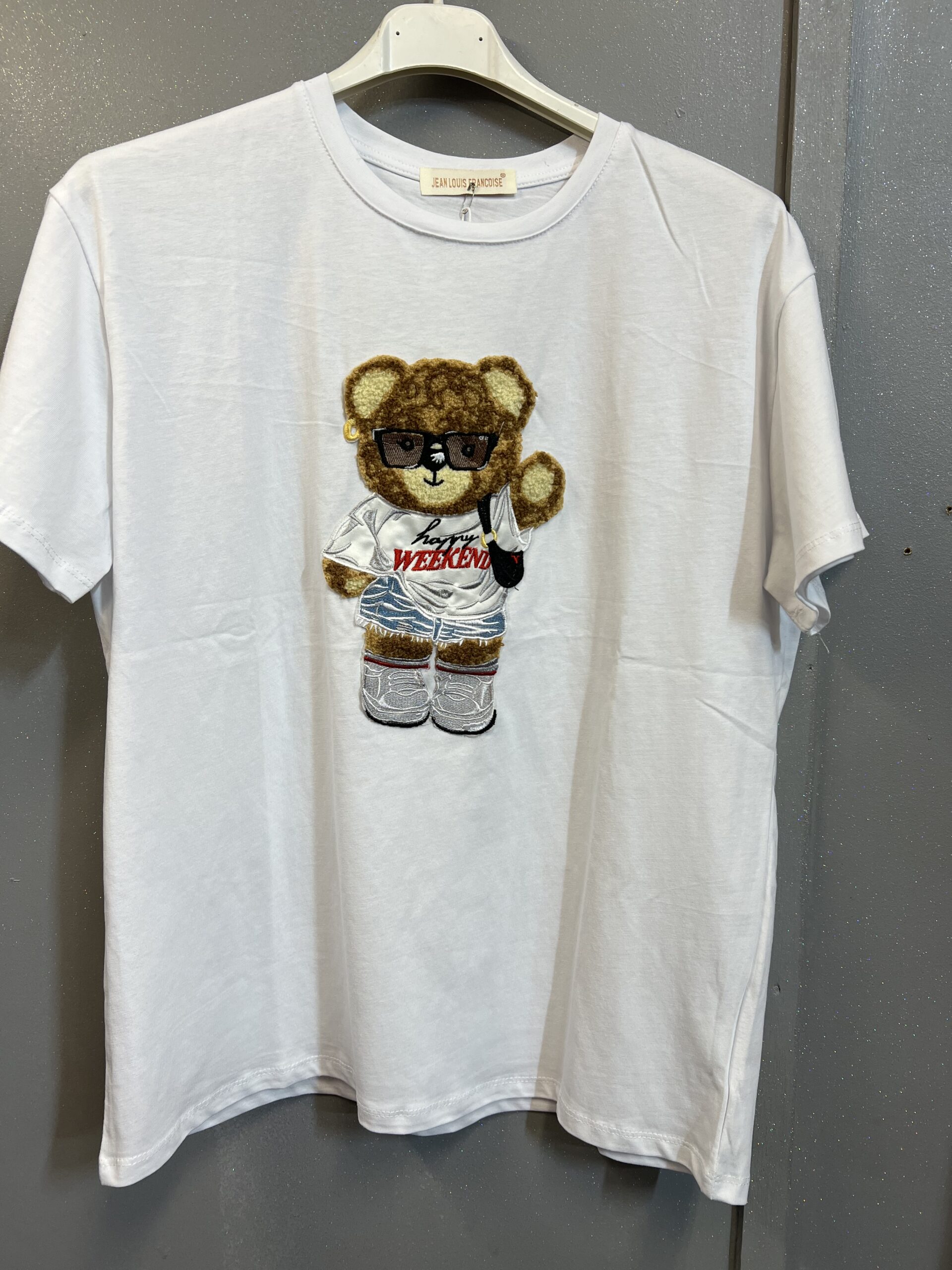 Koszulka w klasycznym białym  kolorze z naszytym kolorowym misiem w białych skarpetach do kolan ,spodniach i koszulce z czerwonym napisem i okularach. Przez ramię przewieszoną czarną torebką. Koszulka jest z dobrej jakości bawełny. Idealna na co dzień do spodni i spódnicy , świetnie komponuje się z trampkami. Tył koszulki jest gładki.