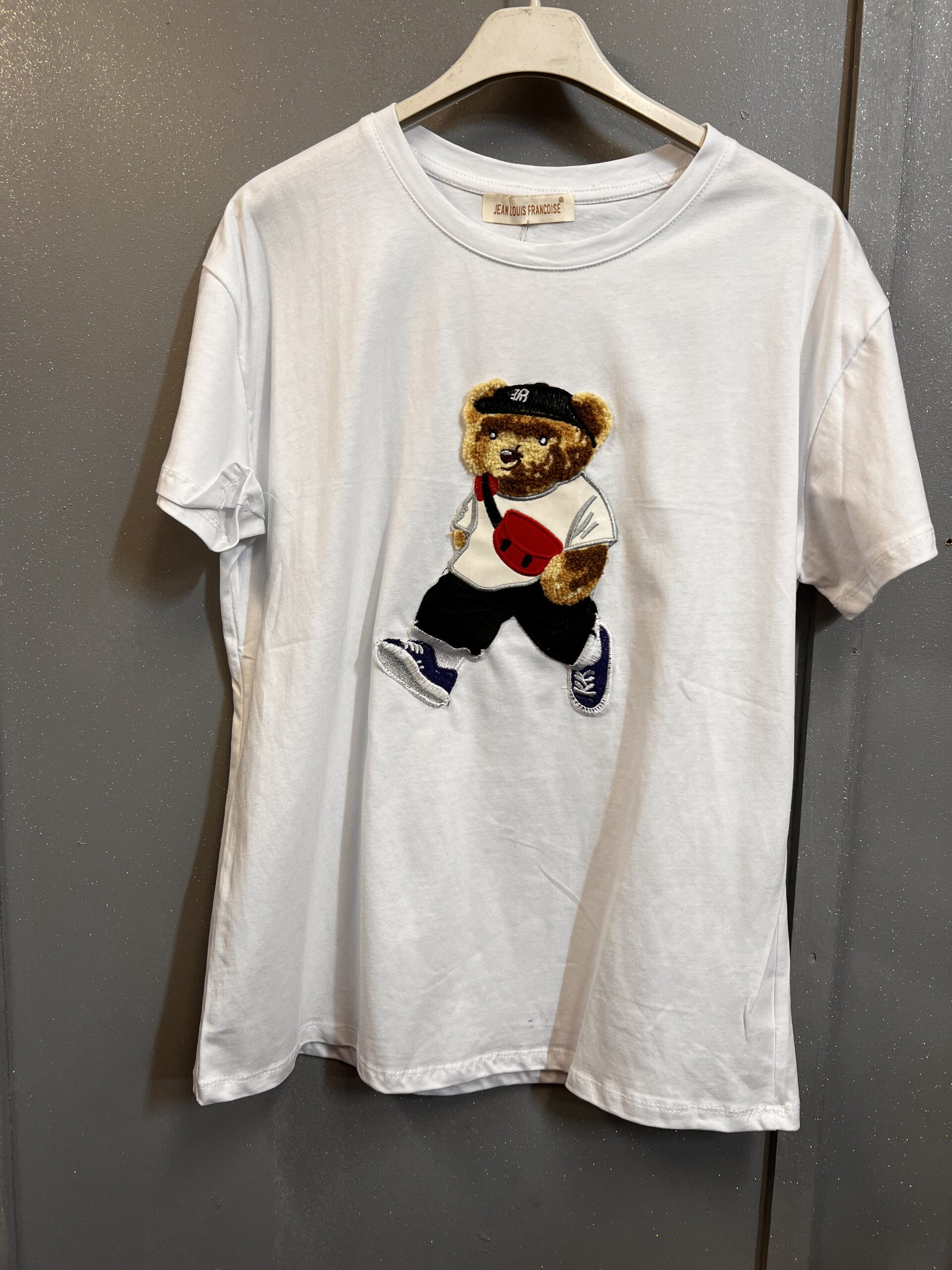 Koszulka w klasycznym białym kolorze z naszytym kolorowym misiem w niebieskich trampkach, spodniach i koszulce. Na głowie ma czapkę z daszkiem i przez ramię przewieszoną czerwoną torebką. Koszulka jest z dobrej jakości bawełny. Idealna na co dzień do spodni i spódnicy , świetnie komponuje się z trampkami. Tył koszulki jest gładki.
