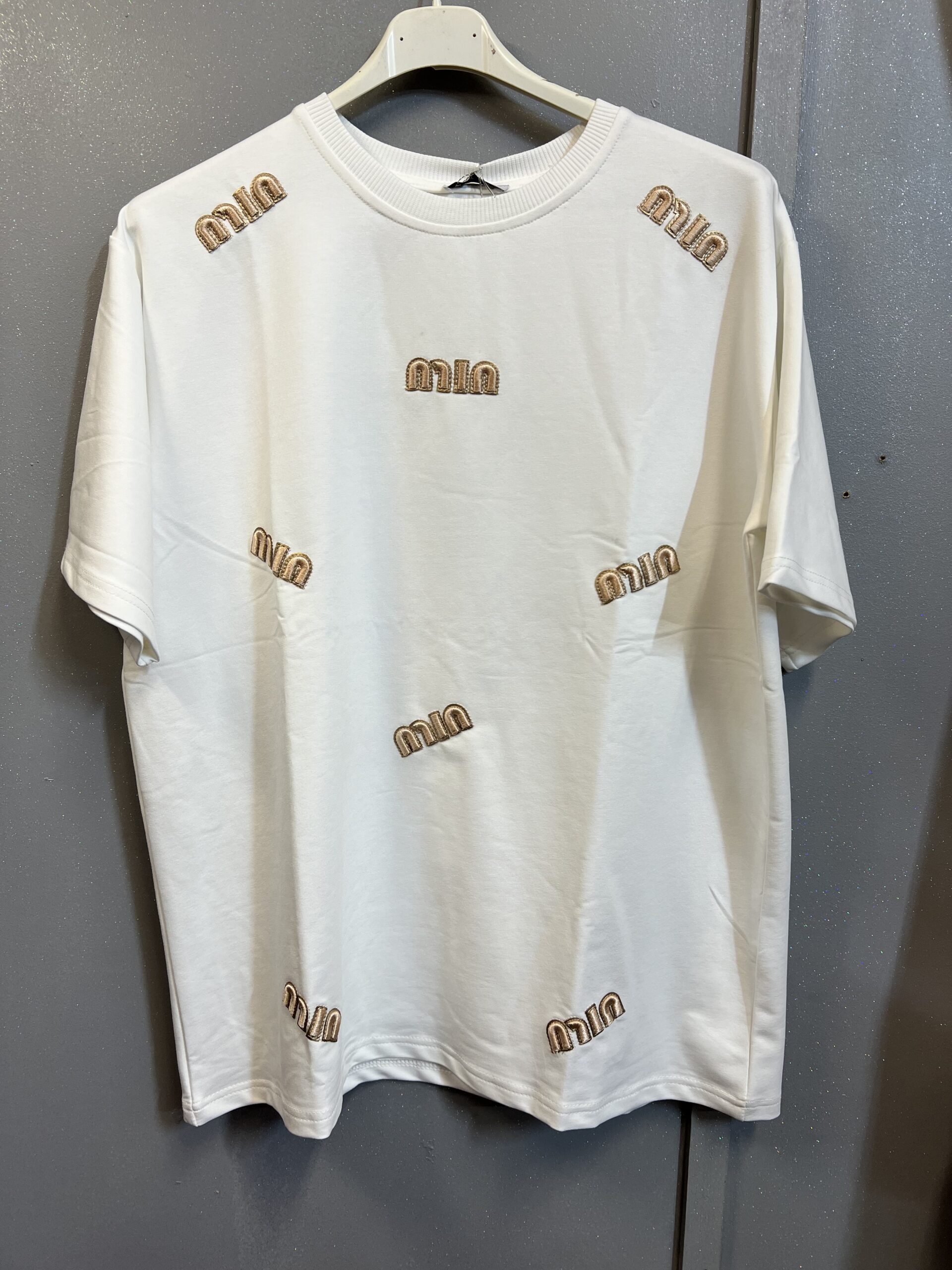 Koszulka w kolorze białym z dobrej jakości bawełny .Przód koszulki zdobiony napisem NIM z grubo wyszywanego ściegu. Pod szyją zakończona ściągaczem Idealnie nadaje się do noszenia w zestawie ze spodniami oraz spódnicą. Sprawdzi się na co dzień i do pracy.