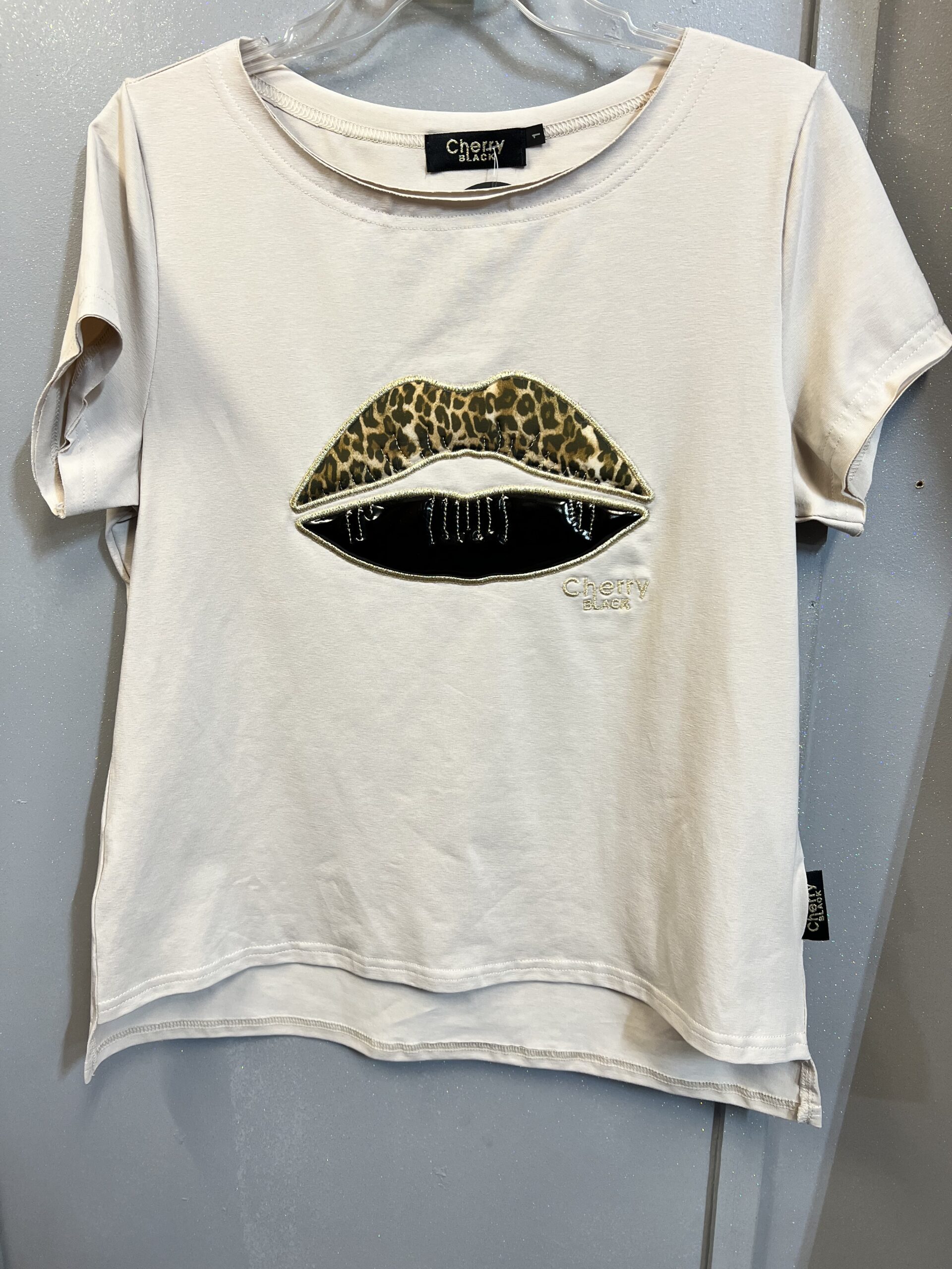 T-shirt w kolorze beżowym polskiego producenta z fantastycznym wszywanym nadrukiem materiałowo -ceratowym motywem ust. Pod szyją wykończona krojem w łódkę. Materiał bardzo dobrej jakości z długim rękawem .Idealnie sprawdzi się na co dzień ,do spodni i do spódnicy.