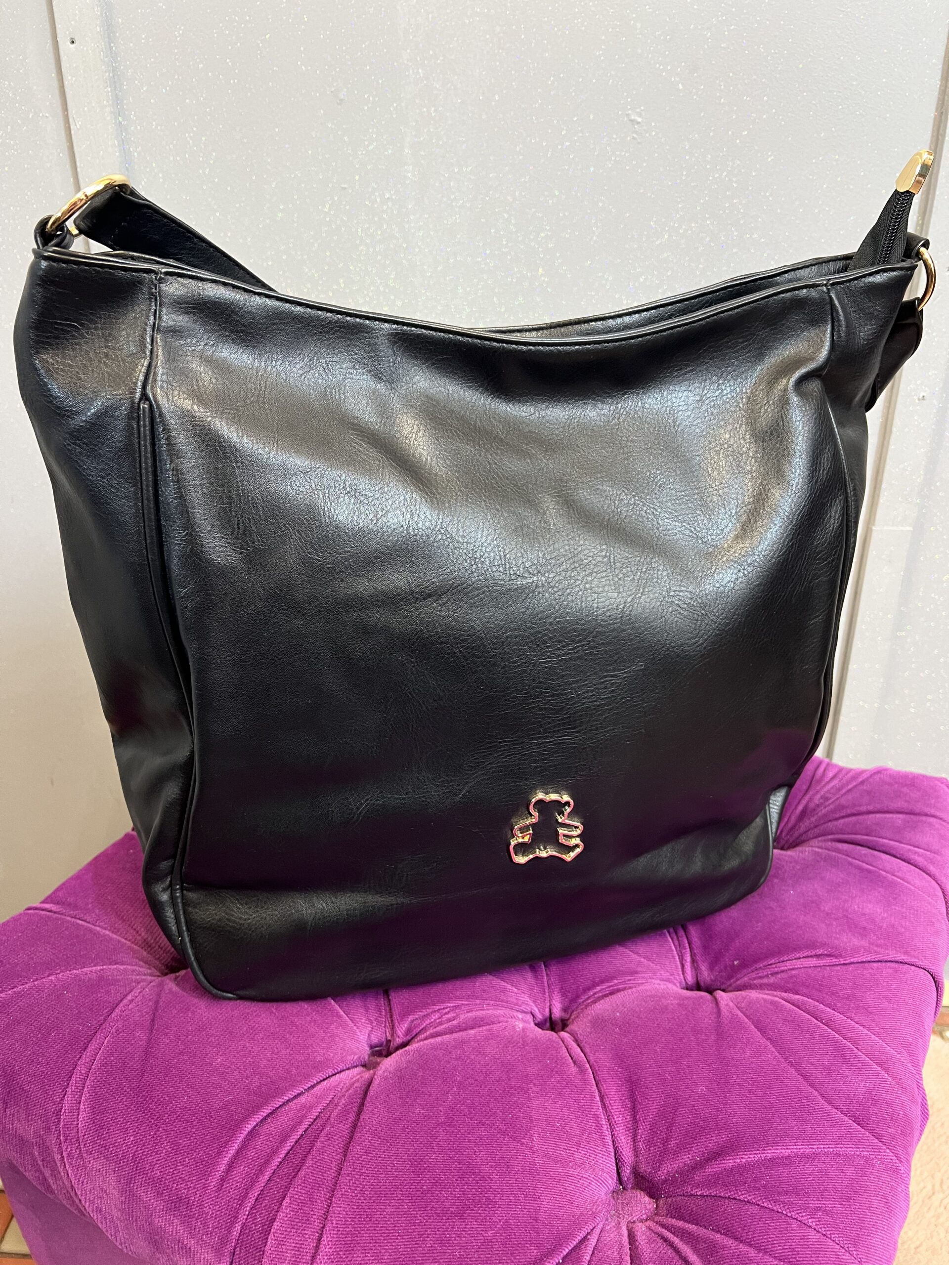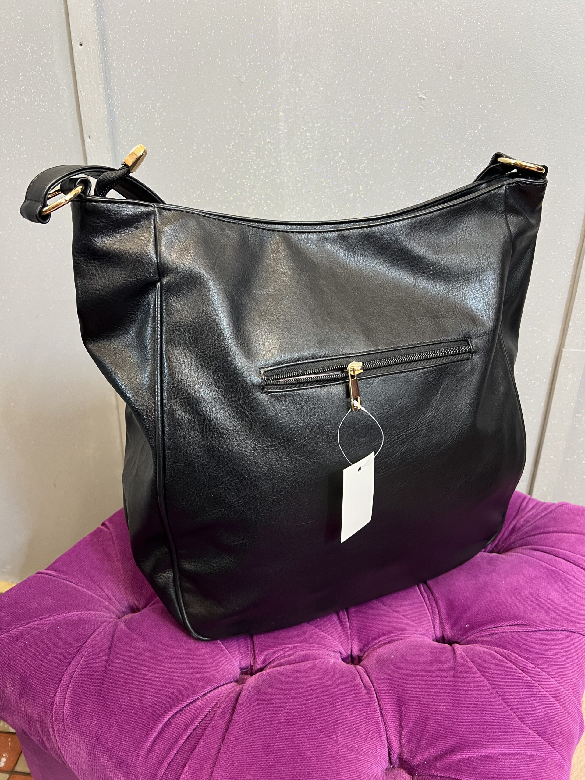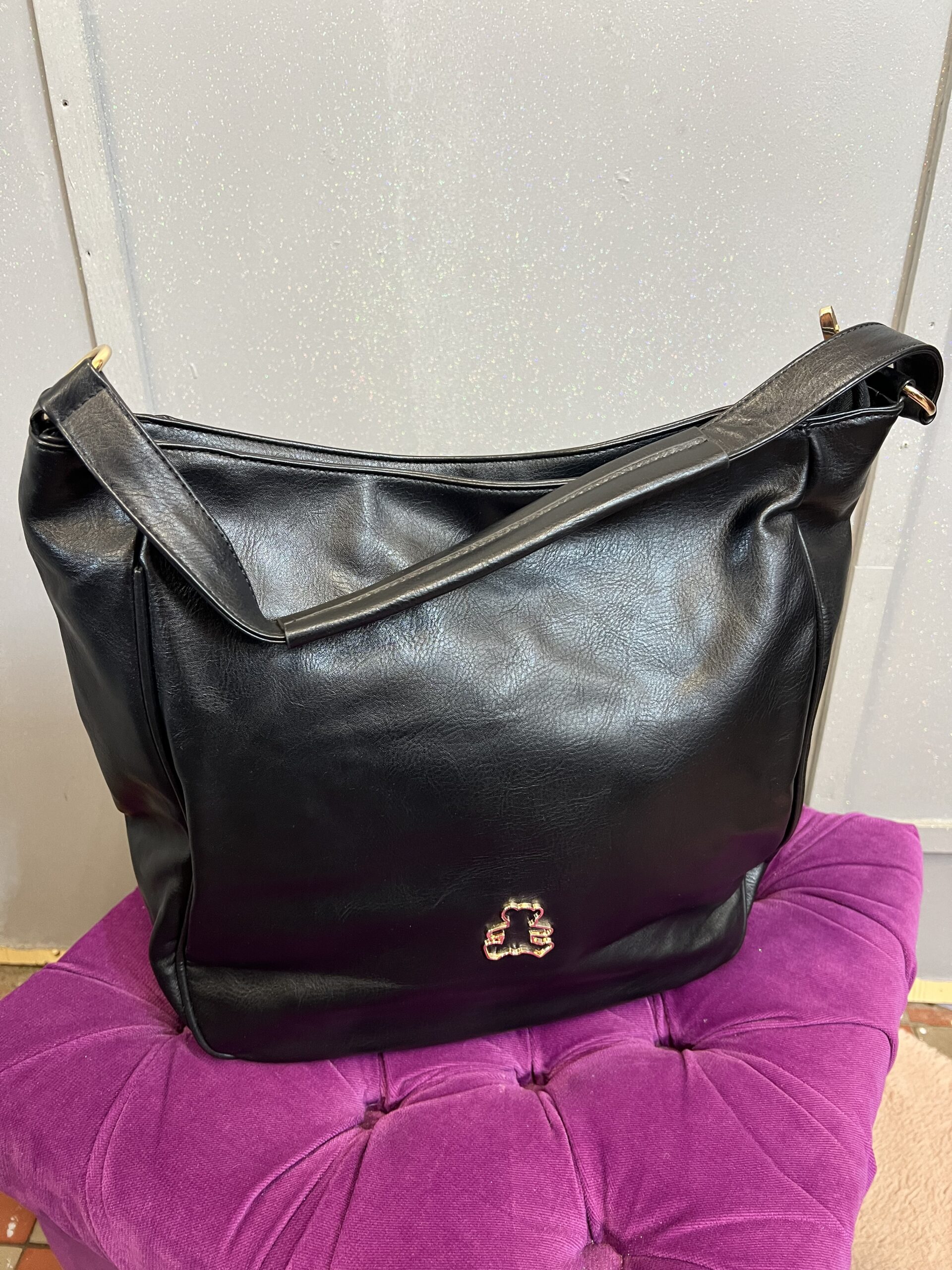 Duża torba formatu A4, w klasycznej czerni. Główna komora jedna duża ,z dwiema zapinanymi na zamek  wewnątrz .Spód torebki usztywniany, cała z miękkiej ekosóry. Jeden krótki pasek na ramię.