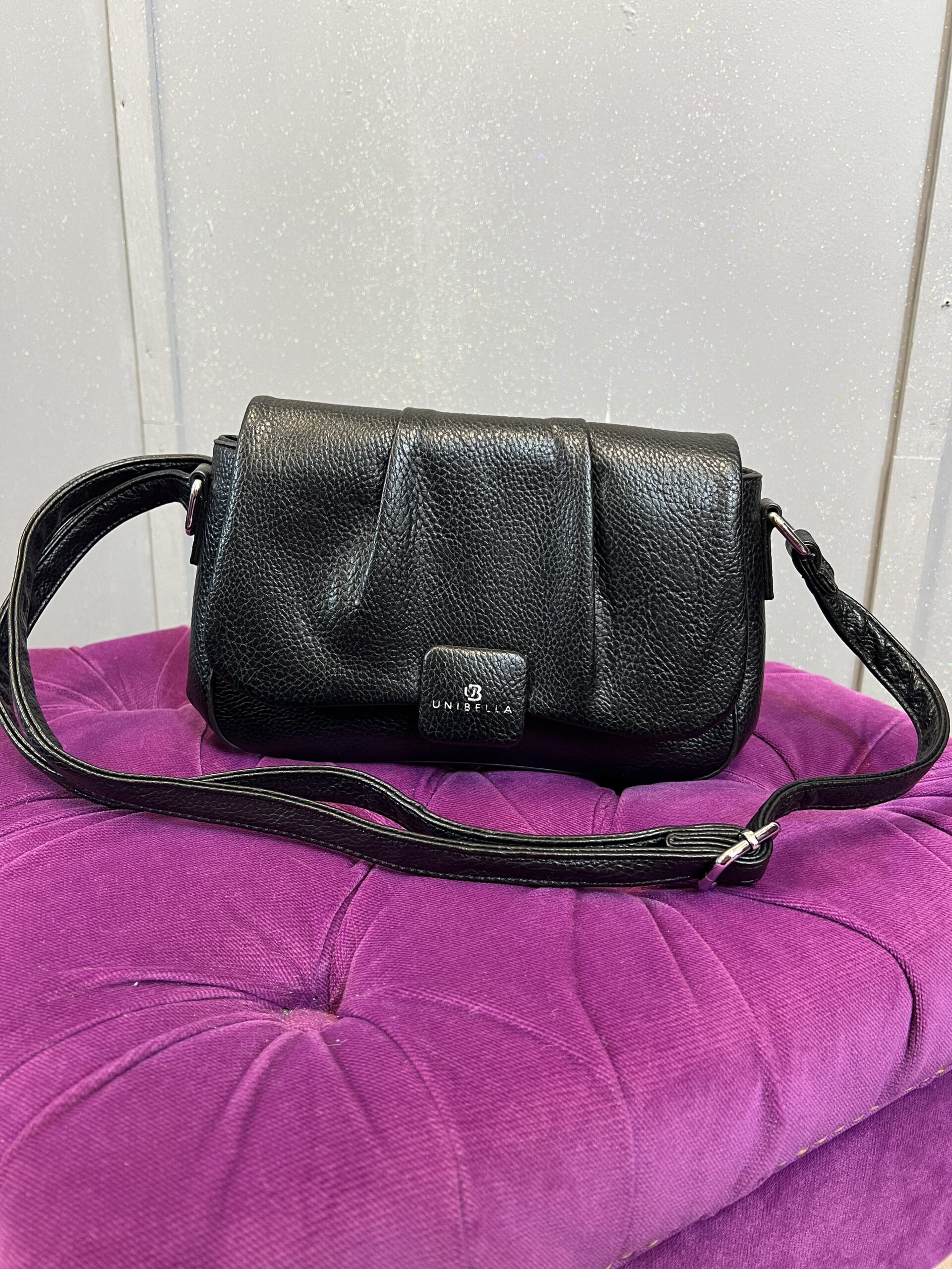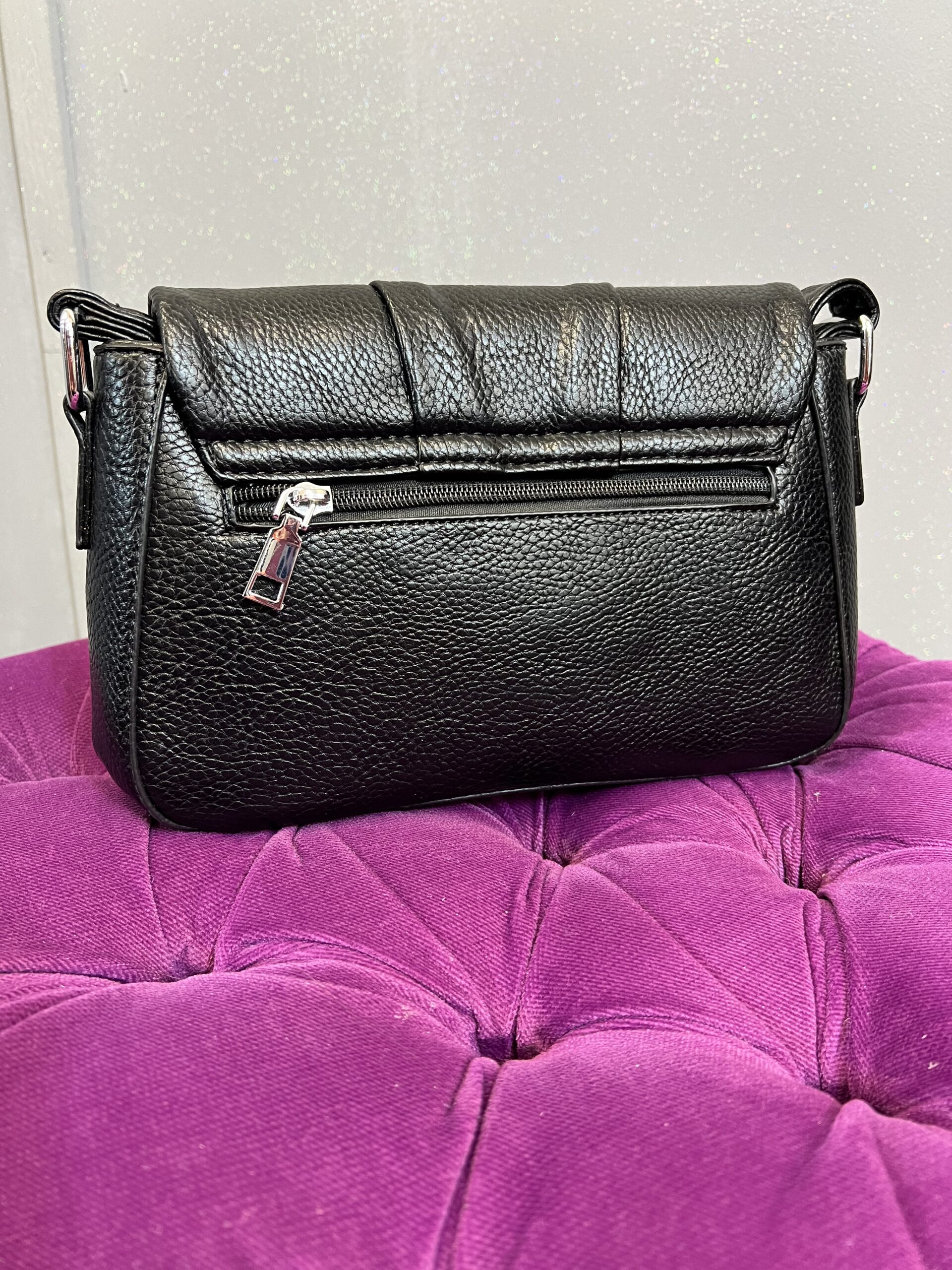 Mała czarna w stylu retro torebka – kopertówka. Regulowany pasek na ramię, ładnie zdobiony przód klapy , na zakładkę. Środek ma jedną komorę dość dużą i dodatkową mniejszą zapinaną na zamek. Tylna część torebki zdobiona dodatkową kieszonką. Idealna na każdą okazję.