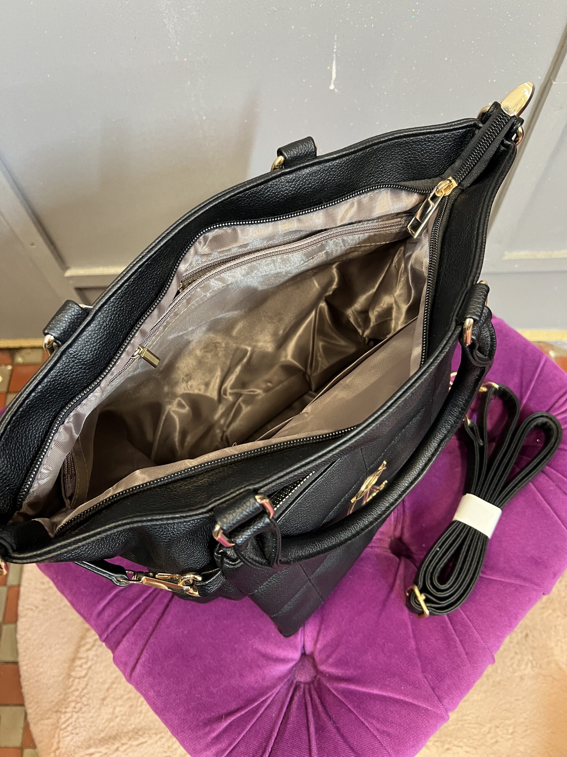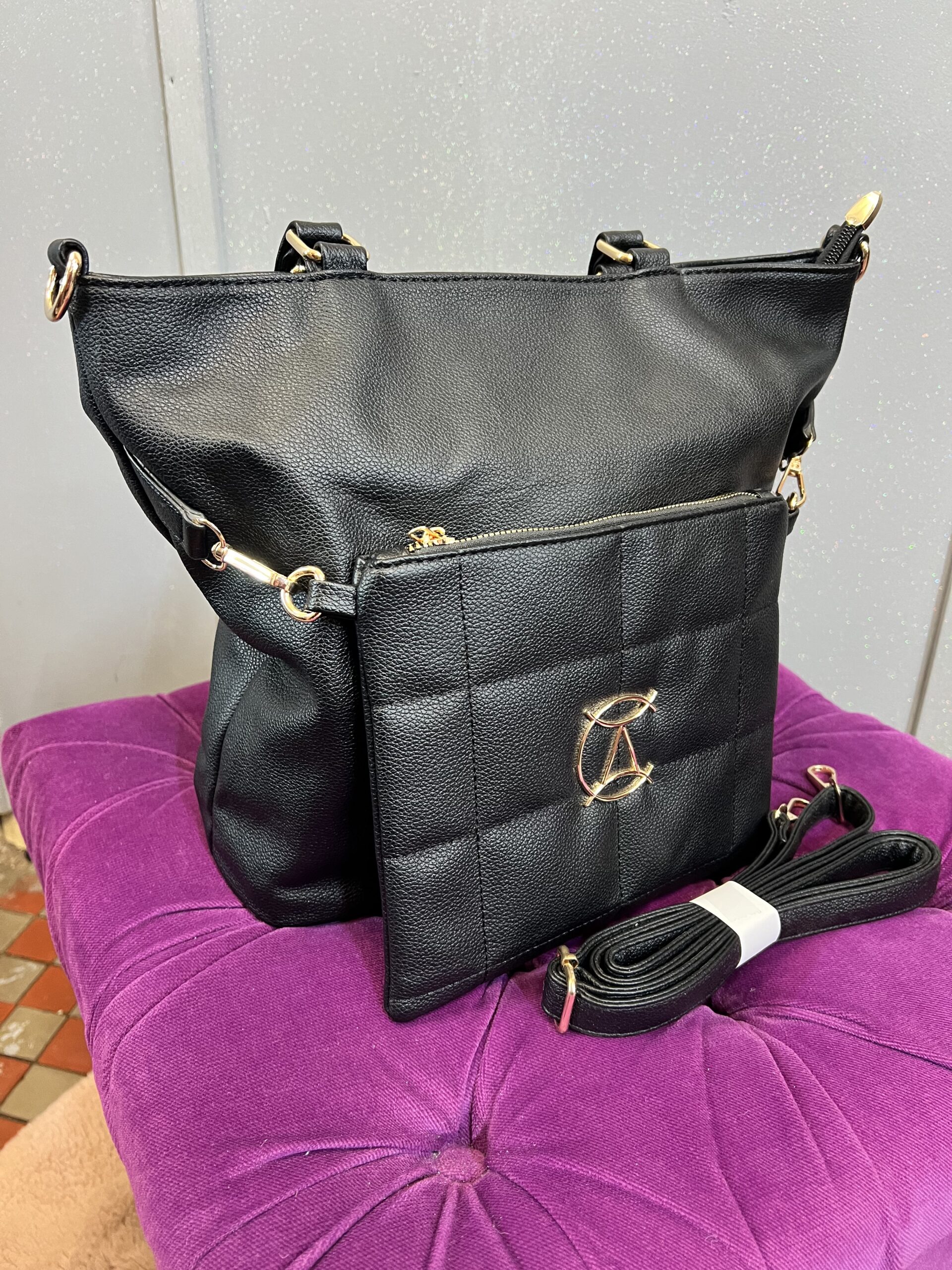 Duża torebka w formacie A4 z mniejszą torbą w zestawie w formacie A5. Obie torby są w kolorze czarnym, duża torebka ma regulowany pasek i uchwyt do noszenia w dłoni. Mała torebka jest doczepiana na karabińczyki. Środek torby wypełnia przestrzeń na dokumenty, znajduje się również sekcja główna oddzielana zamkiem.