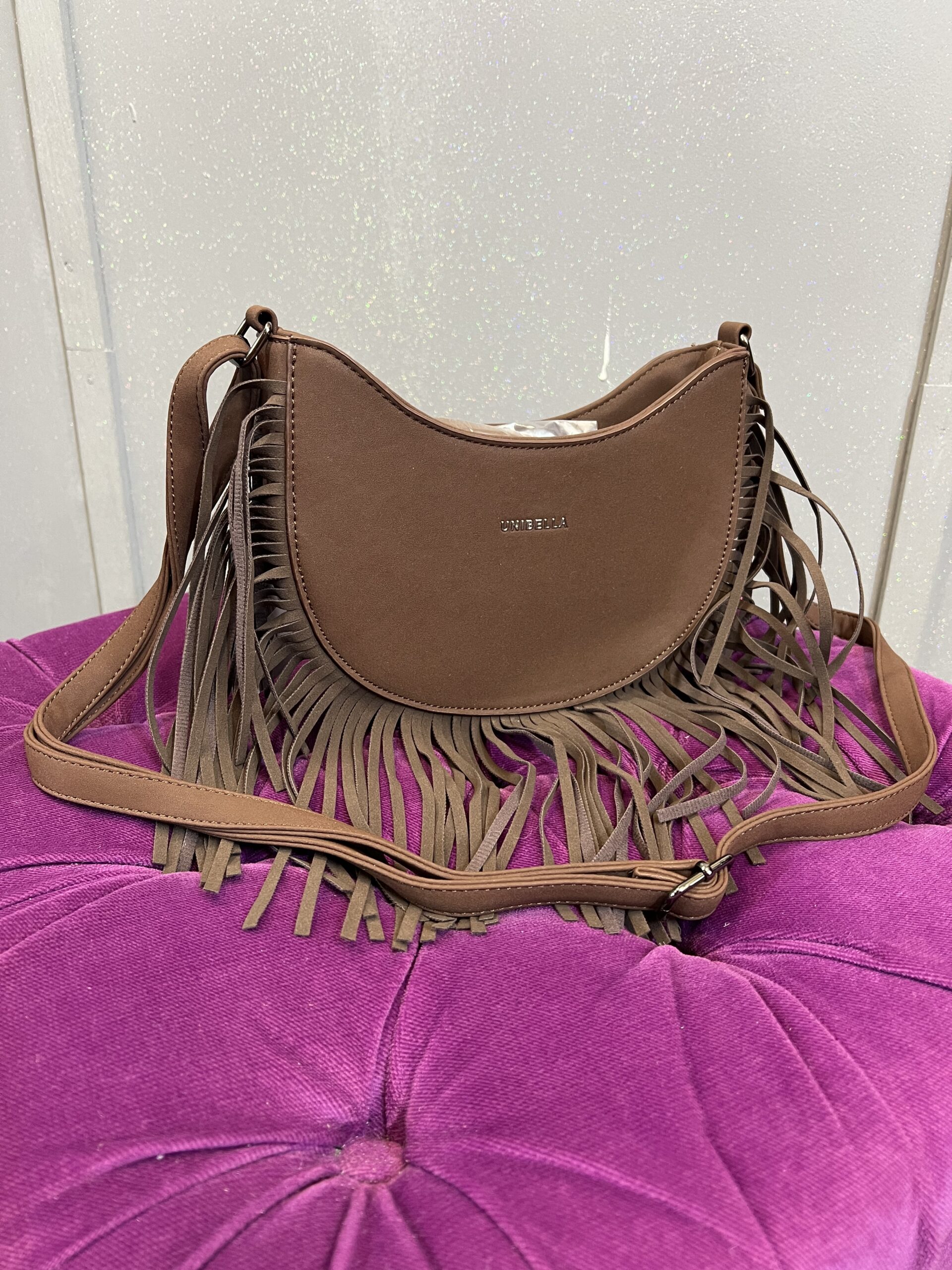 Torebka zamszowa w kolorze czekoladowego brązu. Torebka posiada jedną komorę bezpośrednio zapinana na suwak. Torebka ma regulowany pasek, oraz zdobienie z frędzelków