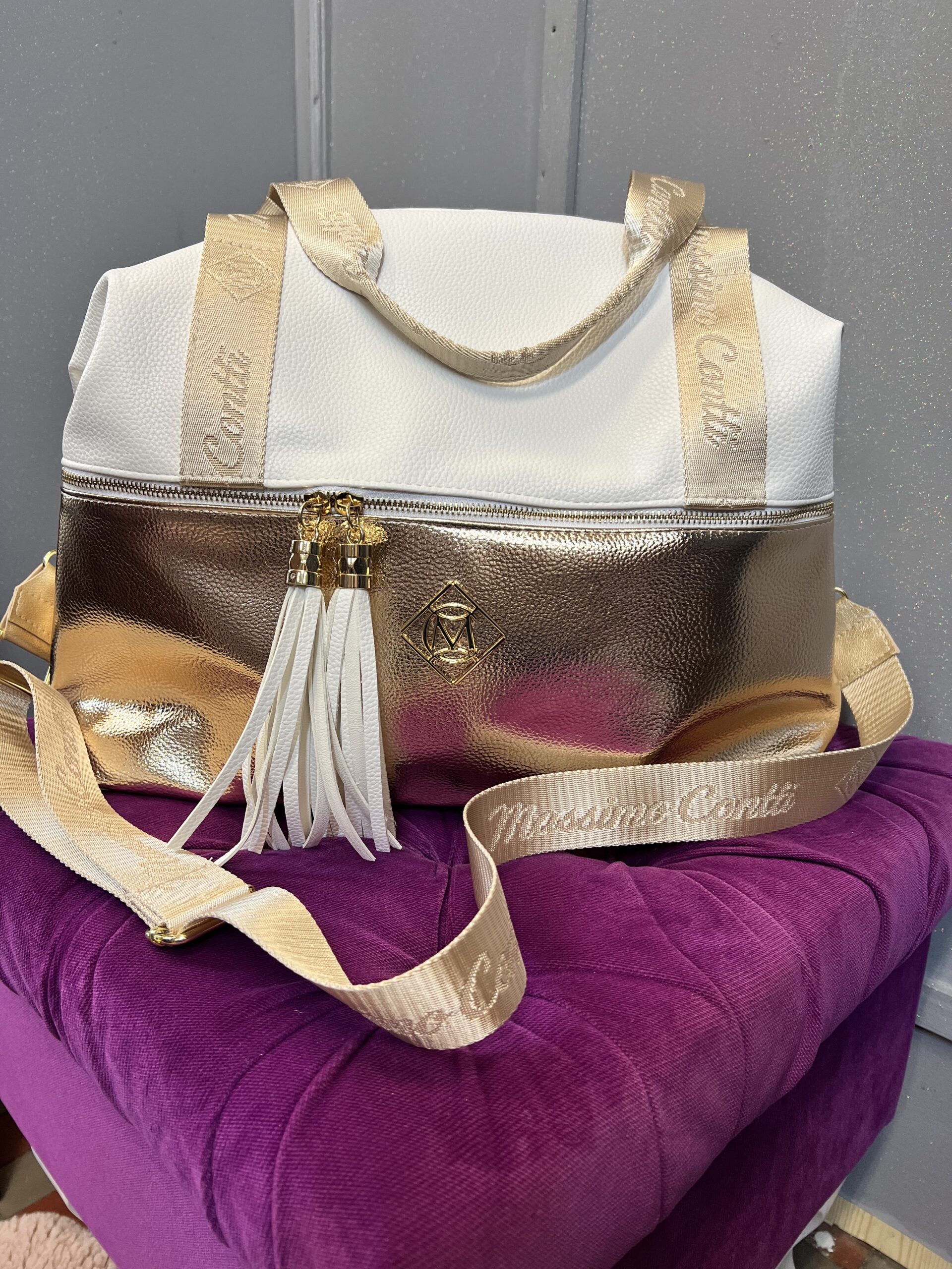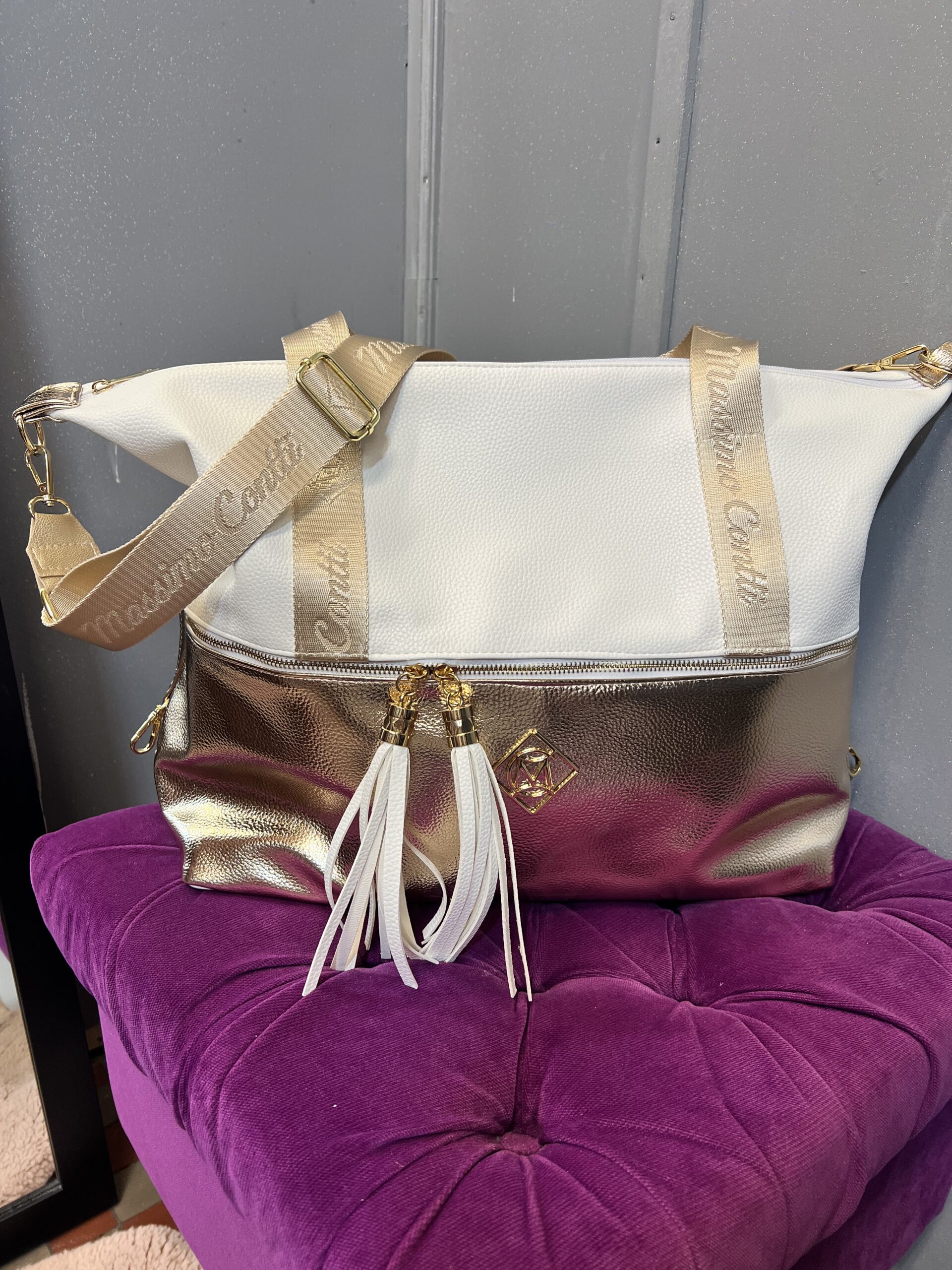 Torebka weekendówka w kolorze białym ze złotą wstawką od dołu do połowy na przodzie ,zdobiony suwak w poprzek z dwoma frędzelkami oraz logo producenta .Jedna główna komora u góry zapinana na suwak i dwie dość mocne rączki . Druga strona torebka zawiera mniejszą kieszonkę zapinaną na suwak, długi i szeroki pasek z logo producenta oraz karabińczyki do regulacji torebki ,z większej na mniejszą i z mniejszej na większą. Idealna na każdą okazje .Lekka trwała i wytrzymała.
