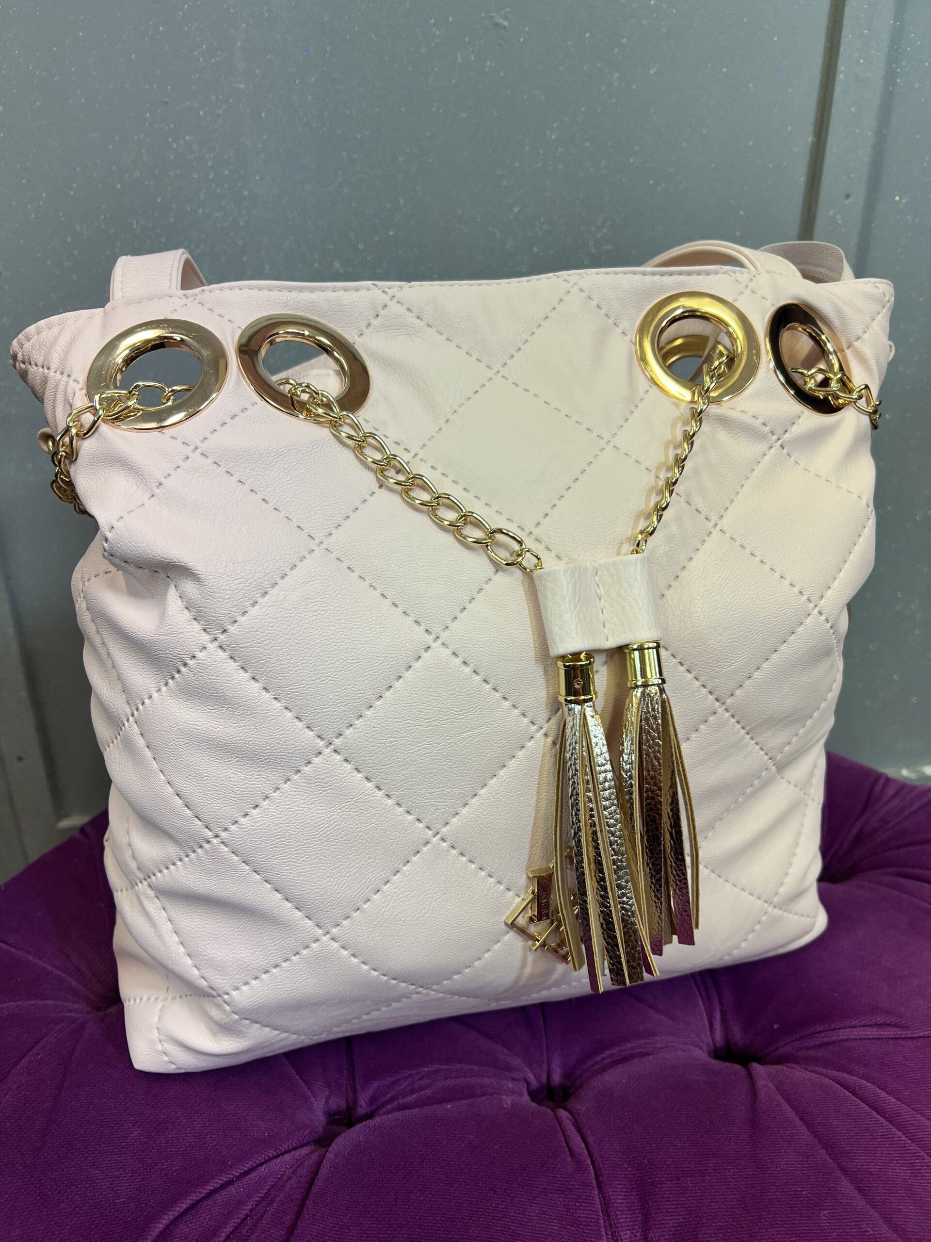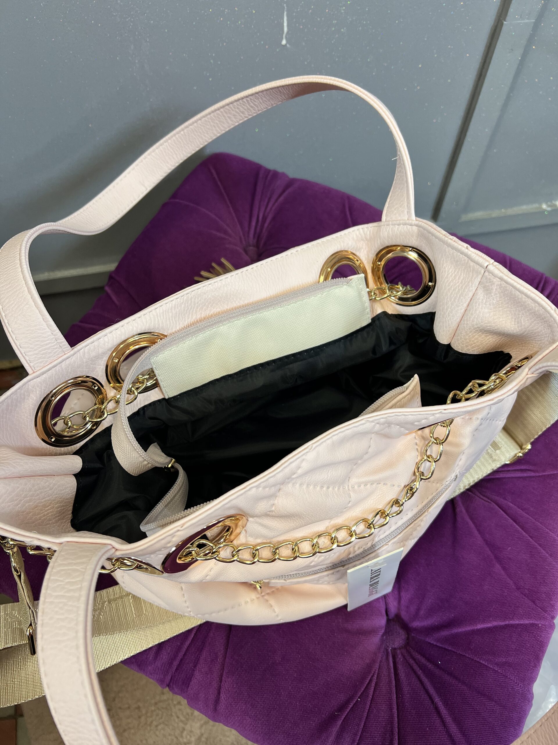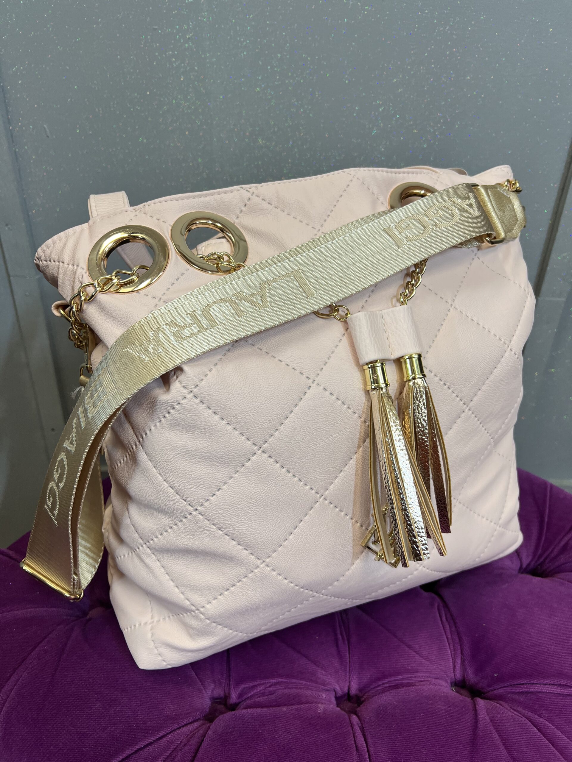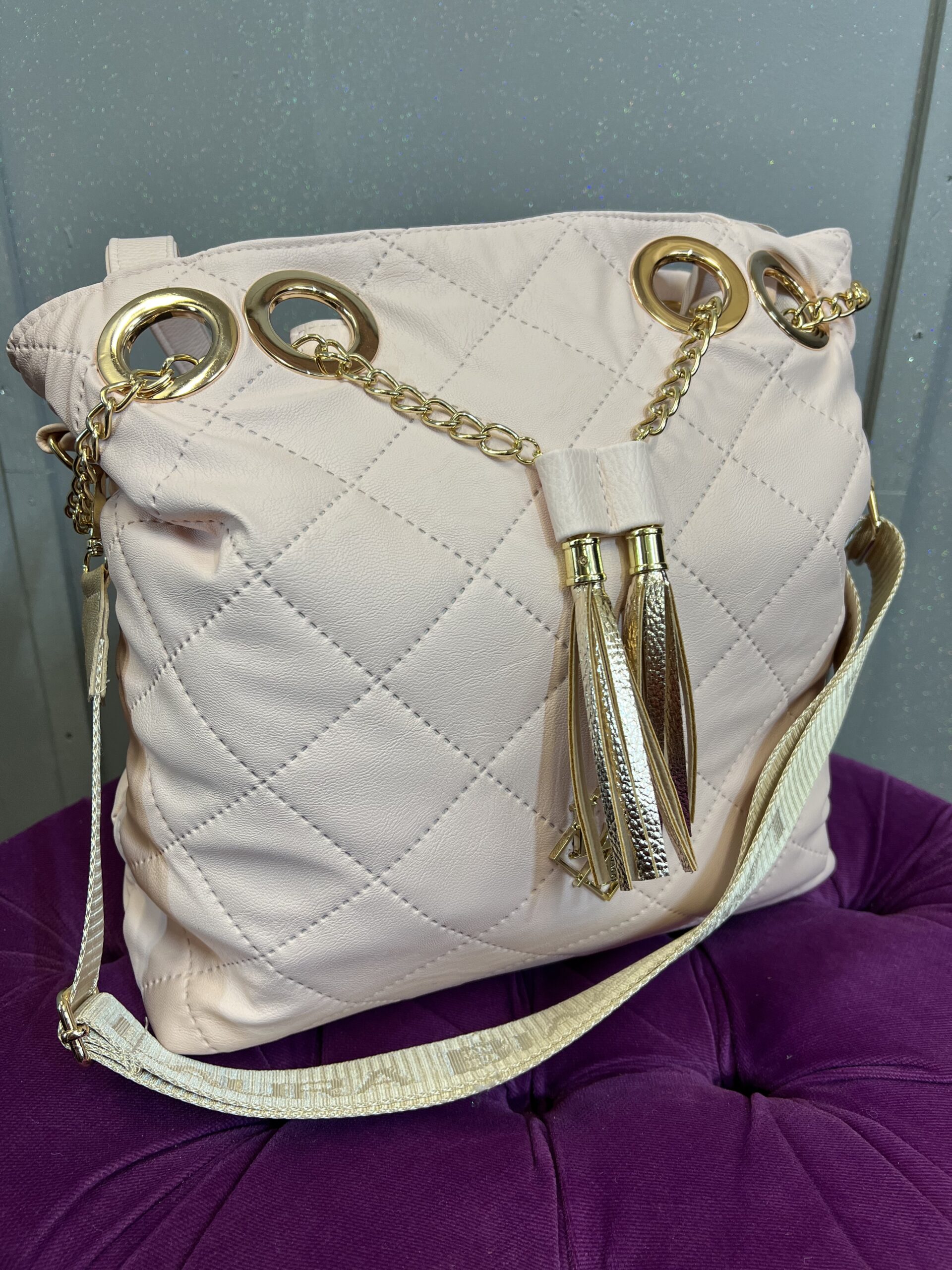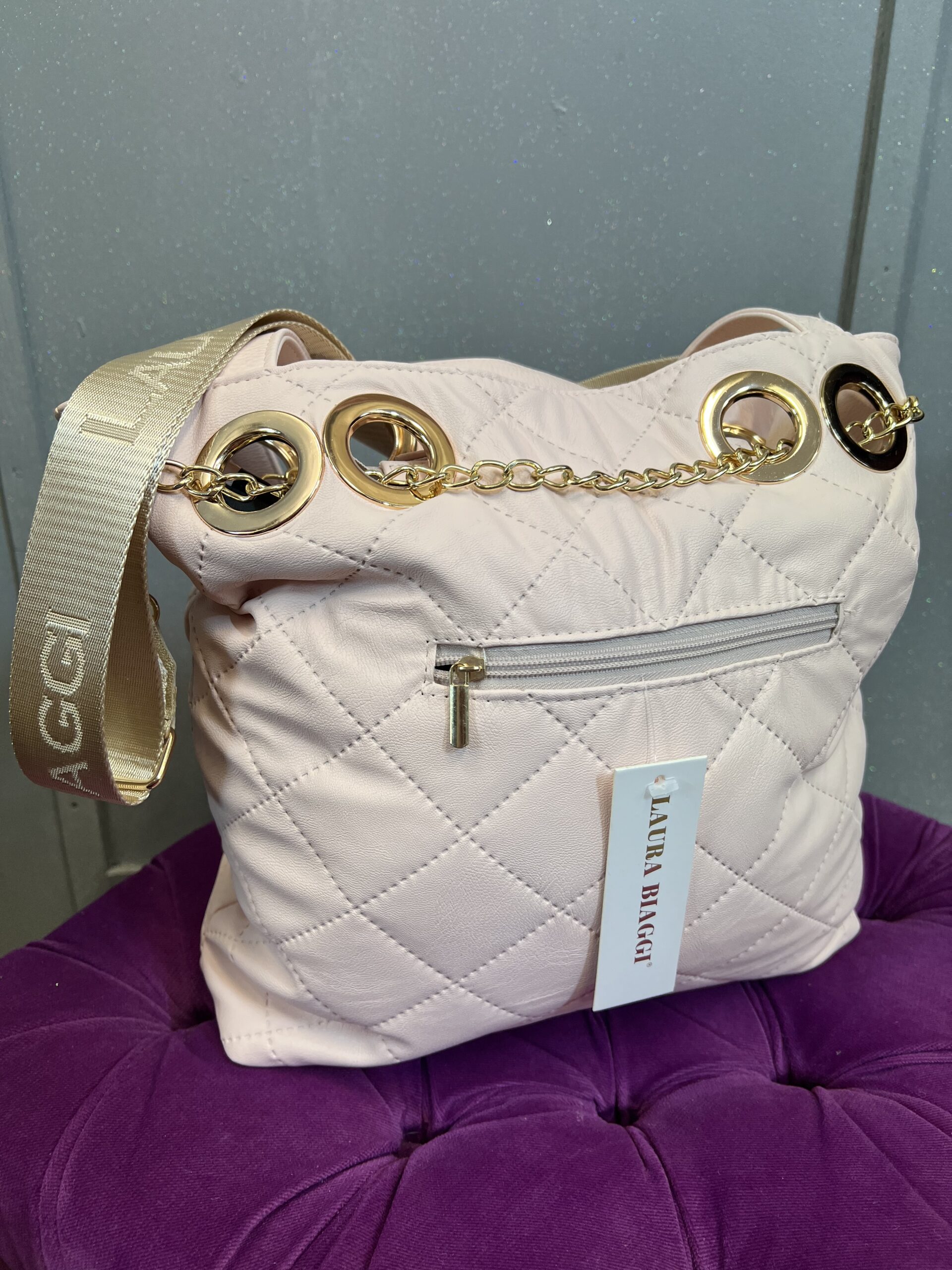 Torebka worek renomowanej polskiej firmy Laura Biaggi z najnowszej kolekcji. Wykonana została ze skóry naturalnej. Dzięki czemu idealnie nadaje się do pracy jak i codziennego korzystania. Jest łatwa w czyszczeniu i odporna na przetarcia i zarysowania. Mieści format A4, jest lekka i bardzo wygodna. Posiada szeroki ,sportowy i długi pasek, który zapewnia wygodne noszenie. Złote okucia i pikowanie dodają elegancji i szyku dla ponadczasowego pudrowego różu. W jej wnętrzu znajdziemy jedną główną komorę ,w której wyróżniamy po bokach dwie kieszenie ,jedna zamykana na zamek oraz druga otwarta. Całości dopełnia elegancka dość spora kieszonka na zamek mieszcząca się z tyłu, oraz ozdobny złoty łańcuszek z frędzlami.