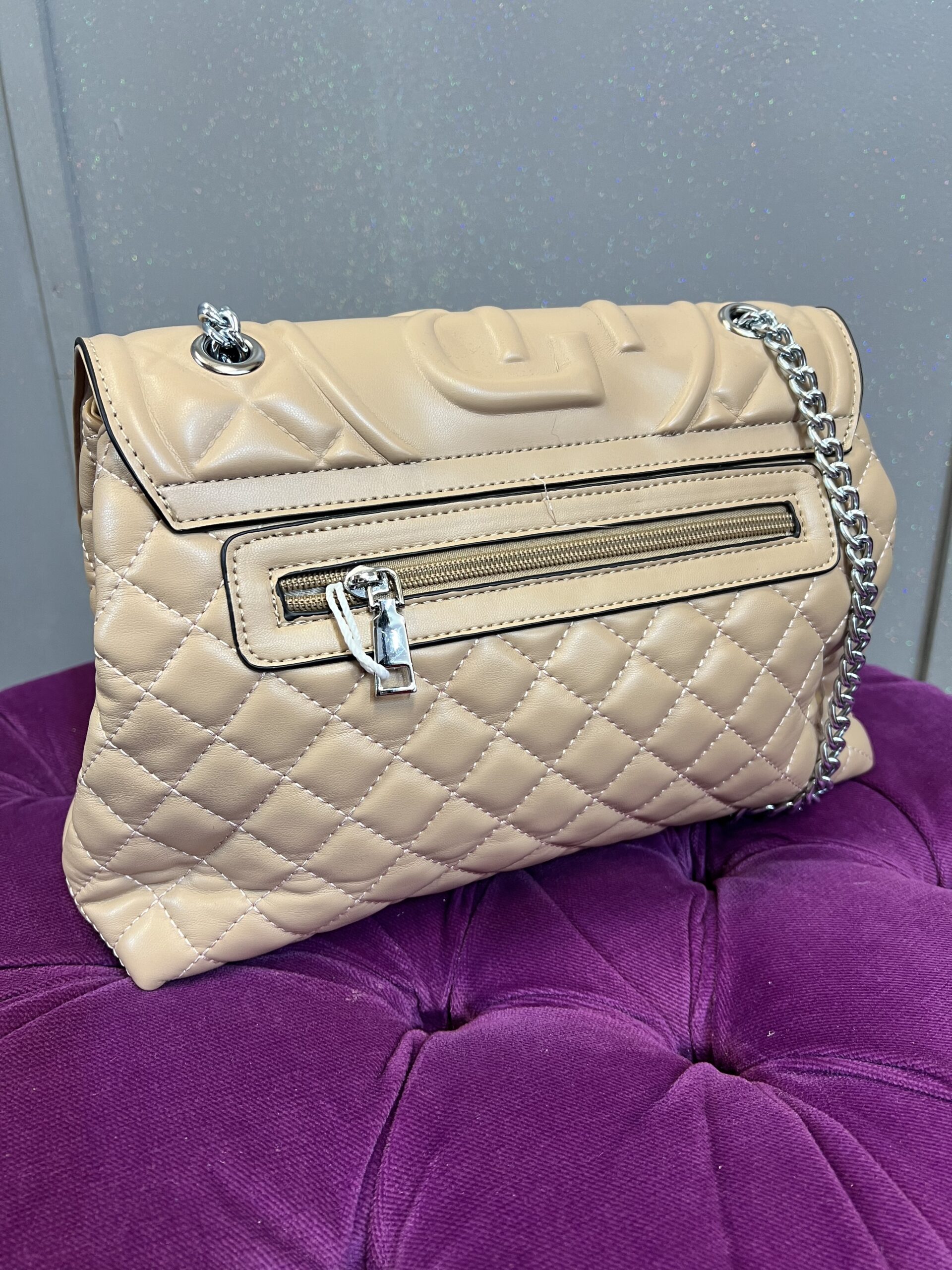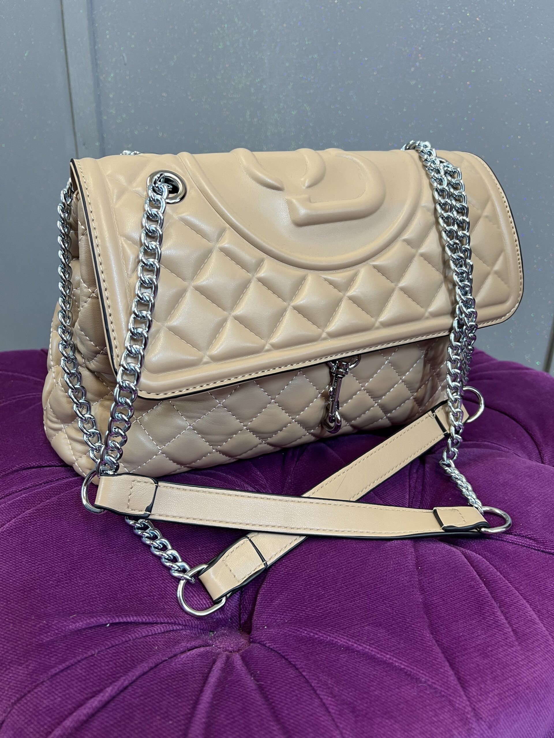 Torebka z ekoskóry w kolorze beżowym świetnie się sprawdzi do użytku codziennego i biznesowego. Składa się z jednej komory zapinanej na suwak na tyle torebki znajdziemy kieszeń. klapa torebki zapinana na karabińczyk. Torebka posiada regulowany srebrny łańcuszek, który umożliwia nam noszenie torebki w dłoni i na ramieniu. całości dopełnia ładny pikowany wzór.