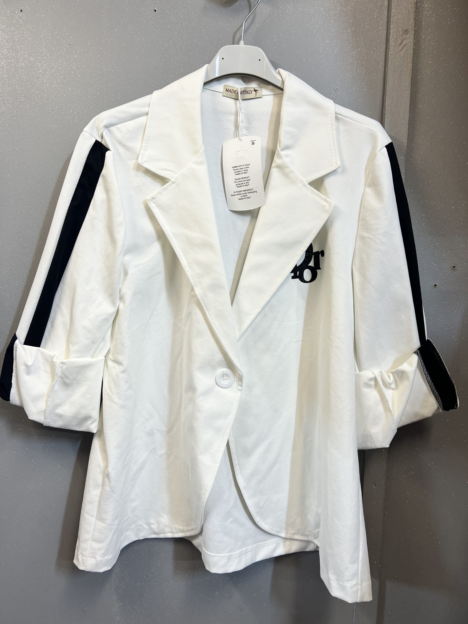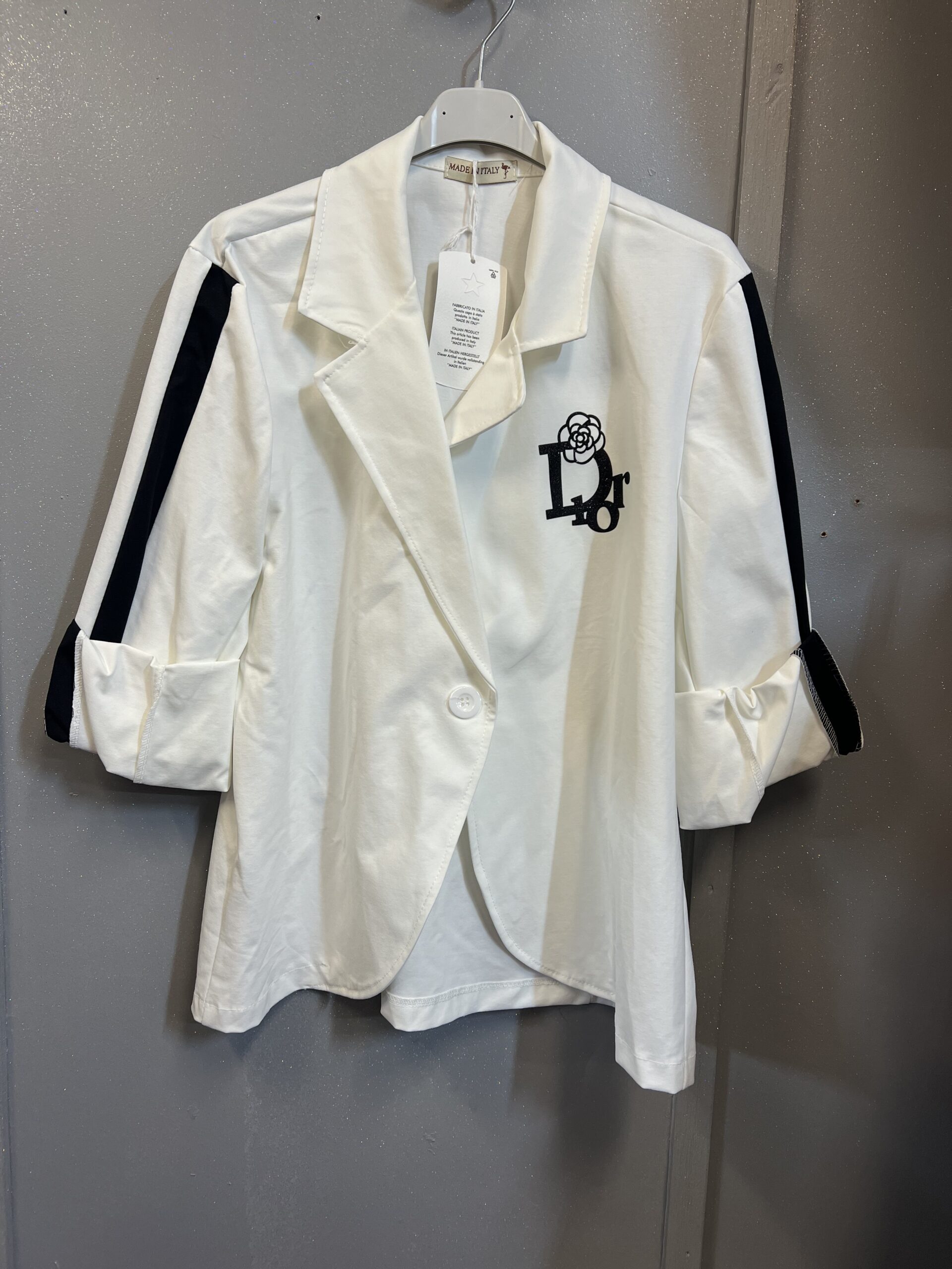 Żakiet biały z dodatkiem materiału w kolorze czarnym na przodzie wzór Dior wraz z kwiatkiem, pod szyja kołnierz oraz lampasy na rękawach w tym samym materiale czerni. Żakiet bawełniany wygodny i idealnie pasuje do bluzki oraz spodni tej samej serii zamieszonych na naszej stronie. Sprawdzi się świetnie na co dzień do pracy. Styl sportowy i elegancki.