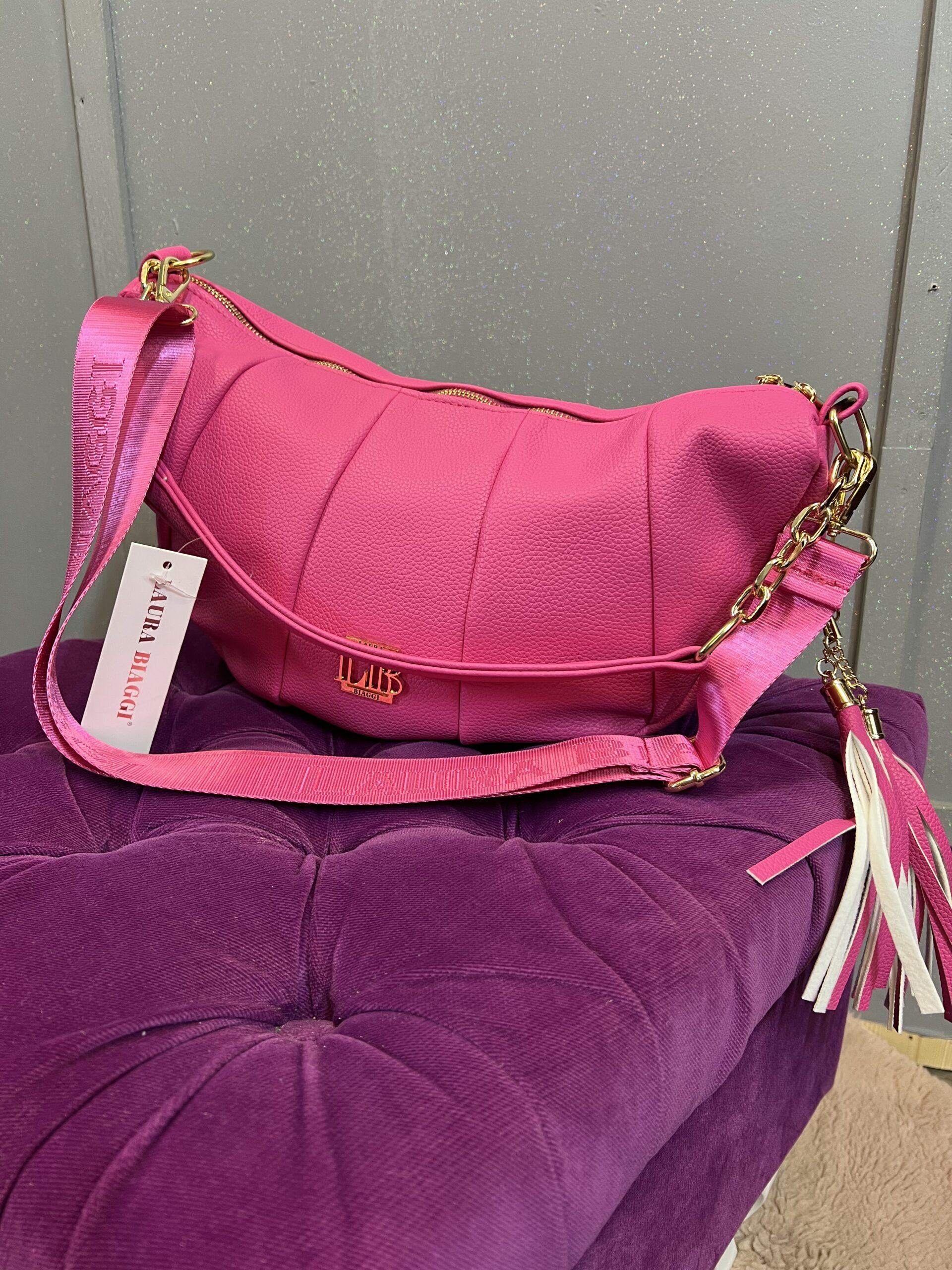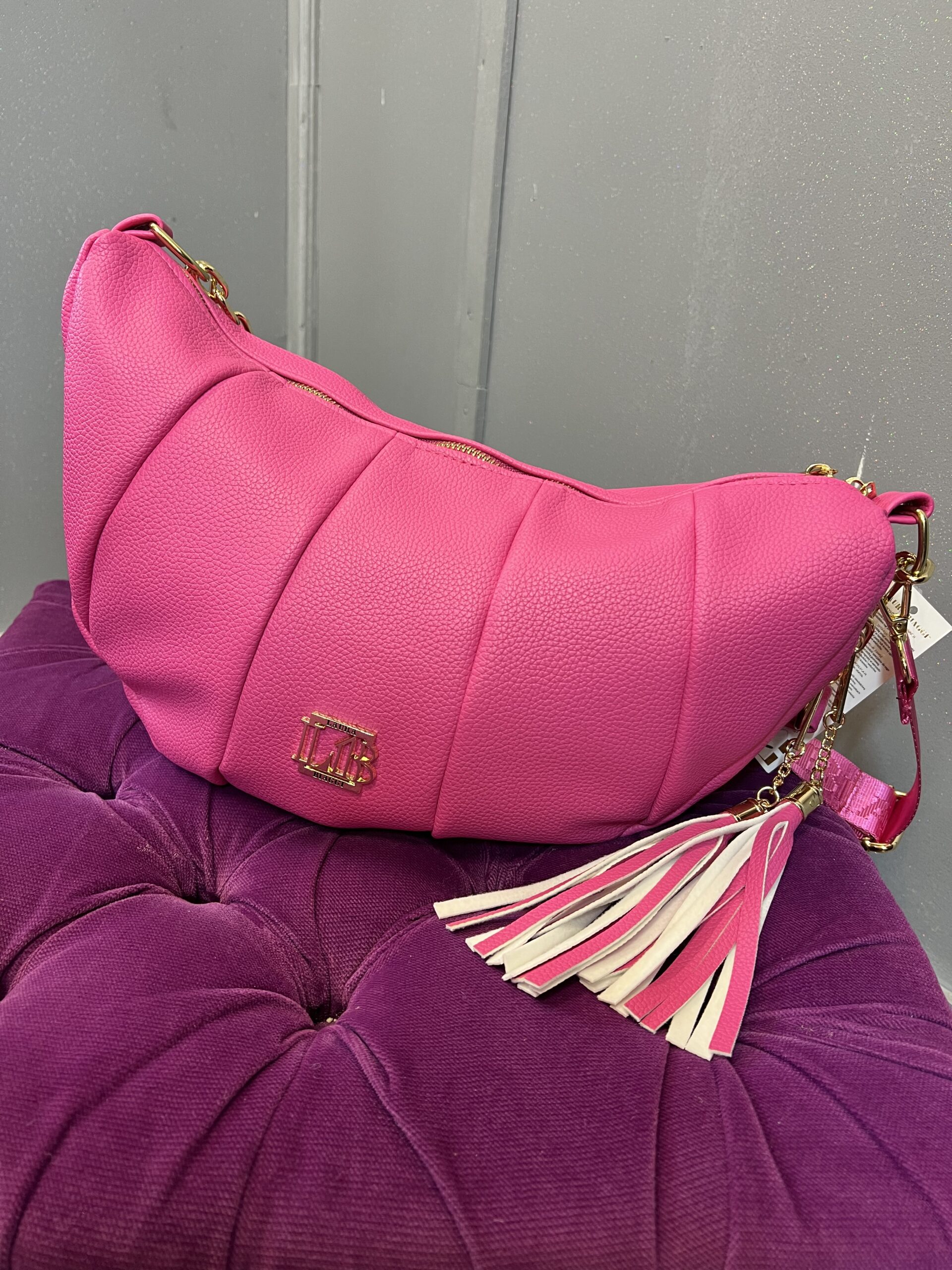 Elegancka i stylowa torebka damska w kształcie półksiężyca. Wykonana ze skóry litej. Wnętrze torby składa się z jednej komory i małej kieszonki zapinanej na zamek, która znajduje się na tylnej ściance. Wyposażona w złote okucia i elegancie frędzle. Posiada również dwa paski, które bez problemu można wymieniać. Uniwersalna idealna na każdą okazję.