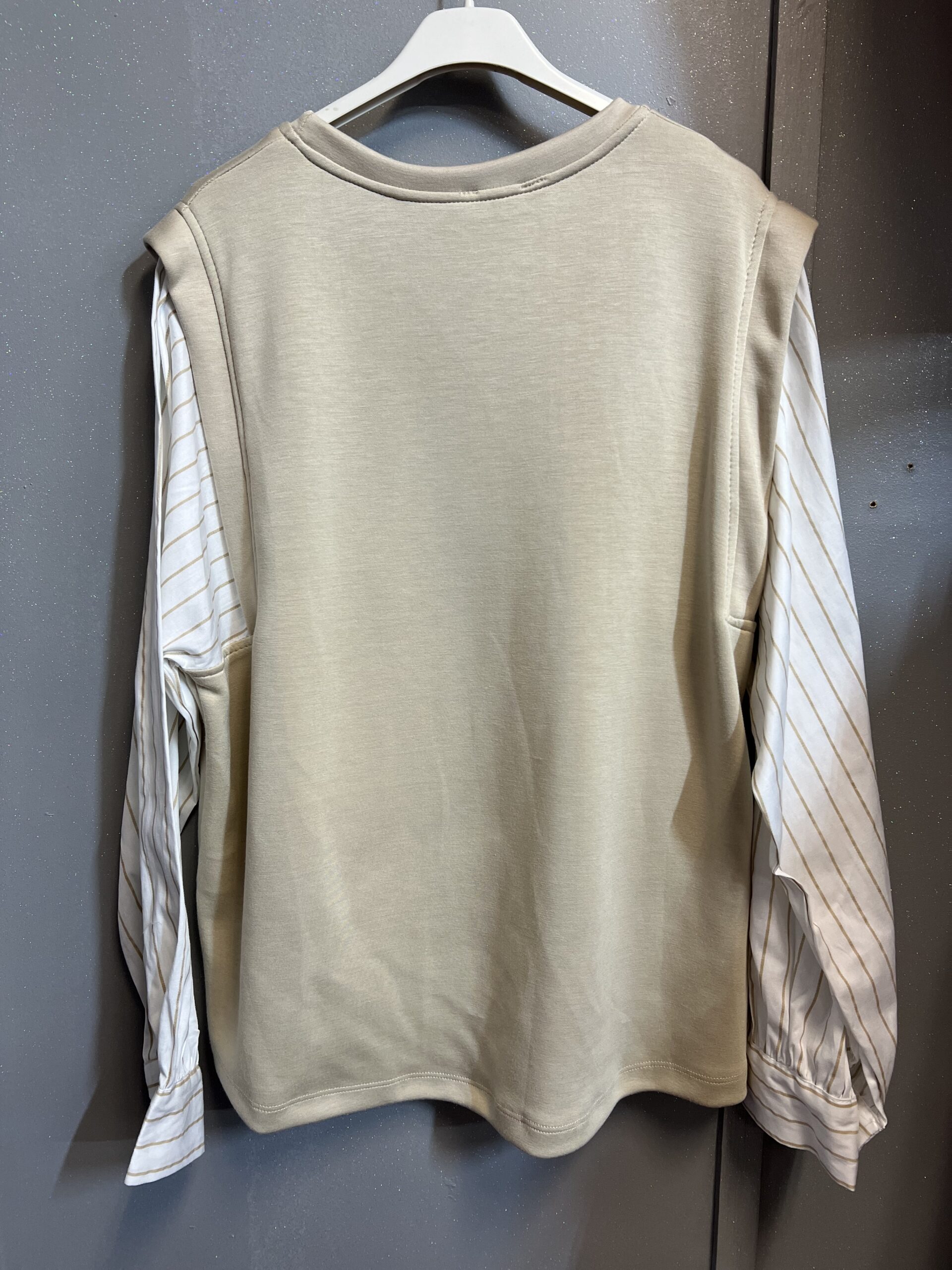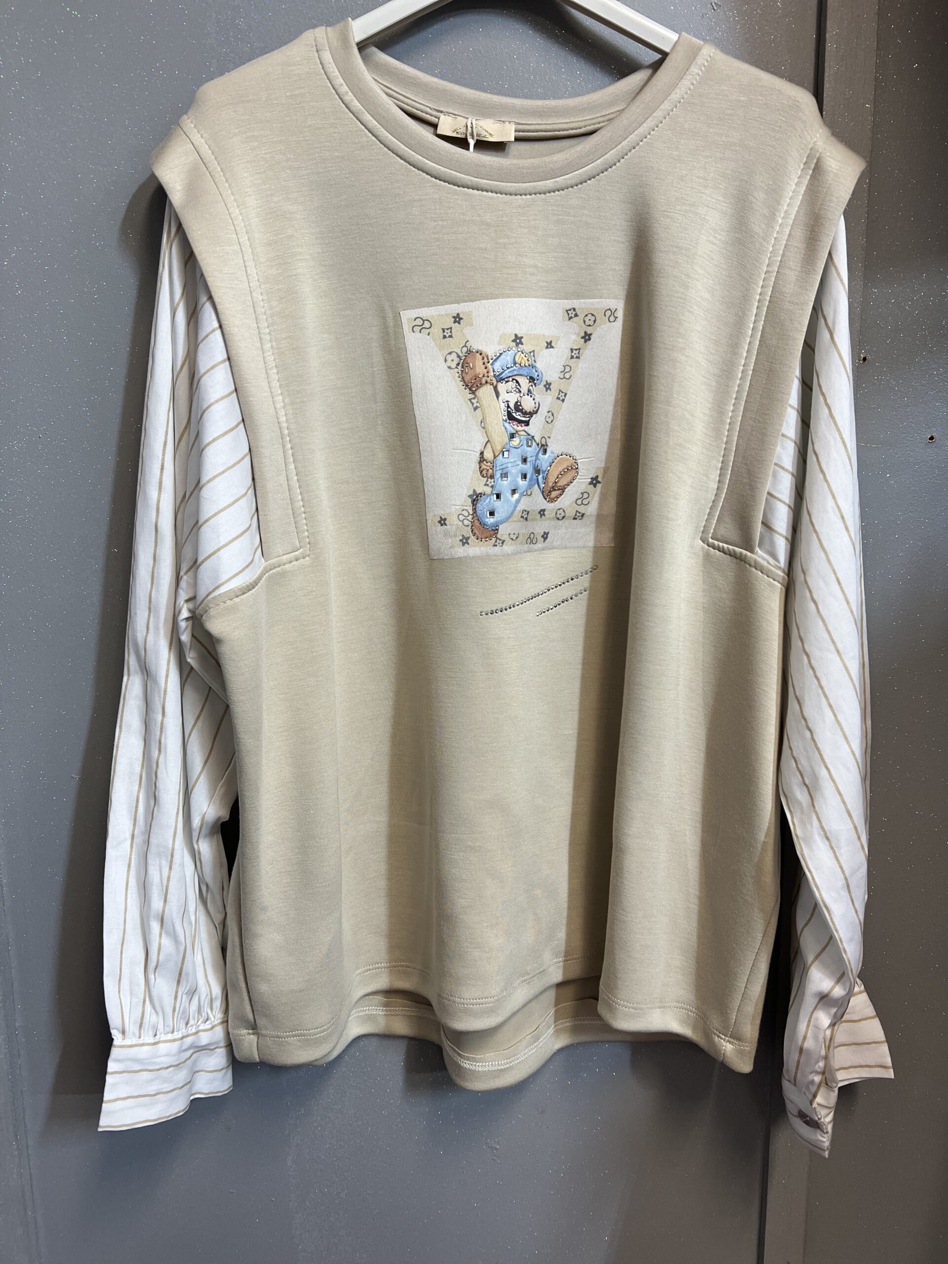 Bluzka materiał masełko w klasycznym beżowym kolorze z rękawami koszulowymi zakończonymi mankietami i beżowymi paskami. Przód bluzki zdobi wizerunek Mario ,tył całkowicie gładki. Idealna do pracy na co dzień .Noszona elegancko i na sportowo.