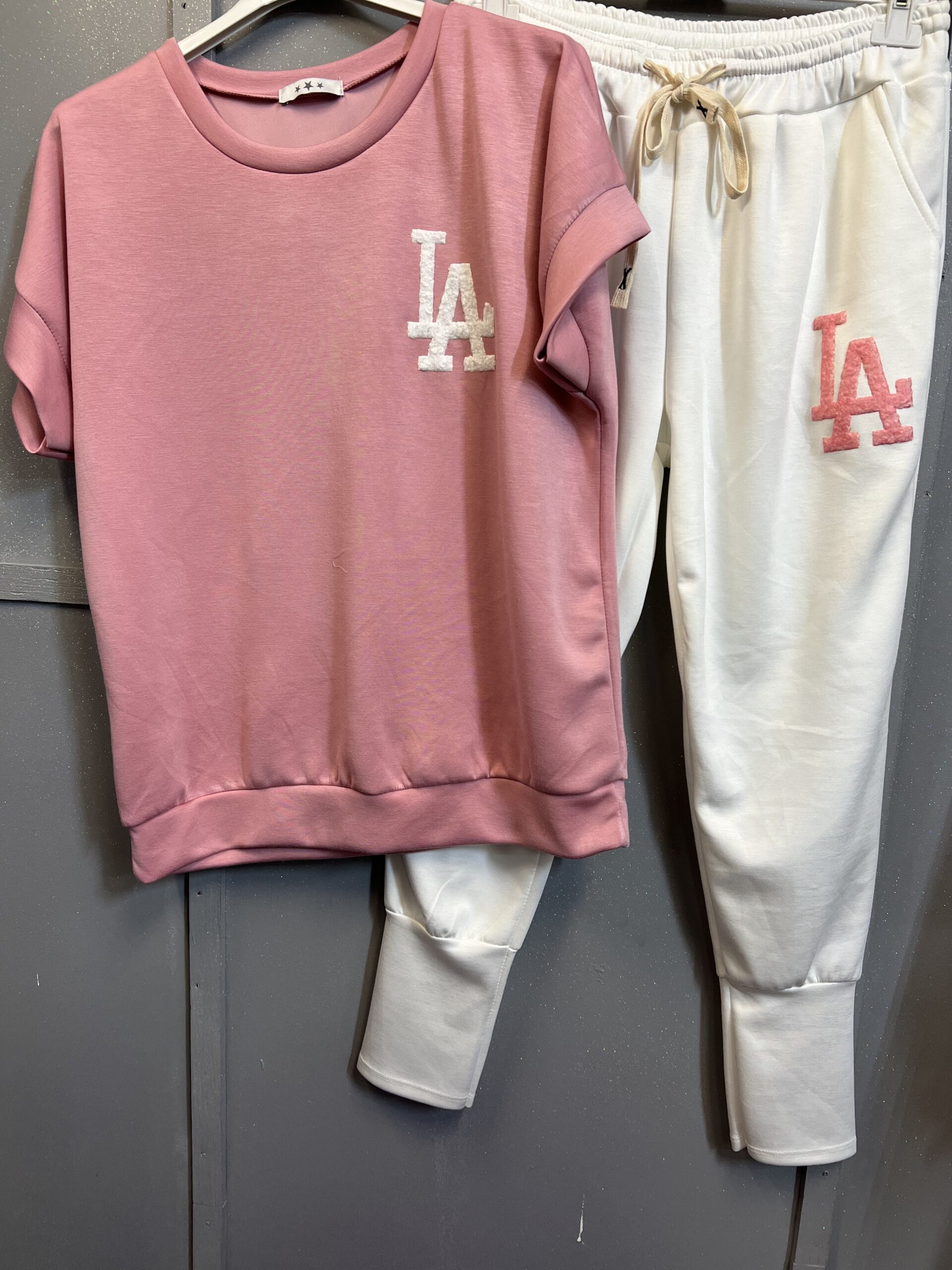 Dres składający się z bluzki na krótki rękaw i spodni .Materiał masełko w kolorze różowym zdobiony w odcieniu bieli literami ,,LA” naszytymi na przodzie bluzki ,oraz różowym na jednej z nagawek .Tył bluzy i spodni jest całkowicie gładki ,góra spodni zakończona gumką ze ściągaczem oraz sznurkiem dół spodni lekko zwężany w krój alladynek . Dres bardzo wygodny ,idealnie sprawdzi się na co dzień.