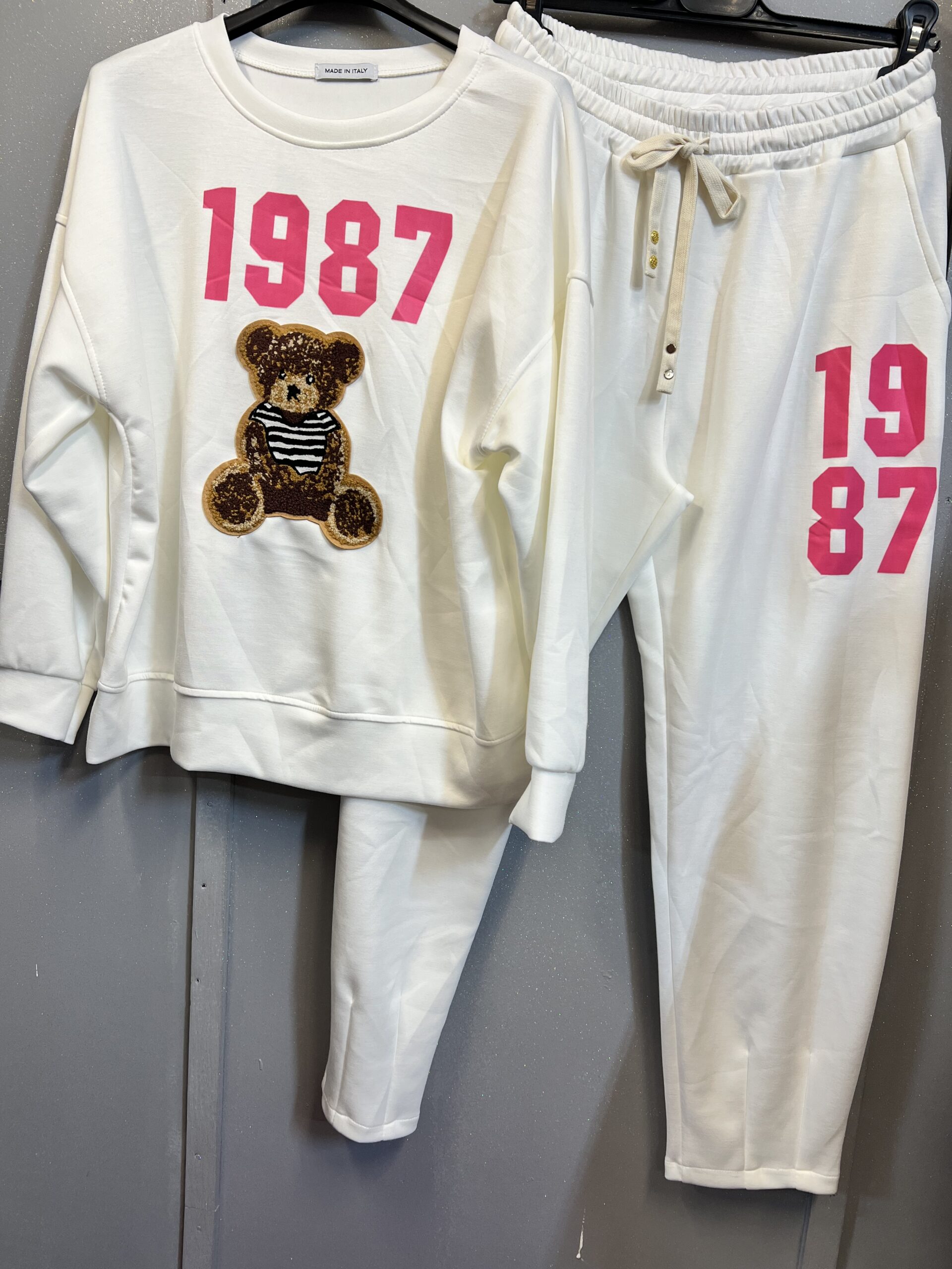 Dresy w białym kolorze z różowym naszywanym napisem 1987 i brunatnym misiem na przodzie bluzy oraz na lewej nogawce spodni samego napisu . Bluza zakończona na rękawach ściągaczami. Spodnie dół prosty ,góra ściągacz na gumkę ze sznurkiem oraz kieszenie . Dresy lekkie i delikatne .Idealne na co dzień i do pracy. Bardzo fajni62e wygląda w zestawie z bomberką.