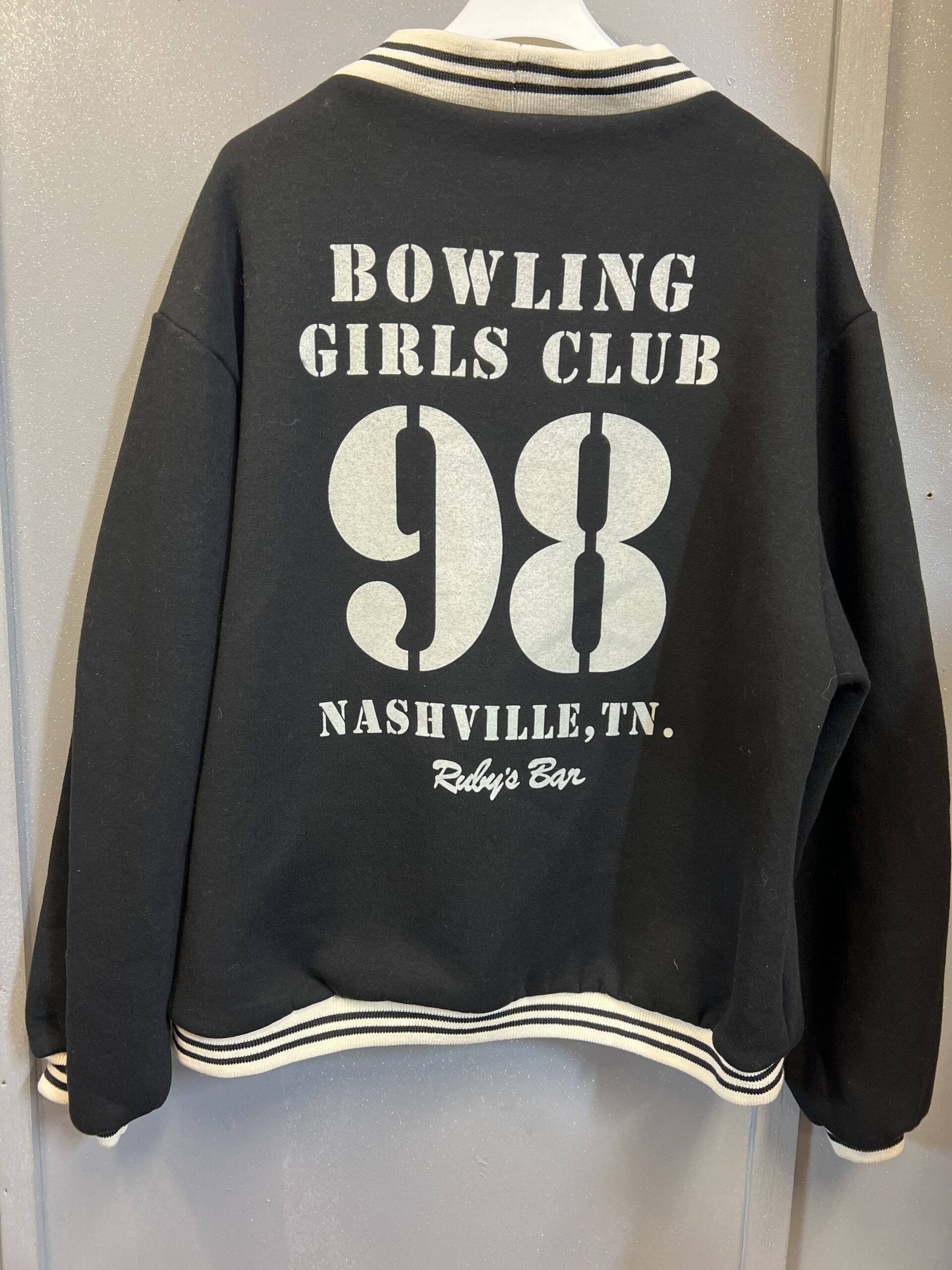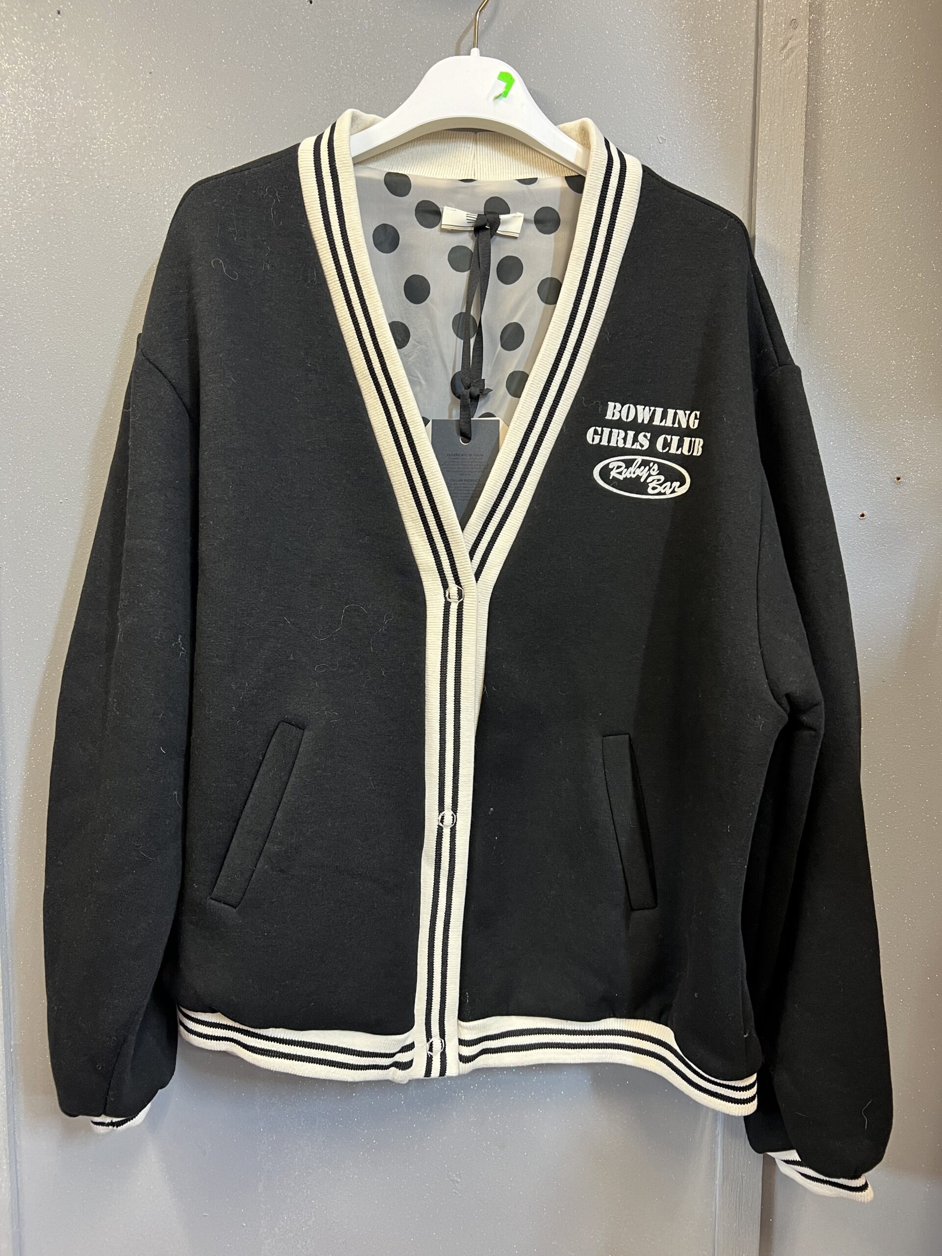 Kurtka bomberka w kolorze czarnym z logo po lewej stronie , lamówkami i guzikami oraz kieszeniami .Tylna strona kurtki z napisem oraz dużą cyfrą 98.Kurtka świetnie pasuje do dresów jeansów ,każdego rodzaju płaskiego obuwia .Sprawdzi się świetnie na co dzień i do pracy.