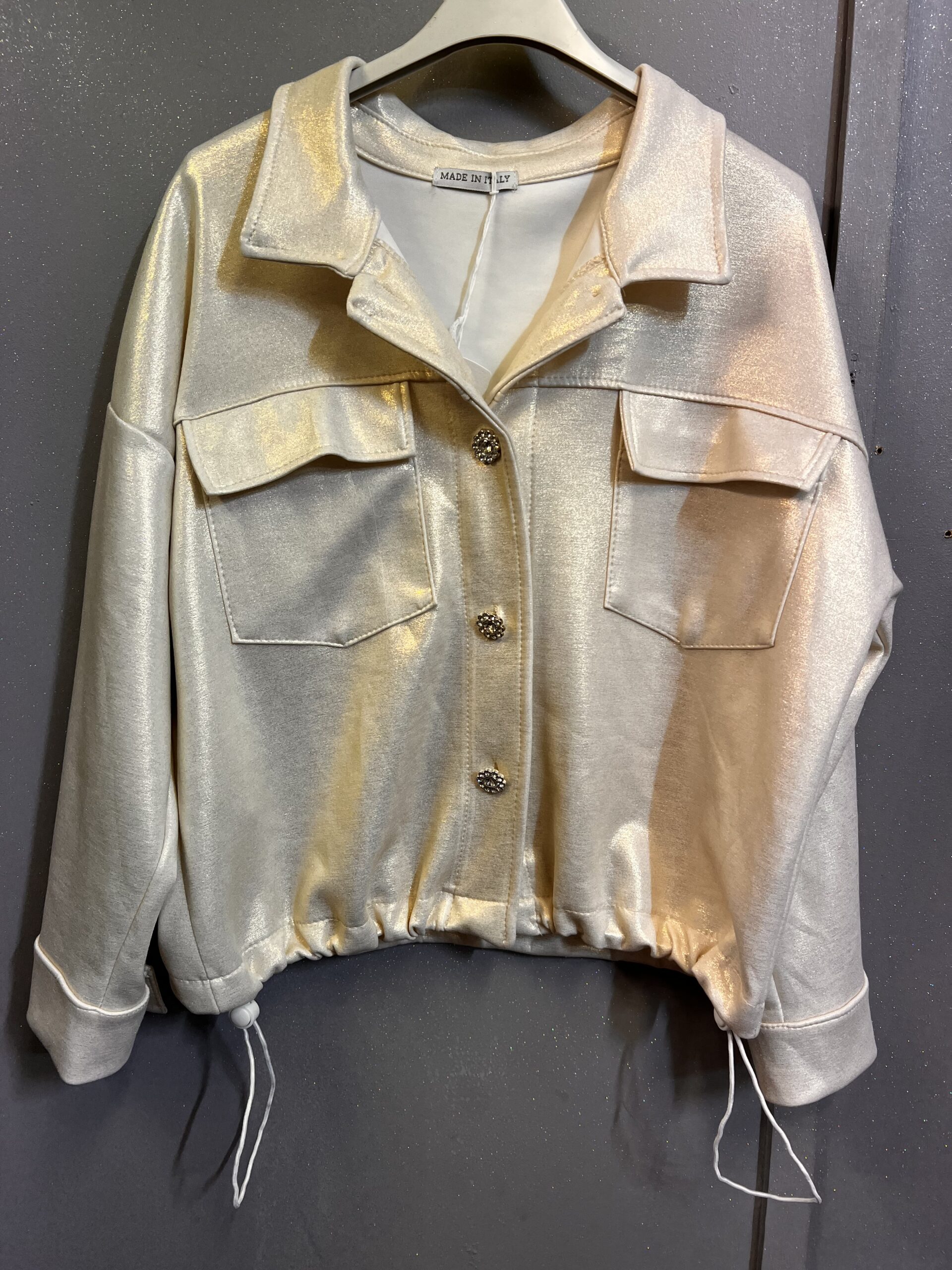 Kurtka w złotym kolorze. Pod szyją dekolt z kołnierzykiem. Rękawy zakończone tym samym materiałem w złotym kolorze z guzikiem na mankietach. Na przodzie po obu stronach dwie kieszenie z klapkami oraz kryształkowymi guzikami w kształcie kwiatka . Tył jest gładki ,dół zakończony ściągaczem . Idealna na co dzień do spodni i spódnicy .Można ją nosić jako bluzę .
