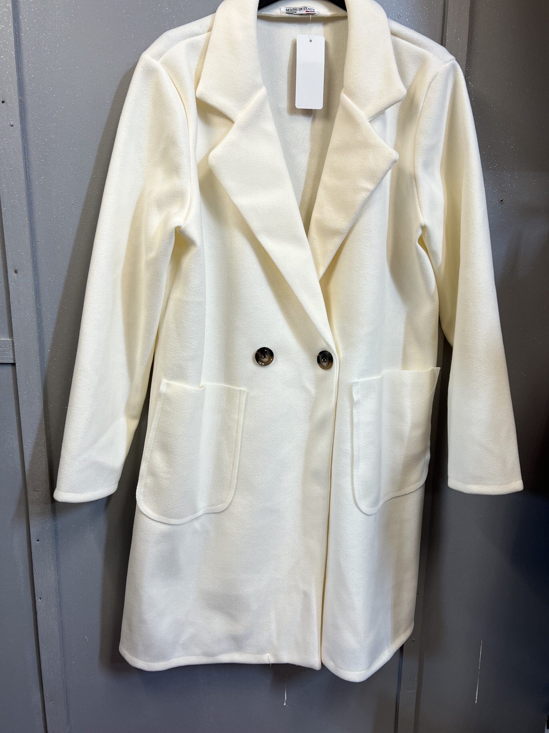 Płaszcz w kolorze śmietankowym w materiale tzw. flausz , z dwiema dużymi kieszeniami na przodzie oraz dwoma guzikami do zapięcia dwurzędowego. Całość ,przód i tył całkowicie gładki. Delikatny i swobodny do noszenia .Idealny na co dzień , do pracy i wyjścia okolicznościowe. Sprawdzi się w zestawie ze spodniami, spódnicą czy sukienką i przy każdego rodzaju obuwia.