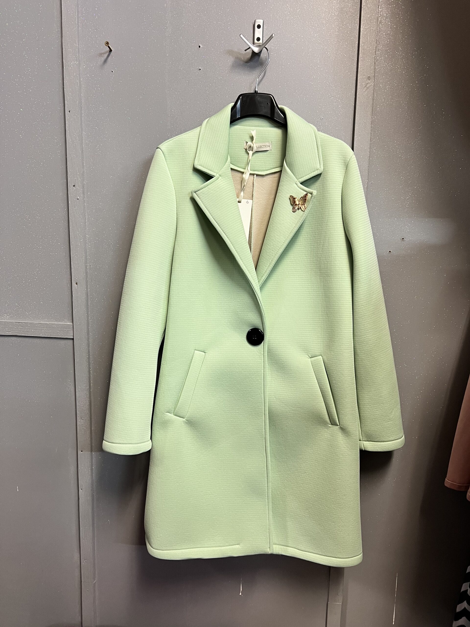 Płaszcz w kolorze miętowym w materiale tzw. pianki , ze zdobieniem na przodzie w postaci przypiętego złotego motyla na klapie po lewej stronie .Płaszcz ma dość głębokie kieszenie oraz duży guzik do zapięcia płaszcza. Całość ,przód i tył w delikatne prążki poprzeczne. Delikatny i swobodny do noszenia .Idealny na co dzień , do pracy i wyjścia okolicznościowe. Sprawdzi się w zestawie ze spodniami, spódnicą czy sukienką i przy każdego rodzaju obuwia.