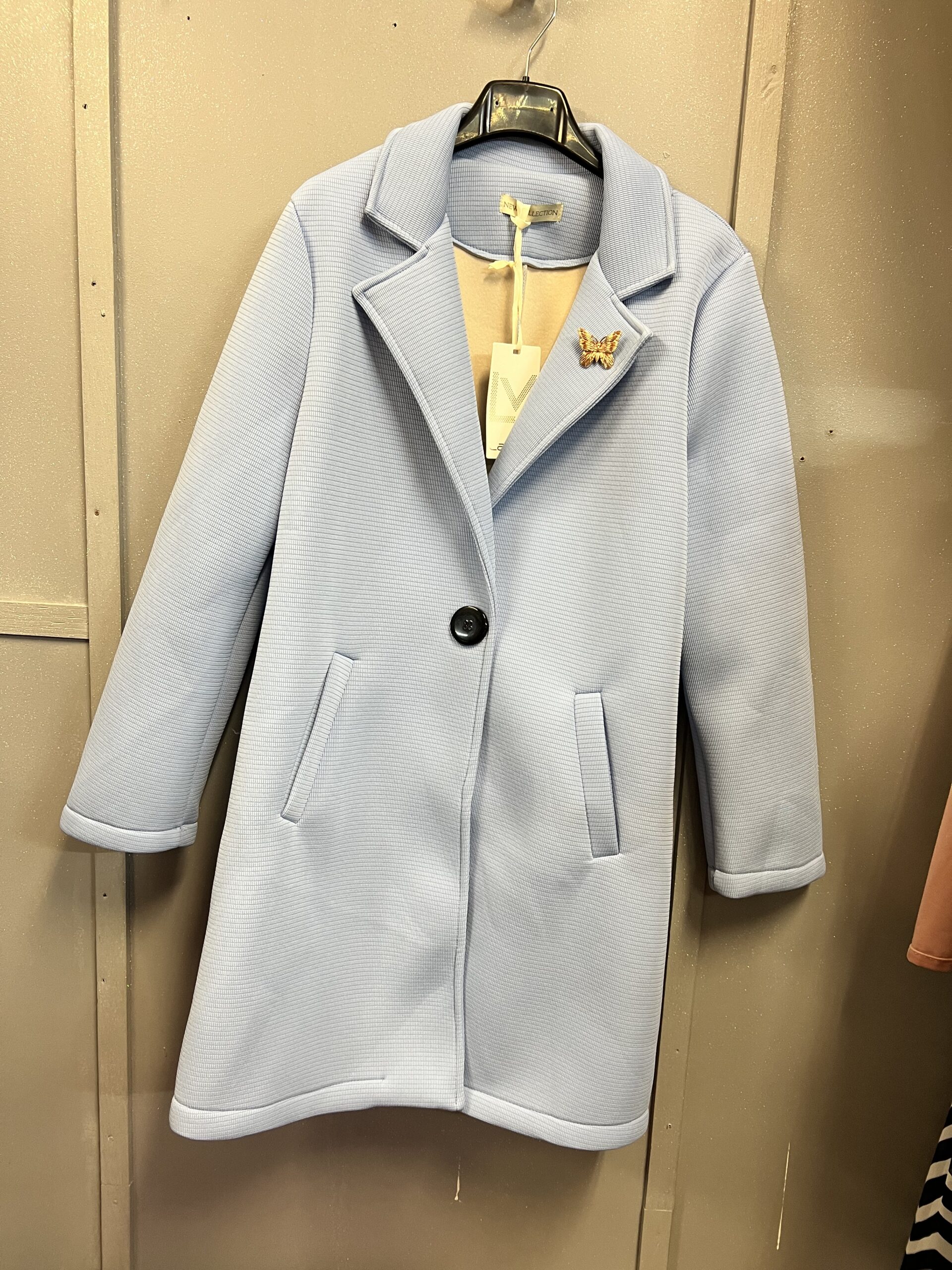 Płaszcz w kolorze błękitnym w materiale tzw. pianki , ze zdobieniem na przodzie w postaci przypiętego złotego motyla na klapie po lewej stronie .Płaszcz ma dość głębokie kieszenie oraz duży guzik do zapięcia płaszcza. Całość ,przód i tył w delikatne prążki poprzeczne. Delikatny i swobodny do noszenia .Idealny na co dzień , do pracy i wyjścia okolicznościowe. Sprawdzi się w zestawie ze spodniami, spódnicą czy sukienką i przy każdego rodzaju obuwia.