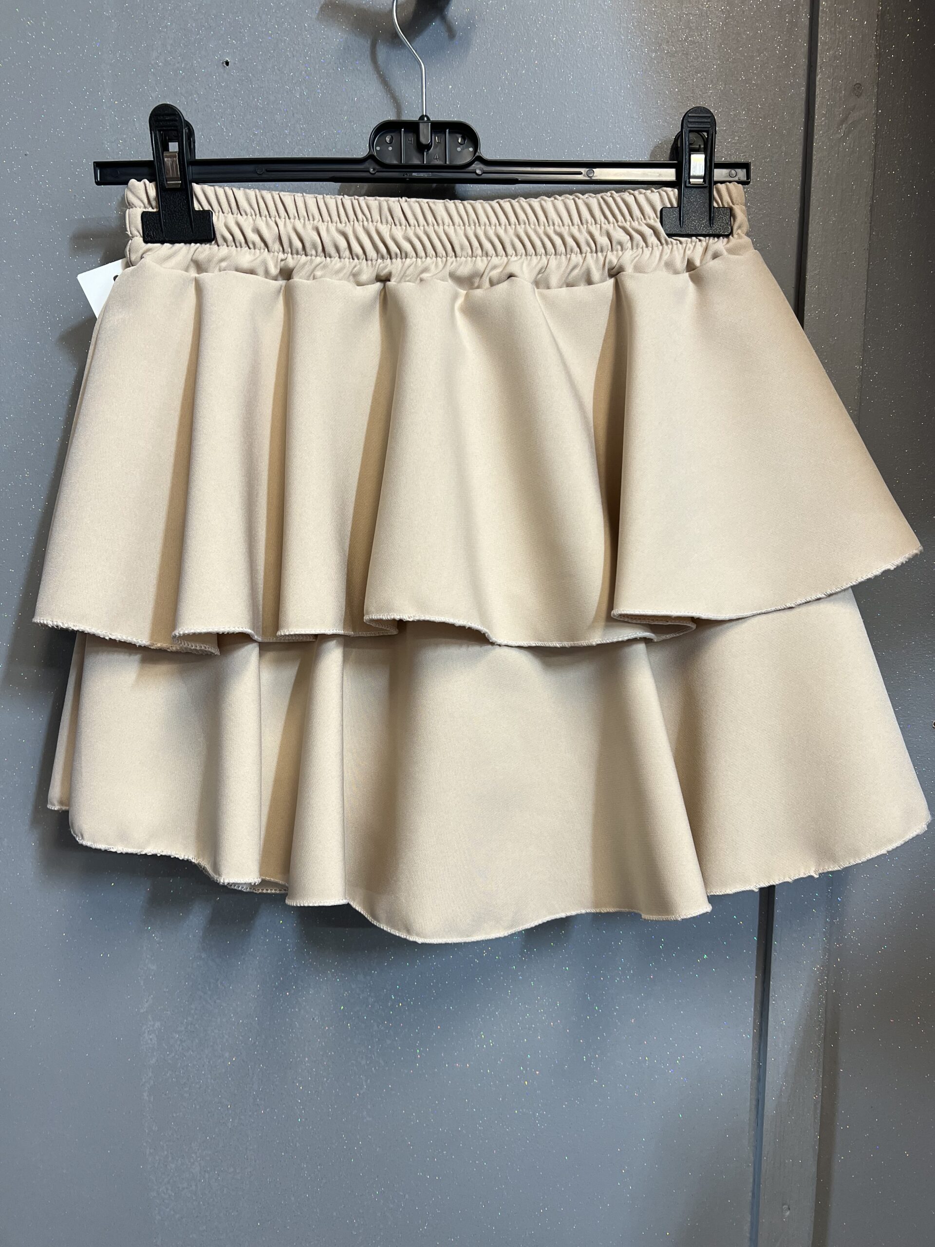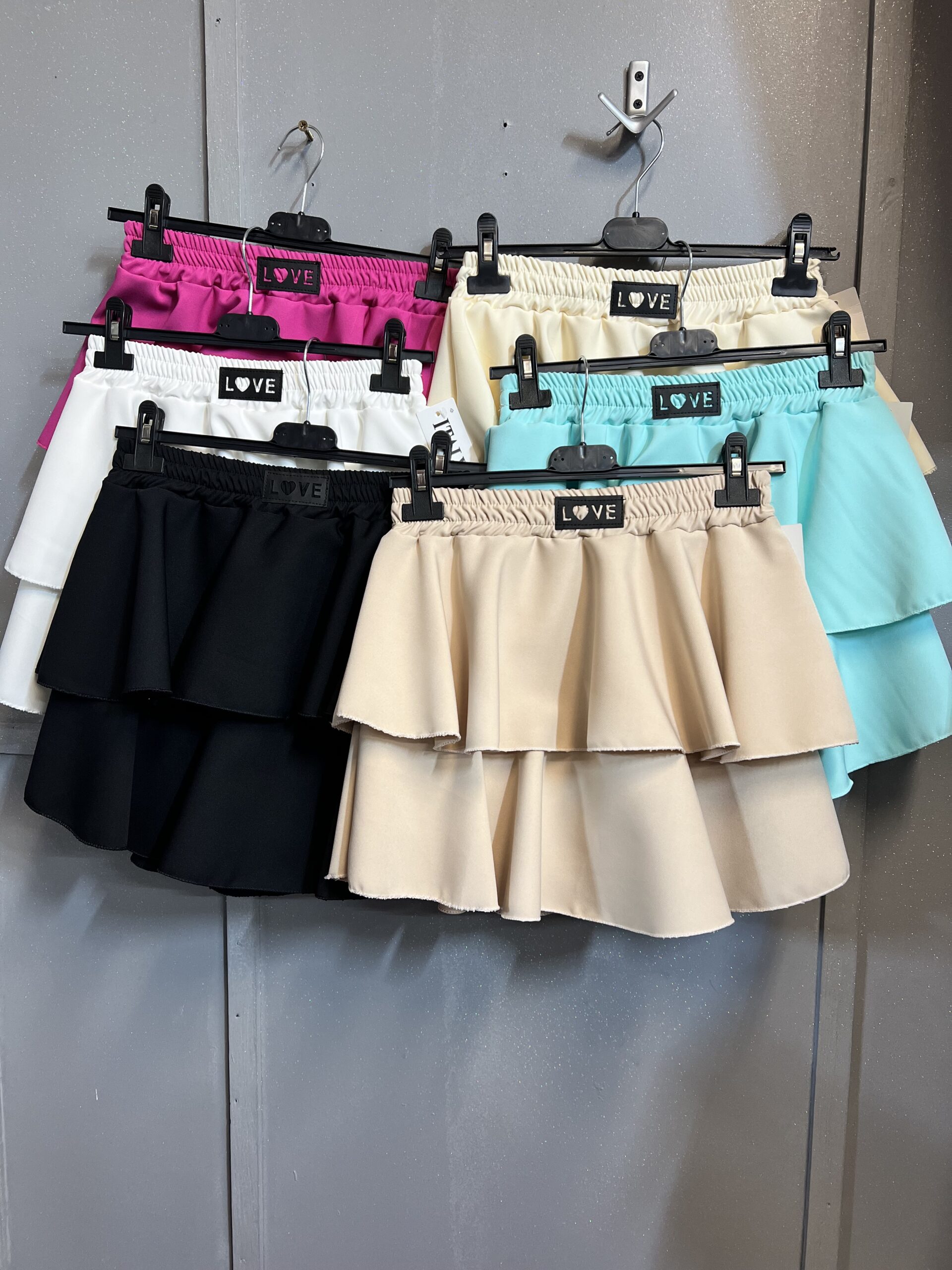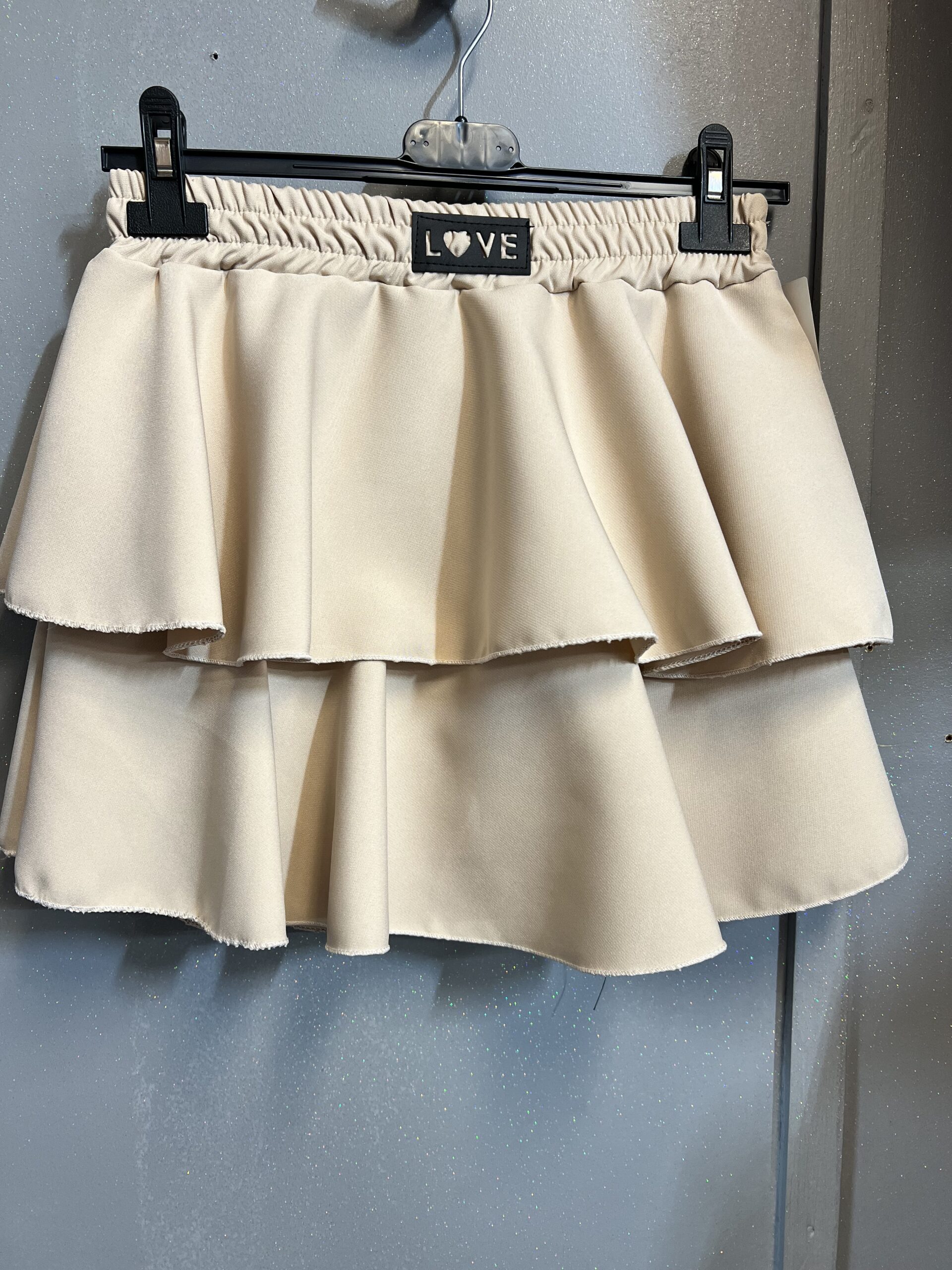 Spódnico-spodenki w kolorze beżu i dwiema falbanami nakładanymi na siebie w poprzek od góry do dołu po całości . Wewnątrz spódnicy znajdują się wszyte spodenki, Przód zdobiony naszywką z ekoskóry ,,LOVE,, na szerokiej gumie . Idealne na każdą okazję ,pogodę i obuwia .Sprawdzą się na lenie dni oraz chłodniejsze.