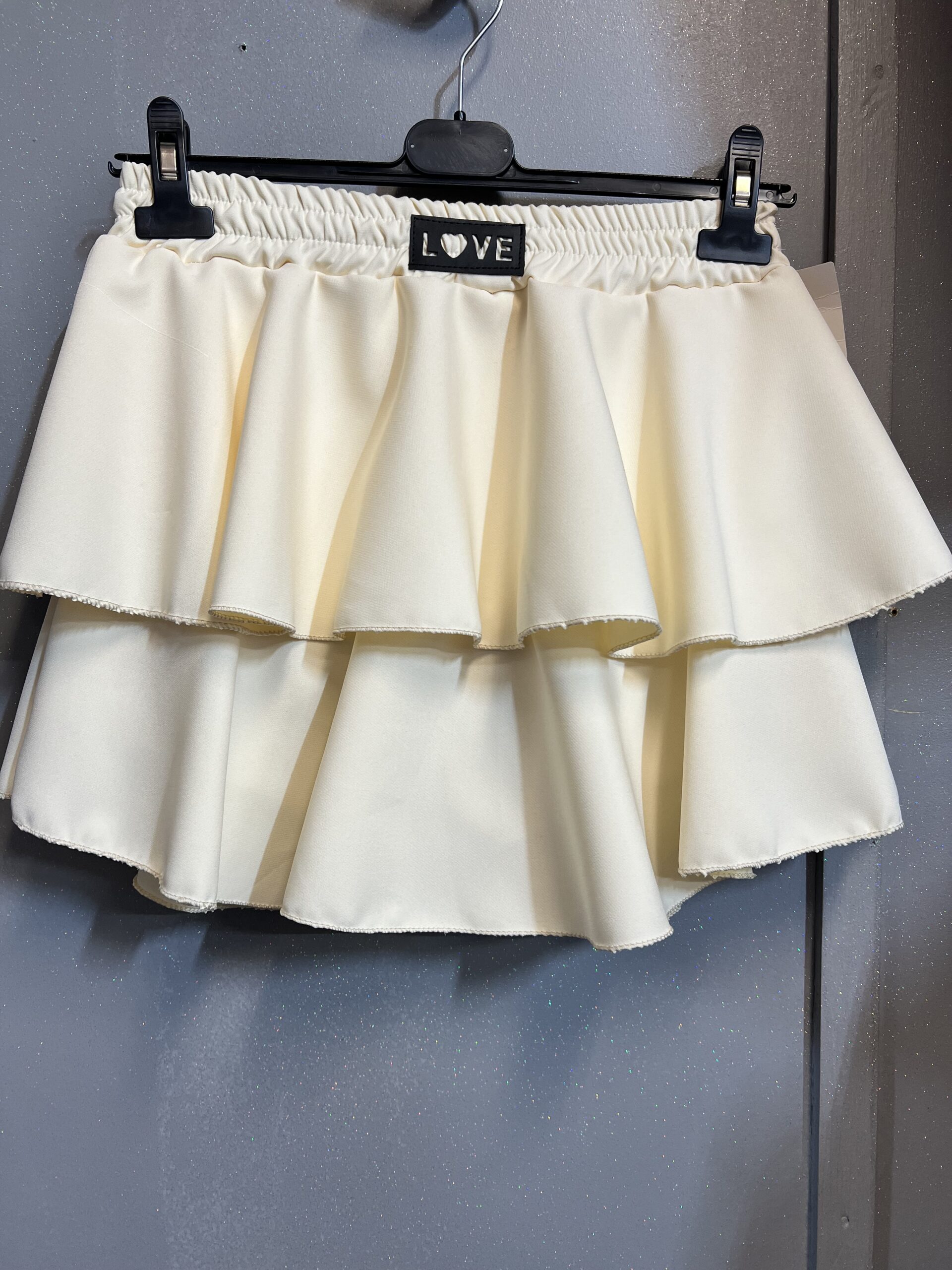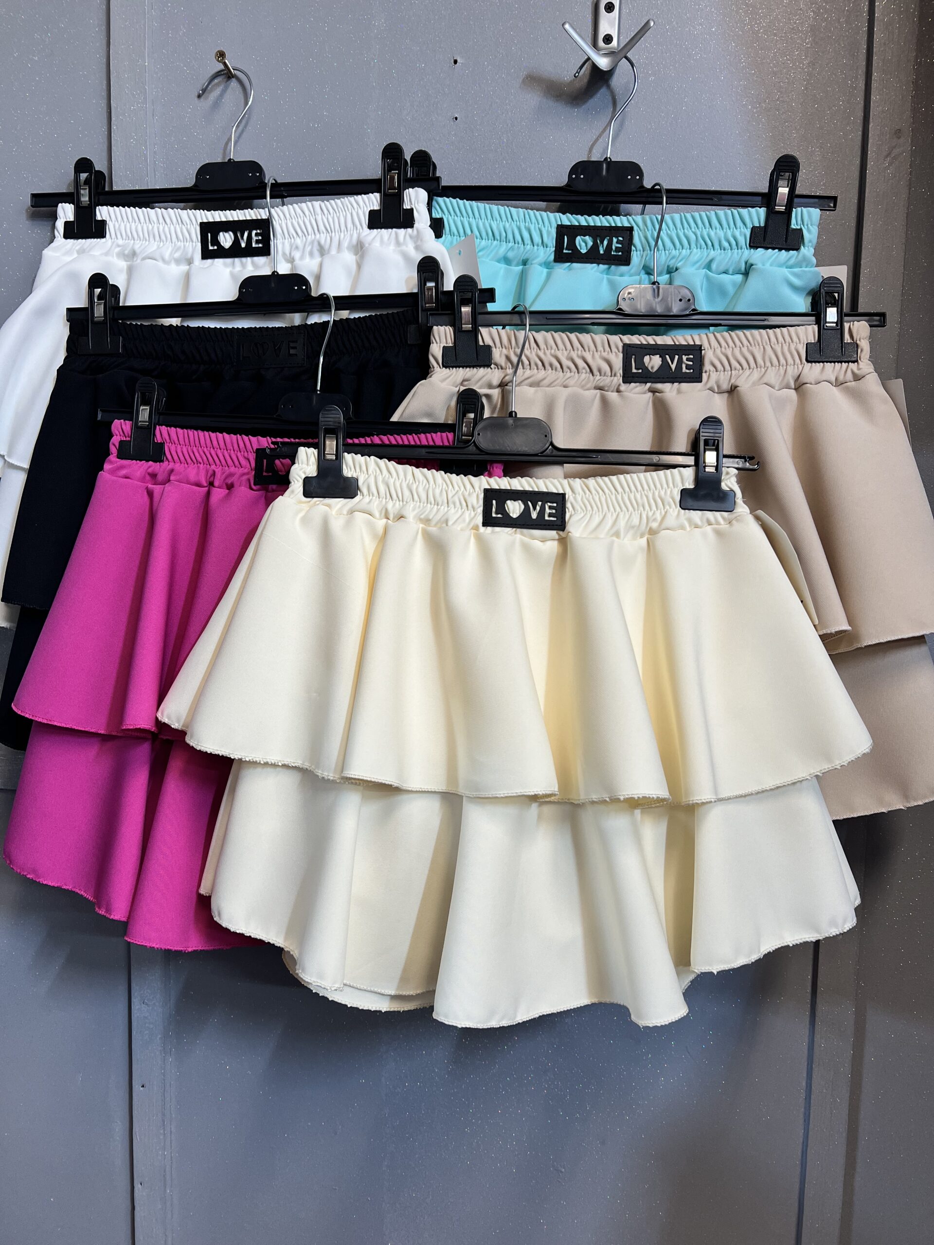 Spódnico-spodenki w kolorze brzoskwiniowym i dwiema falbanami nakładanymi na siebie w poprzek od góry do dołu po całości . Wewnątrz spódnicy znajdują się wszyte spodenki, Przód zdobiony naszywką z ekoskóry ,,LOVE,, na szerokiej gumie . Idealne na każdą okazję ,pogodę i obuwia .Sprawdzą się na lenie dni oraz chłodniejsze.