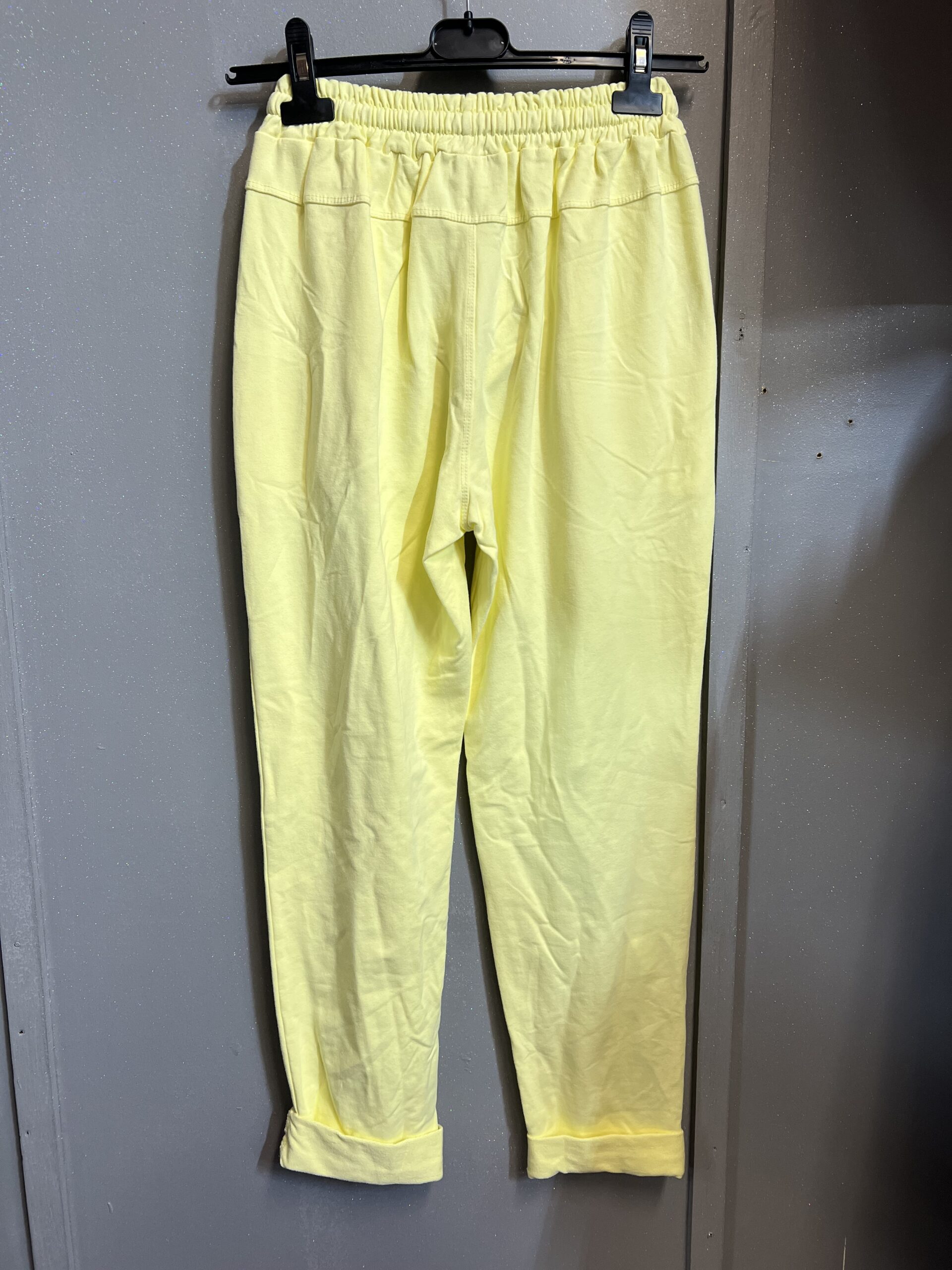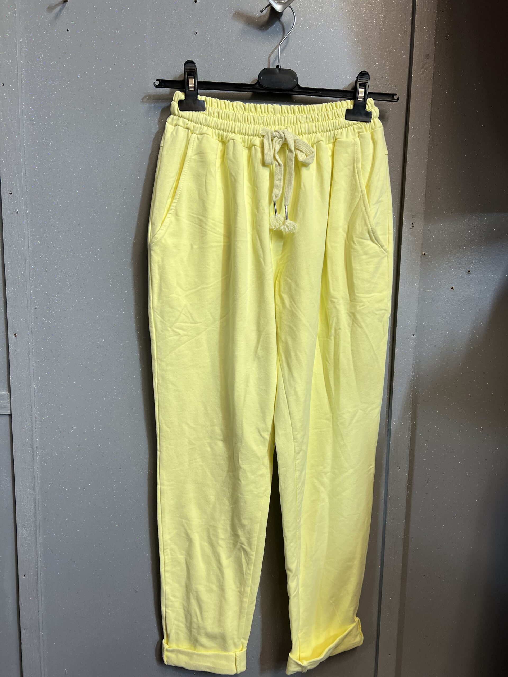 Spodnie bawełniane z prostymi nogawkami ,w cytrynowym kolorze dość głębokimi kieszeniami na przodzie . Góra zakończona szeroką gumą ze sznurkiem parcianym Idealne na co dzień i do pracy. Lekkie ,wygodne i delikatne.