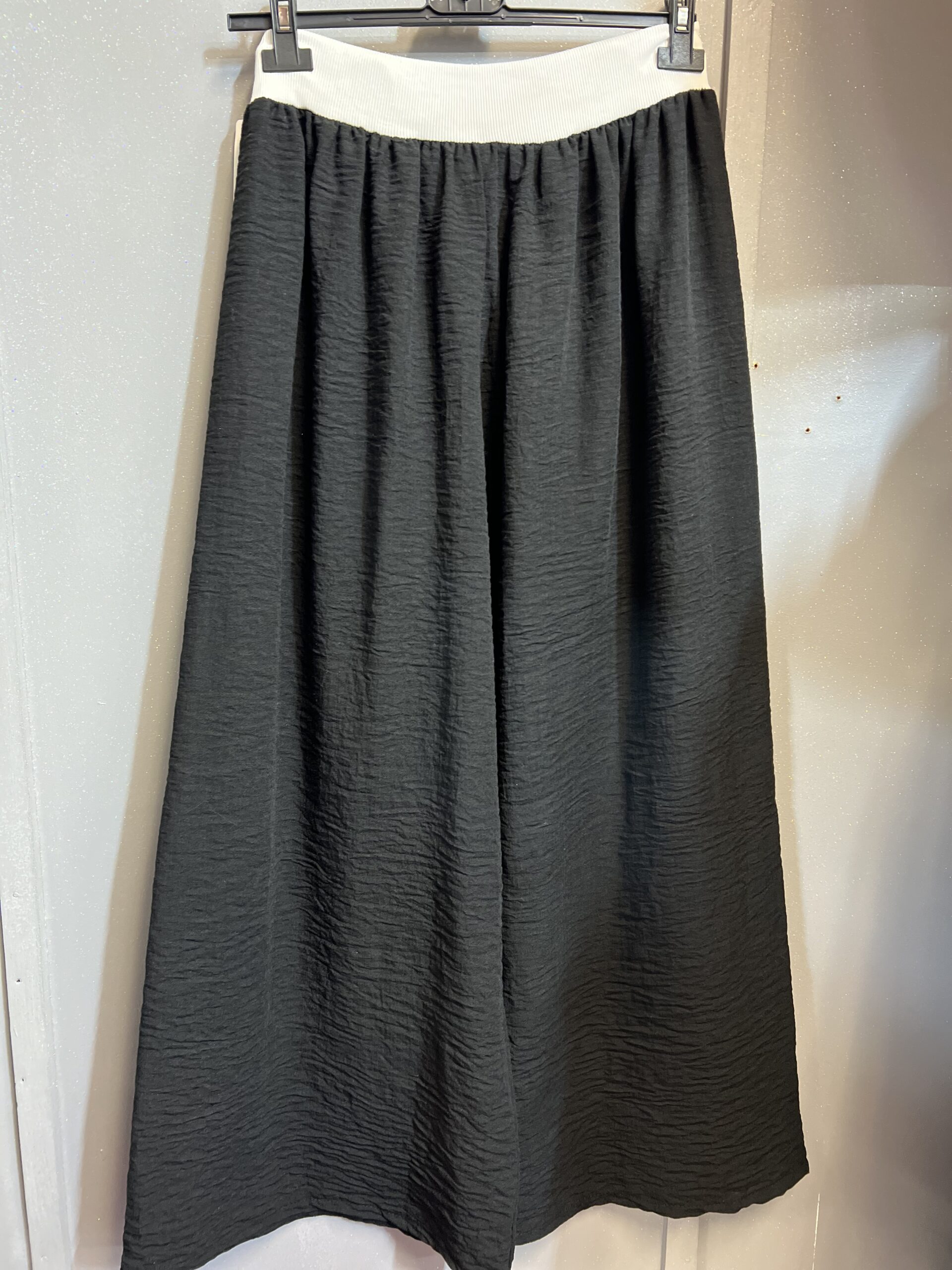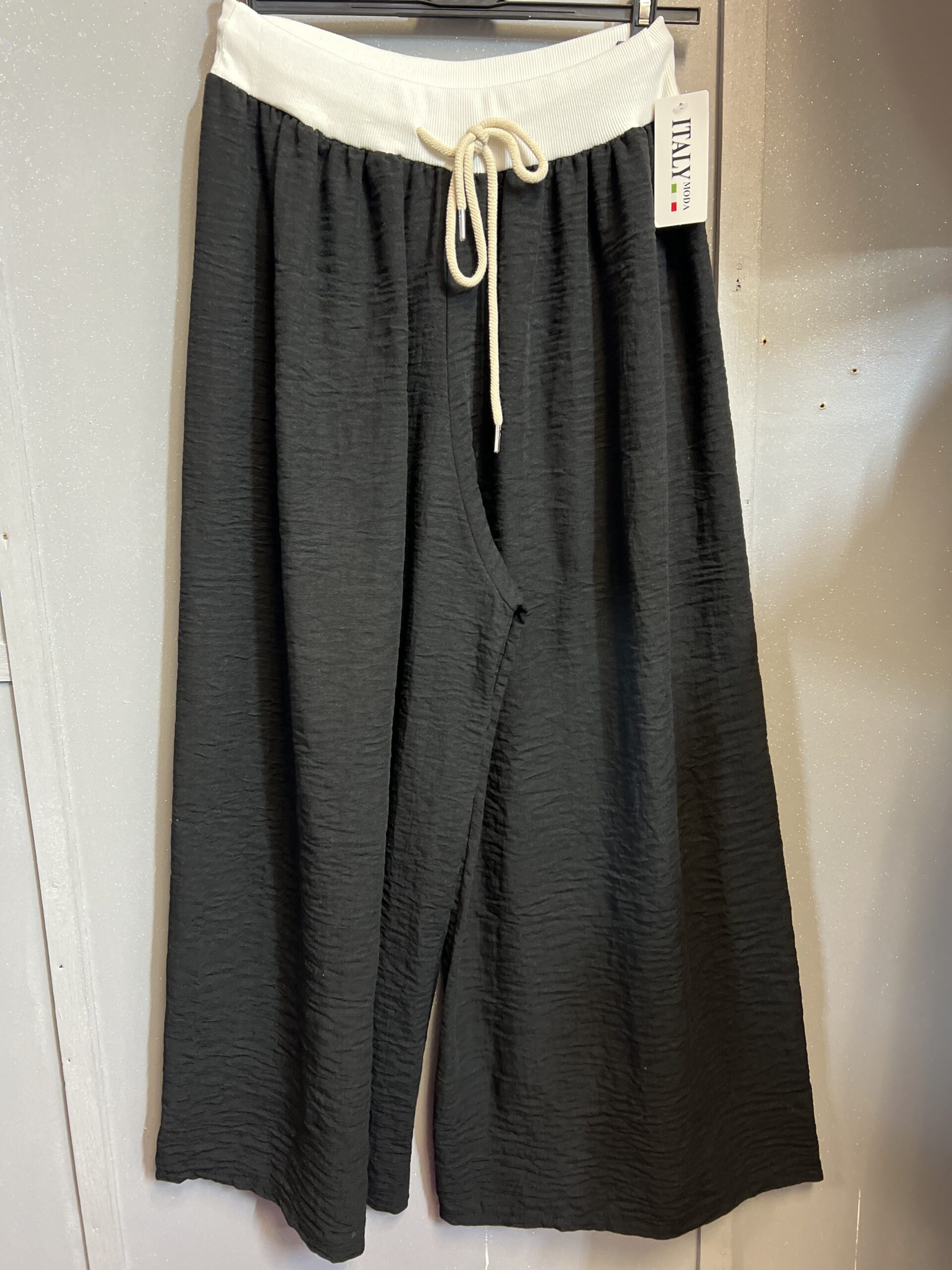 Spodnie lniane z szeroką nogawką w kolorze czerni. Góra spodni zakończona szerokim białym pasem z bawełny oraz sznurkiem. Tył gładki. Idealne na każdą okazję. Do pracy ,na co dzień .Elegancko i sportowo. Świetnie sprawdzą się do każdego obuwia.