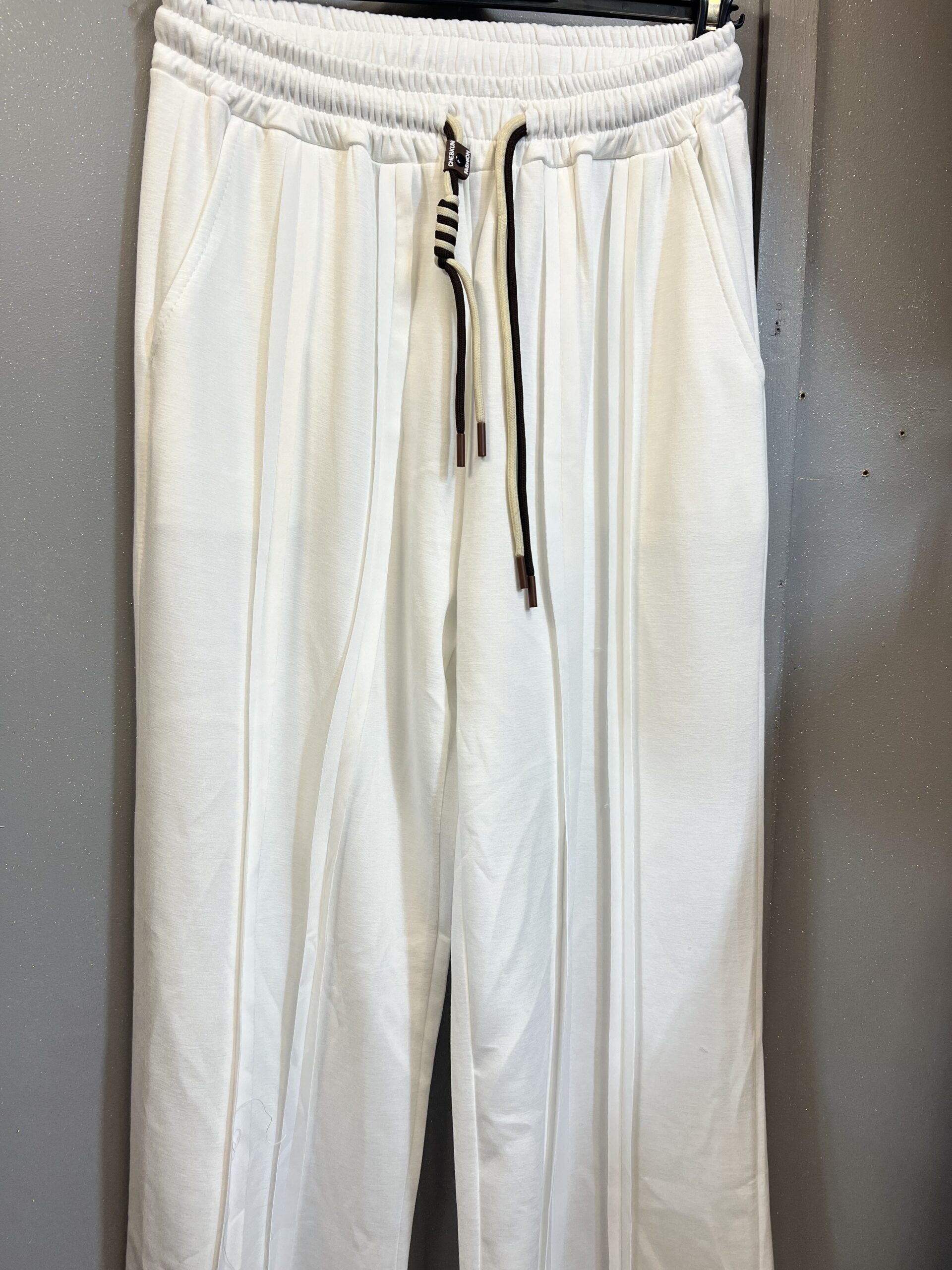 Spodnie w kolorze białym w pasie na ściągaczu w gumce i sznurek w odcieniu beżu i brązu. Dwie dość duże kieszenie oraz szerokie nogawki zdobione dwoma lampasami. Spodnie zwiewne wygodne , idealnie pasuje do bluzki oraz kurtki żakietowej tej samej serii dior z kwiatkiem zamieszonych na naszej stronie. Sprawdzi się świetnie na co dzień do pracy. Styl sportowy i elegancki.