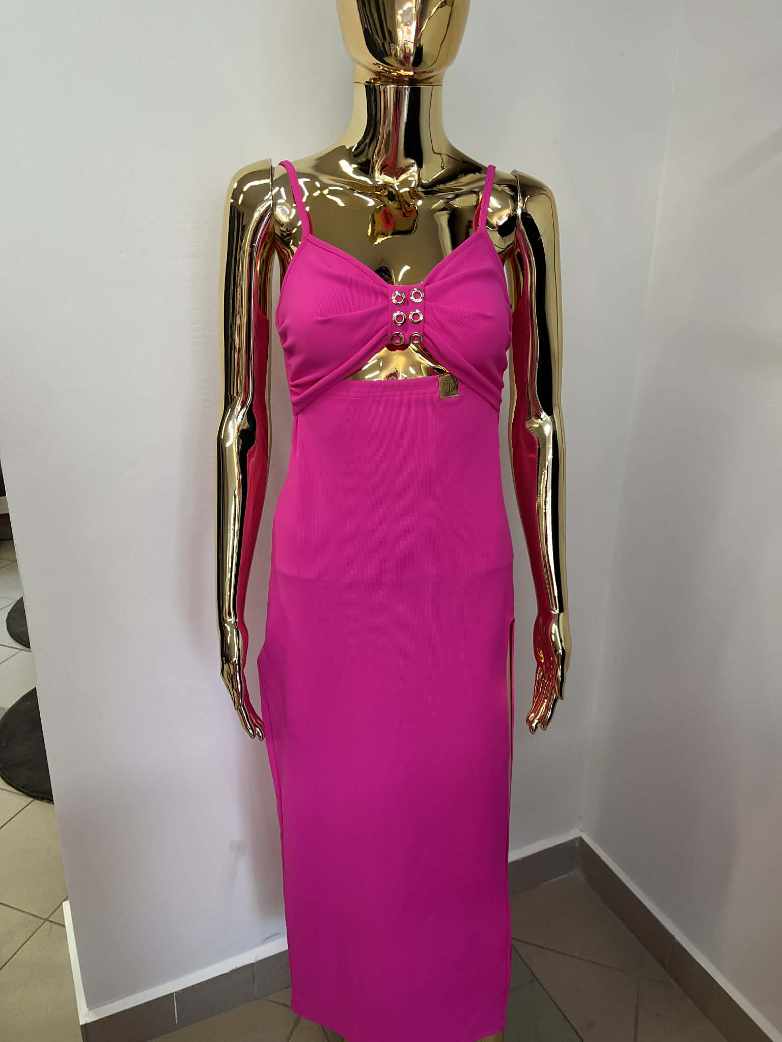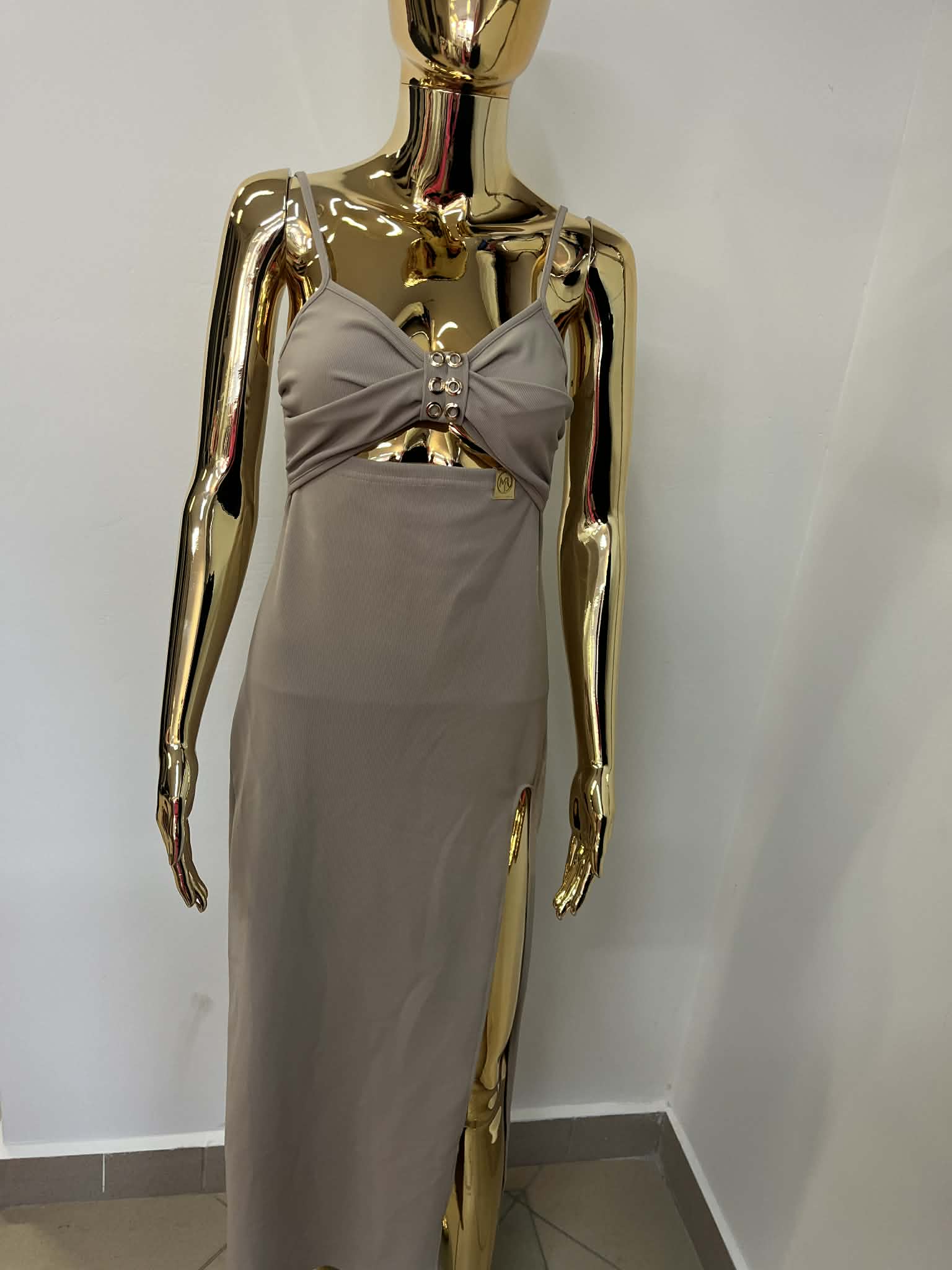 Sukienka fango prążek polskiego producenta Milla Rossi. Przód sukienki u góry na lekkie ,delikatne ramiączko z pięknym dekoltem stanikowym robionym na kokardkę. Na lewej stronie u dołu delikatny rozporek. Bardzo elegancka ,a za razem sportowa wersja .Idealna na każdą okazję.