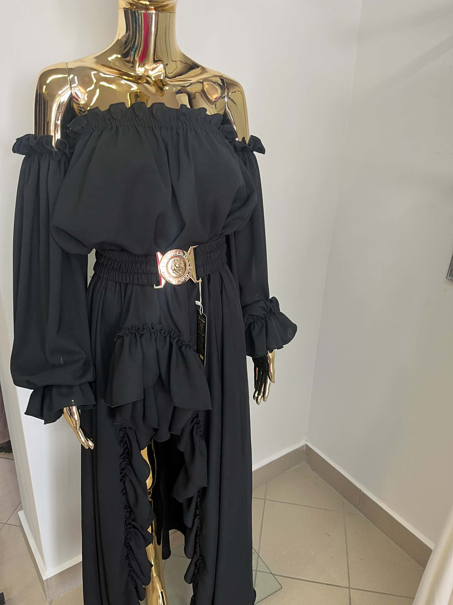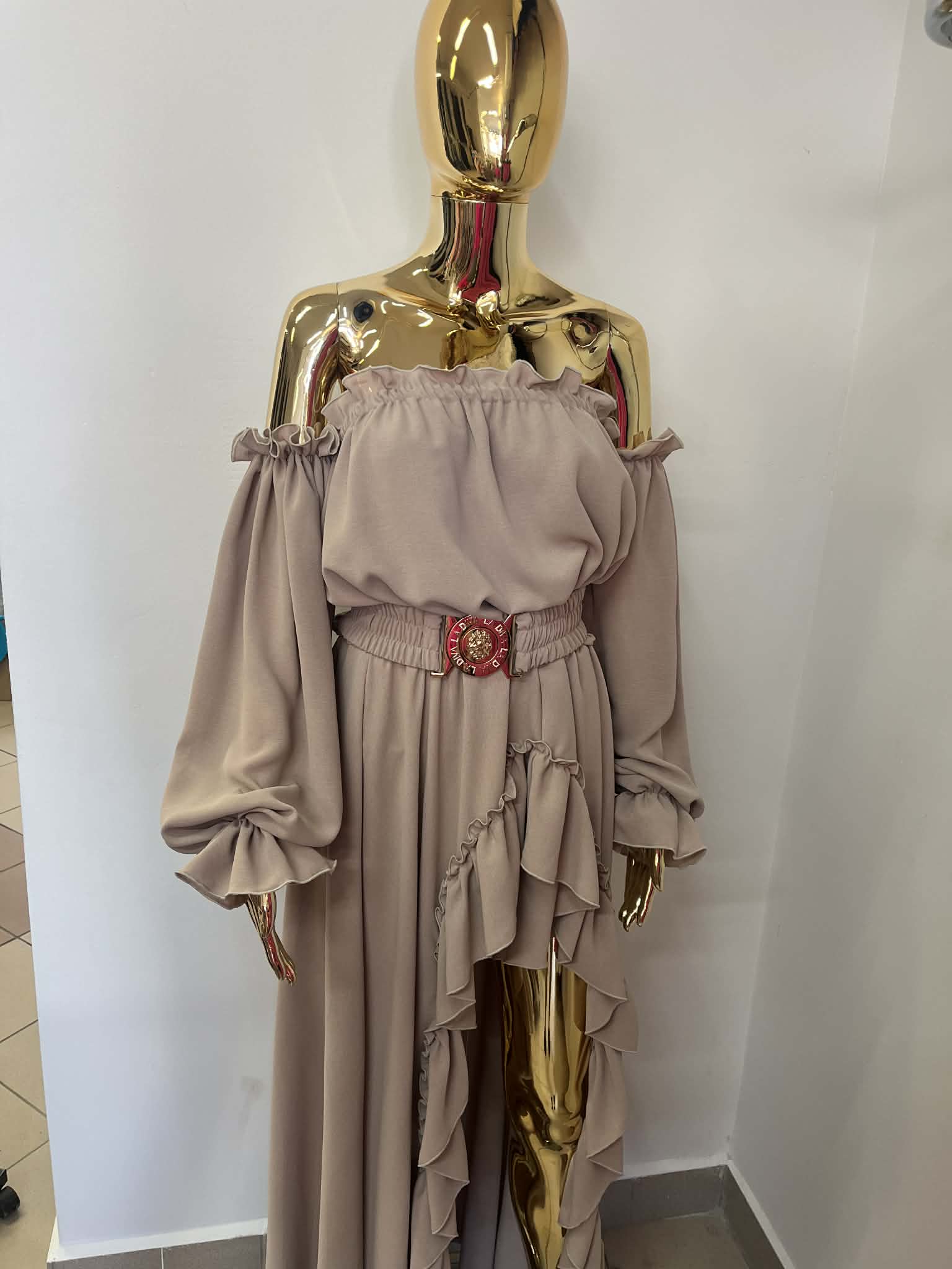 Długa sukienka hiszpanka ze spodenkami w pięknym beżowym kolorze. Z pięknym falbaniastym dołem .Można nosić na elegancko jak i na sportowo.