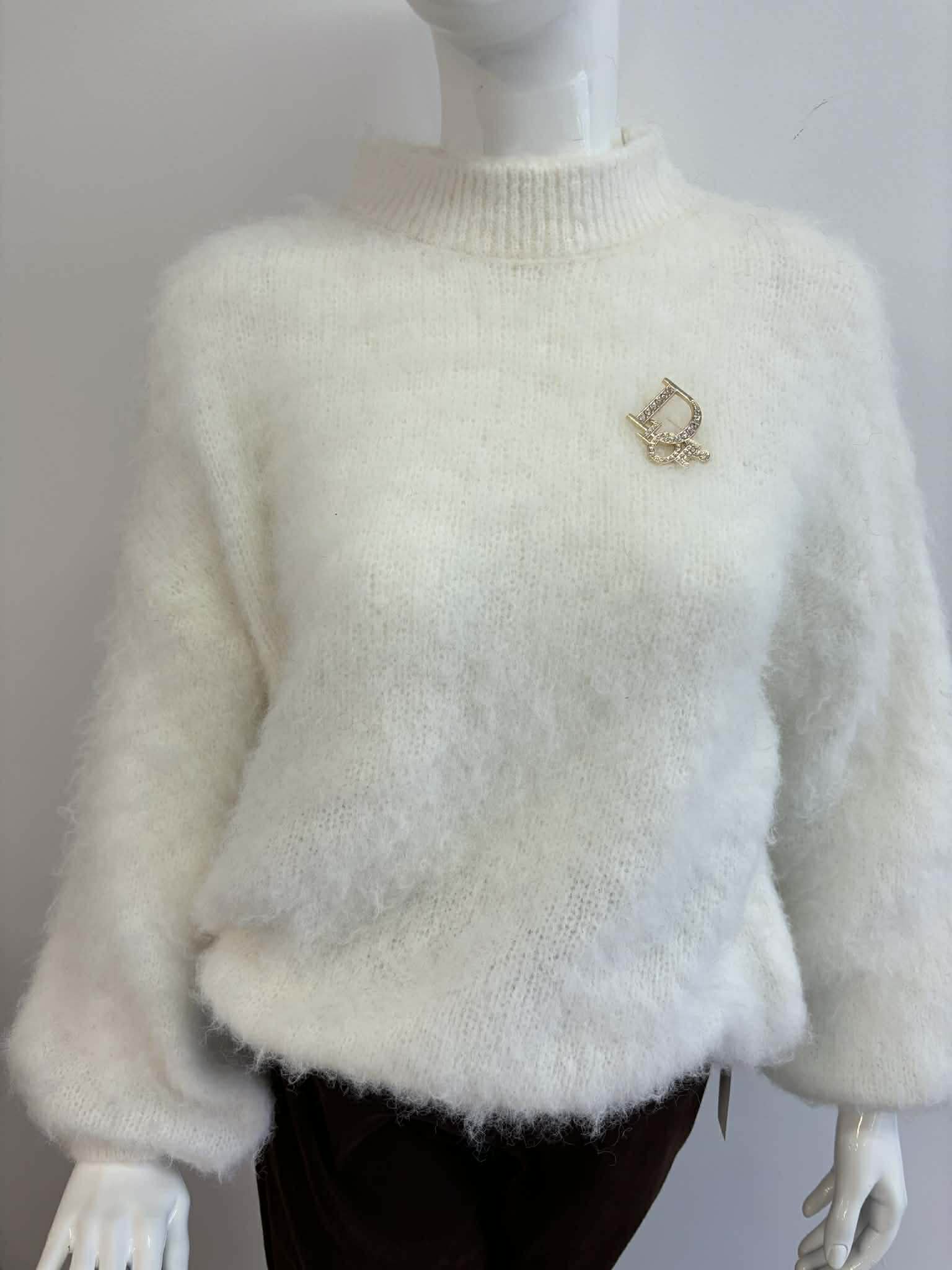 Sweterek alpaka bardzo ciepły w kolorze śmietanki ze złotą przypinką Dior. Idealnie sprawdzi się w zestawie ze spódnica czy spodniami .Na wyjścia do pracy jak i na co dzień.