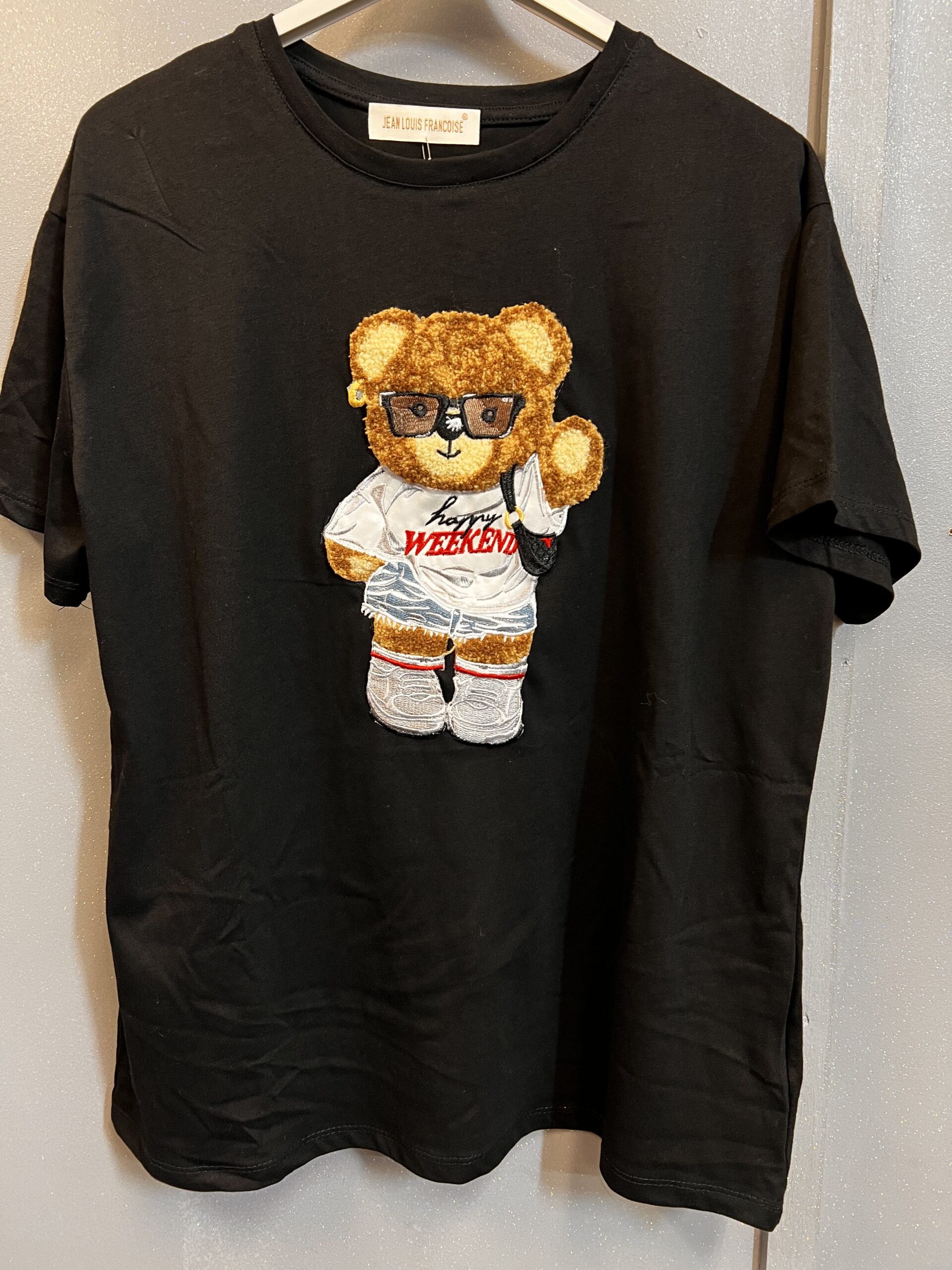 Koszulka w klasycznym czarnym kolorze z naszytym kolorowym misiem w białych skarpetach do kolan ,spodniach i koszulce z czerwonym napisem i okularach. Przez ramię przewieszoną czarną torebką. Koszulka jest z dobrej jakości bawełny. Idealna na co dzień do spodni i spódnicy , świetnie komponuje się z trampkami. Tył koszulki jest gładki.