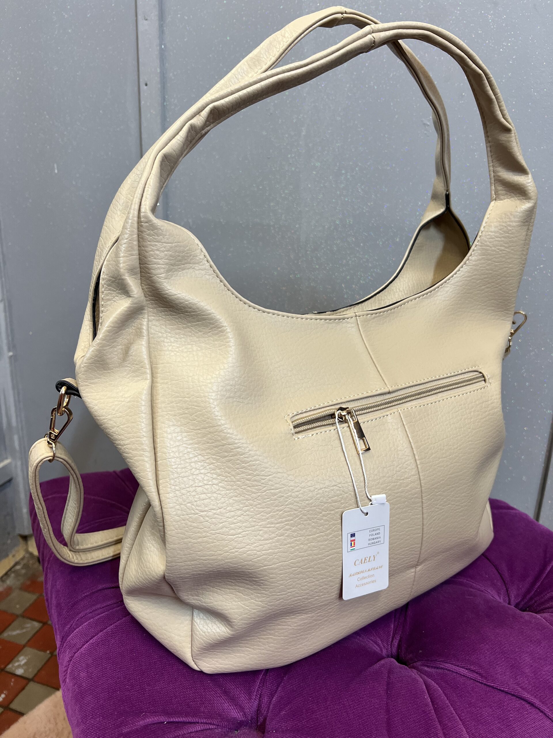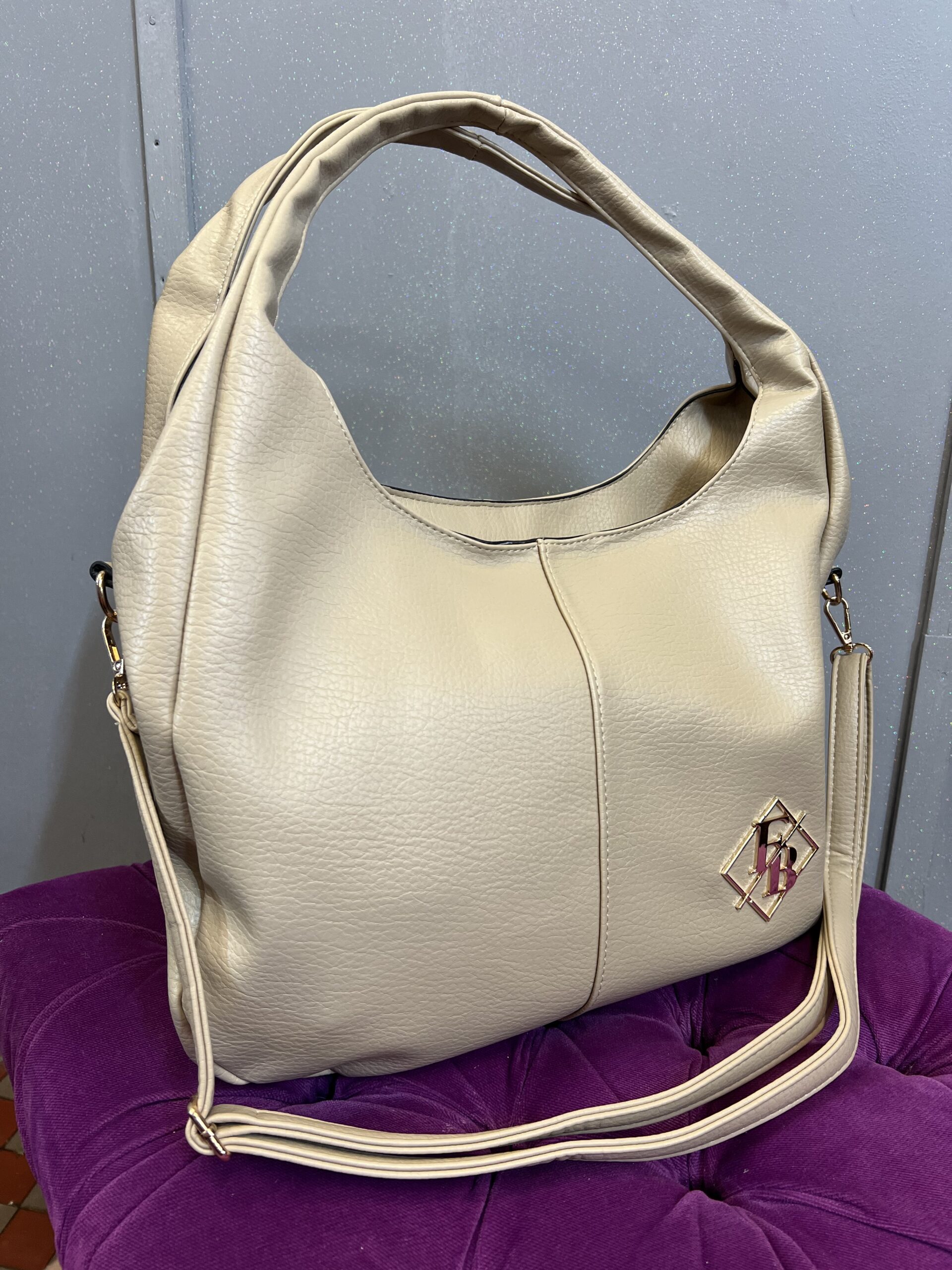 Duża torebka w kolorze beżowym mieszcząca format A4. Torebka ma jedna główną komorę zamykaną na zamek. Rączki są bezpośrednio przymocowane do części torebki ,dzięki czemu mamy pewność ,że się nie urwą. Dodatkowo jest podpięty długi regulowany pasek .Na tyle torebki znajduje się dość spora kieszonka zapinana na zamek.